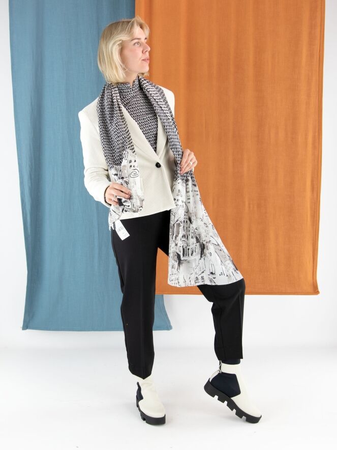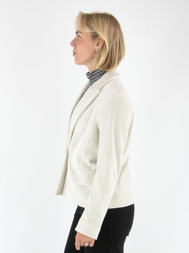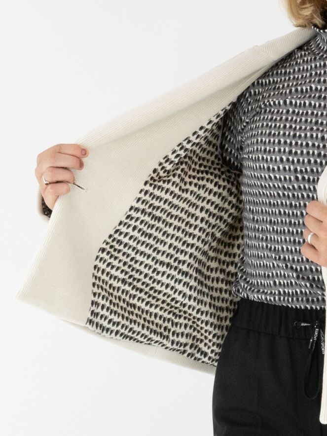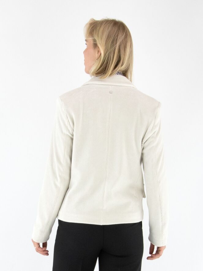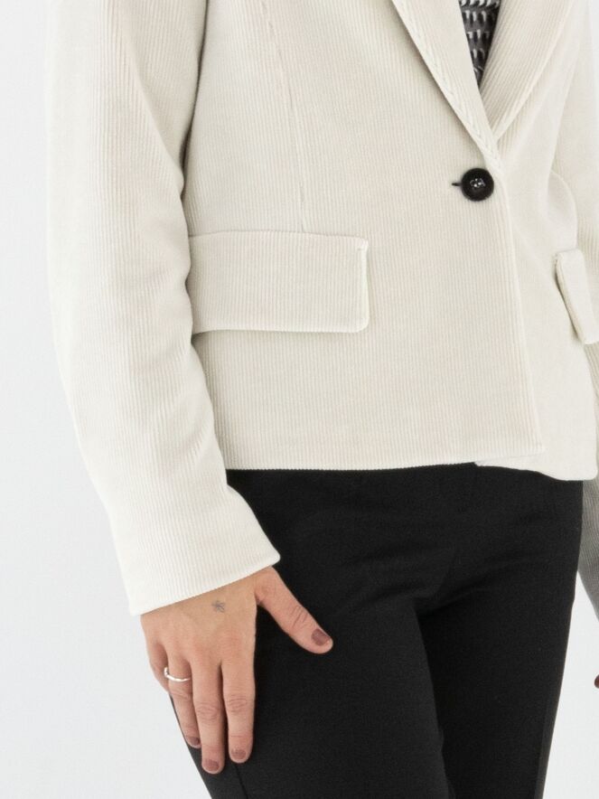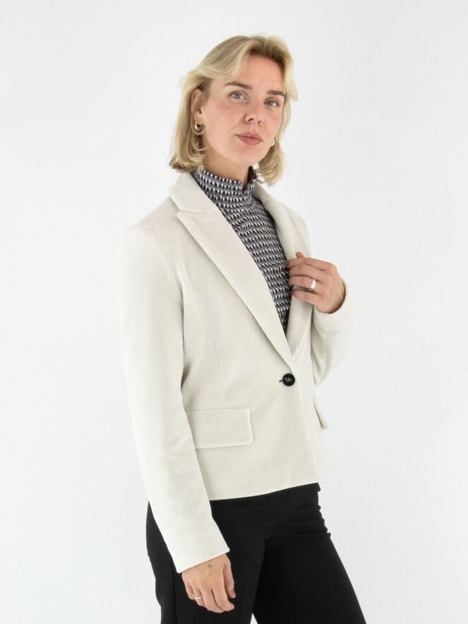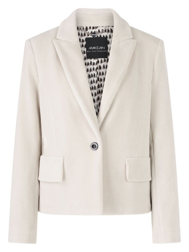 Un blazer en velours côtelé de Marc Cain dans une douce teinte beige. Il se ferme par un seul bouton et présente une doublure intérieure à imprimé pois ludique, qui apporte une touche de fantaisie. Ce blazer peut être lavé à 30 degrés.
