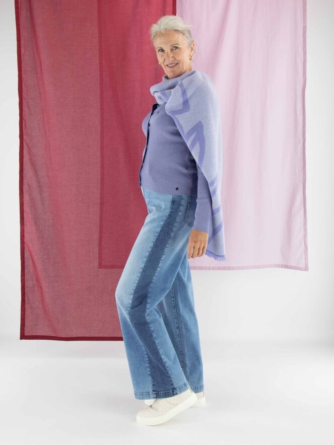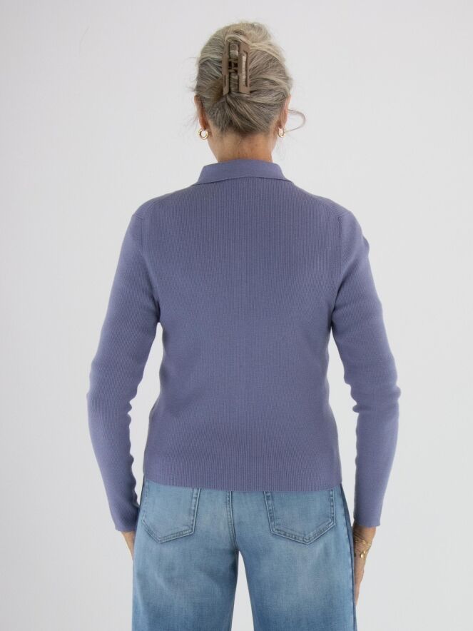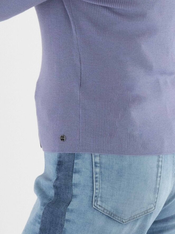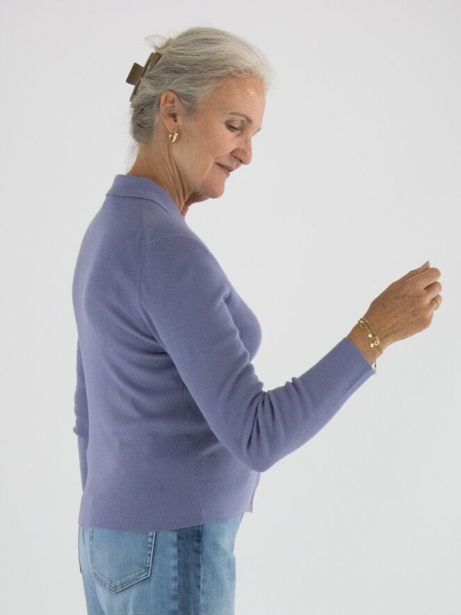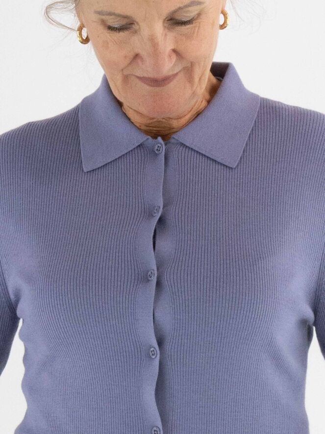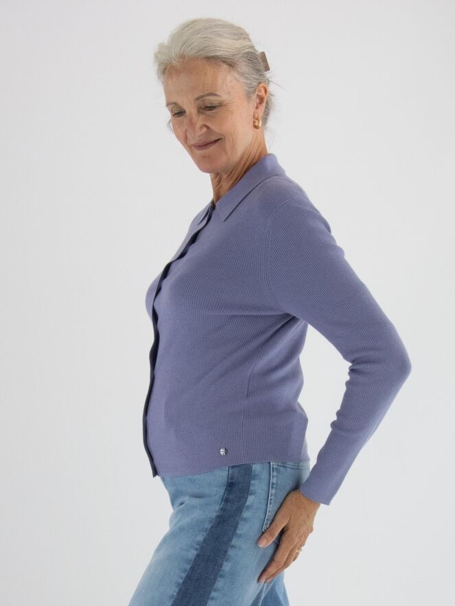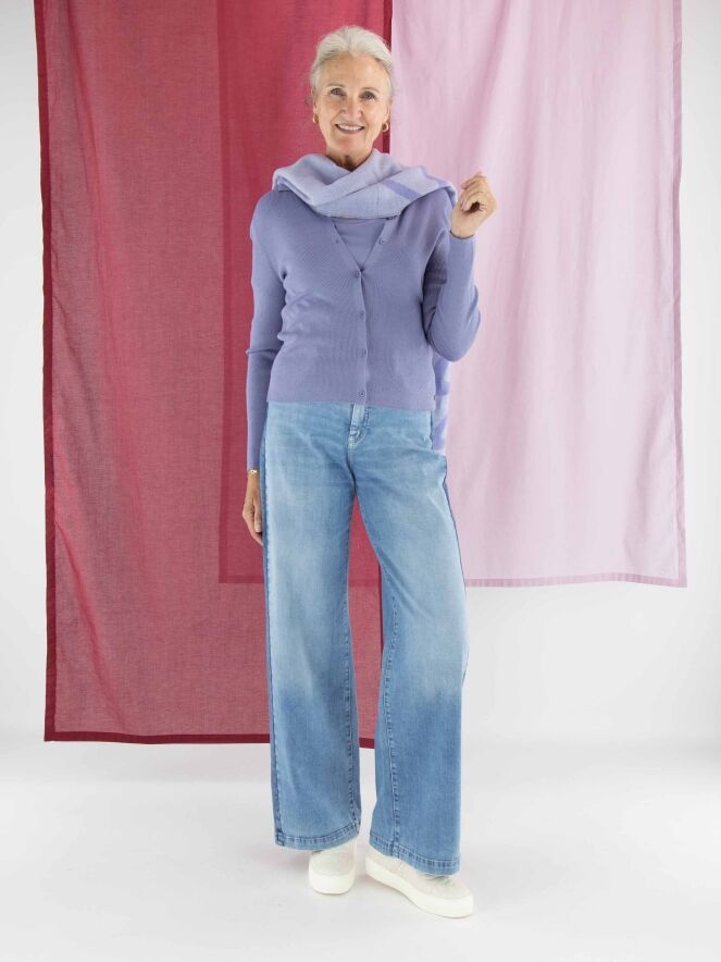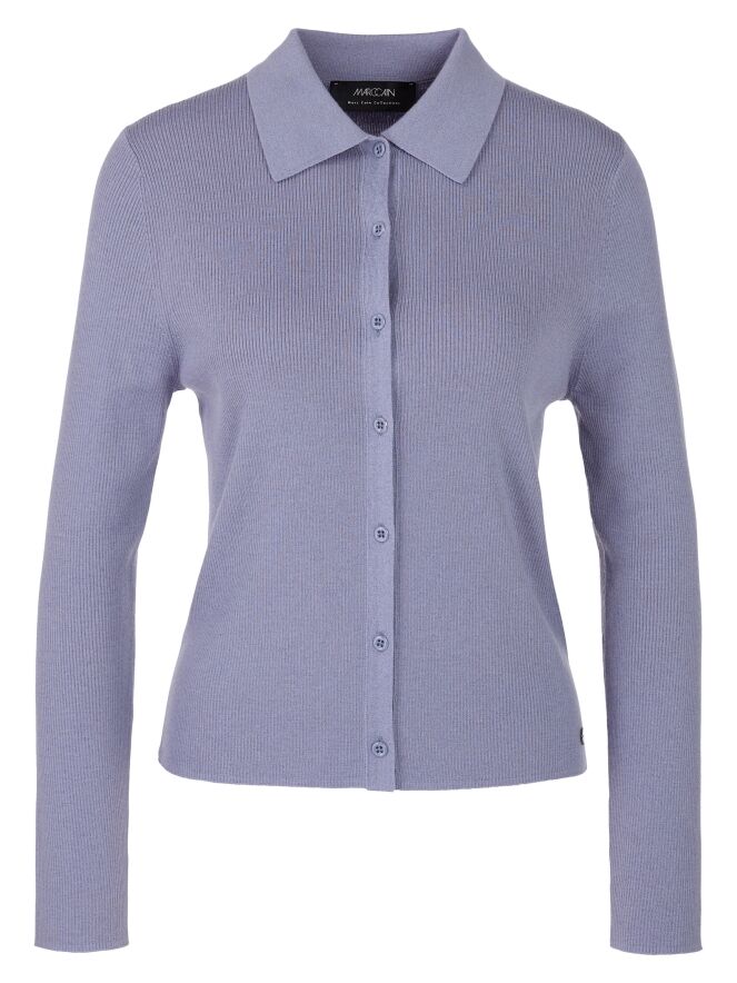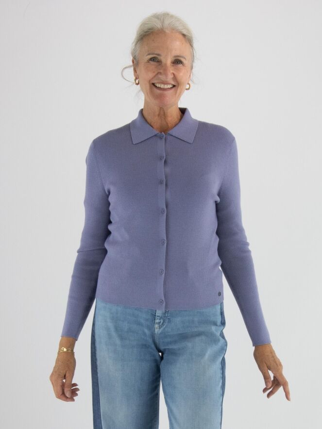 Gilet Marc Cain en maille finement côtelée dans une teinte lilas. Ce gilet est doté d’un col et d’une fermeture boutonnée. Ce modèle doit être lavé à la main.