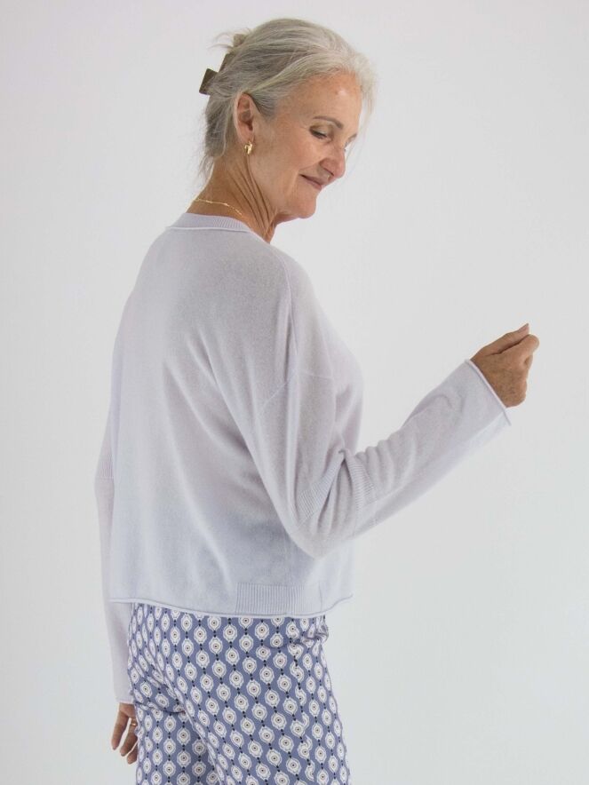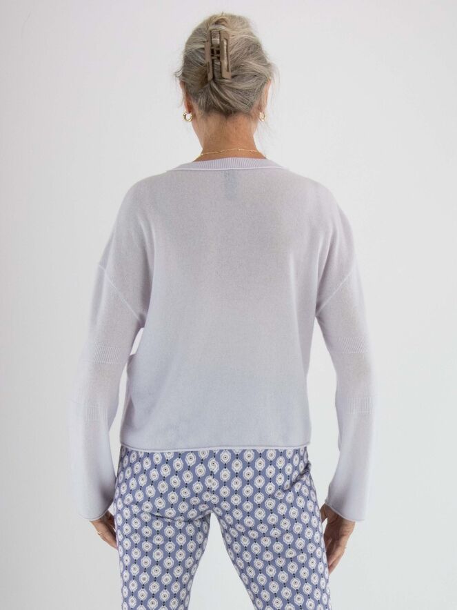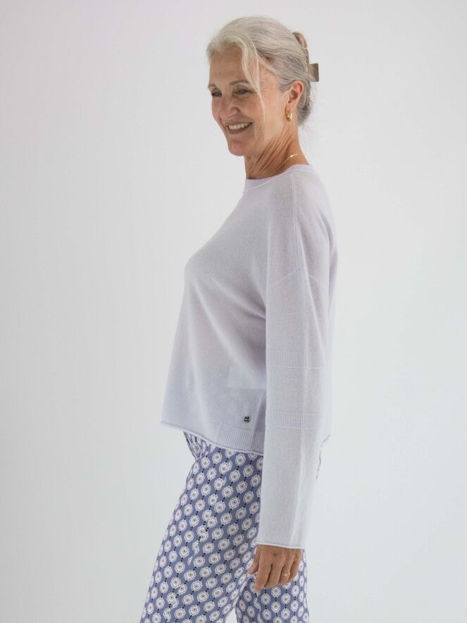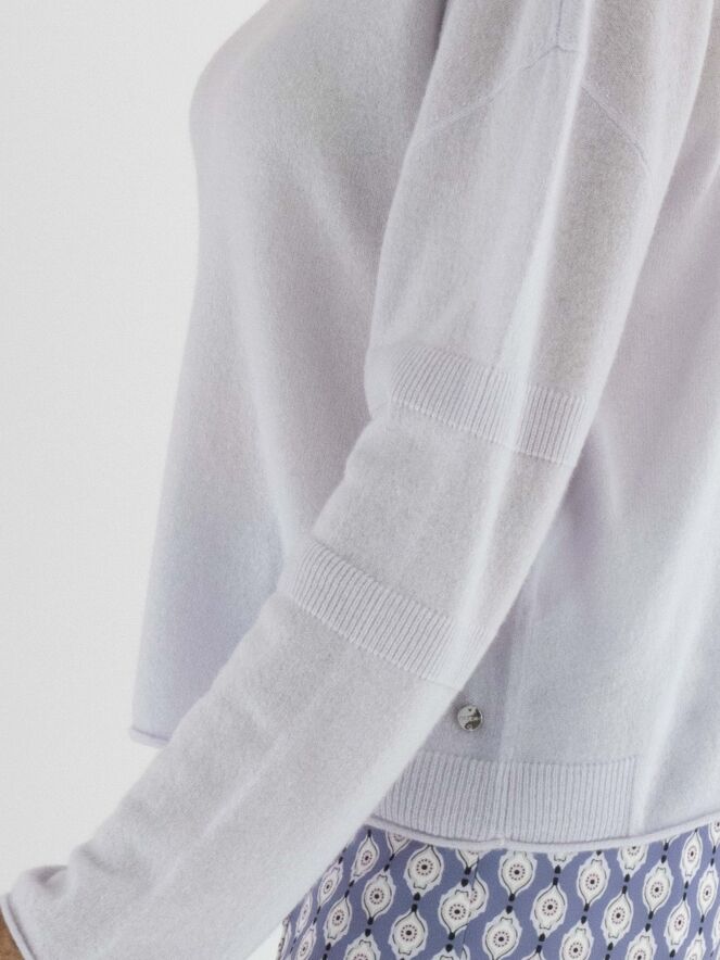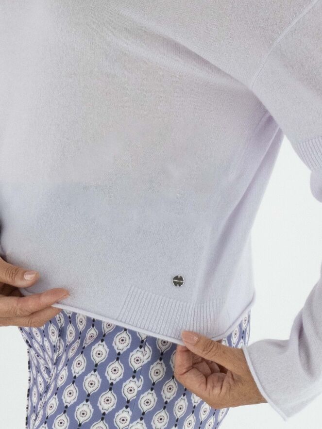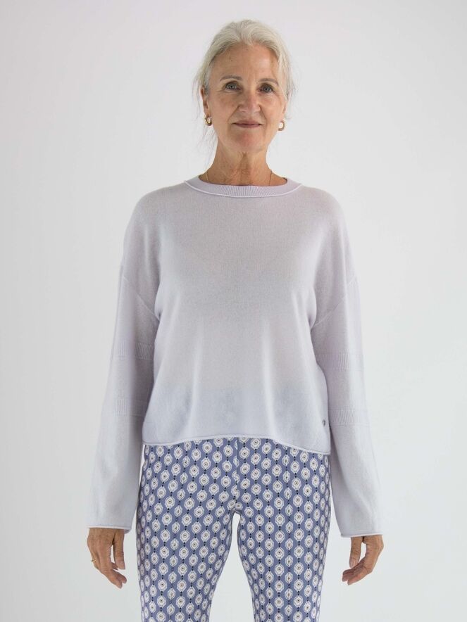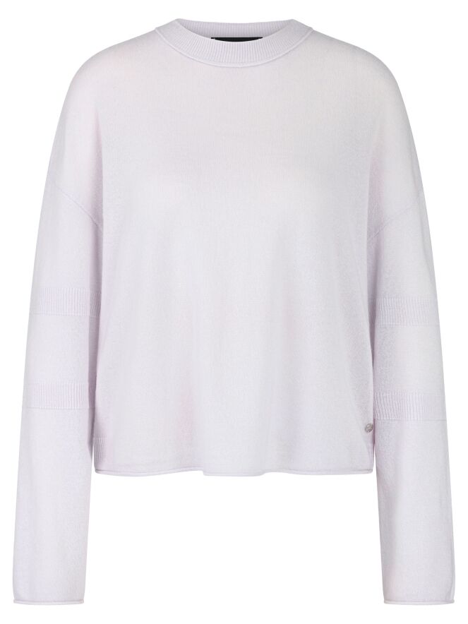 Pull Marc Cain dans une teinte lilas pastel. Ce modèle présente un col rond et des manches longues. Juste au-dessus et en dessous du coude, une bordure en maille finement côtelée est intégrée. Ce pull doit être lavé à la main.