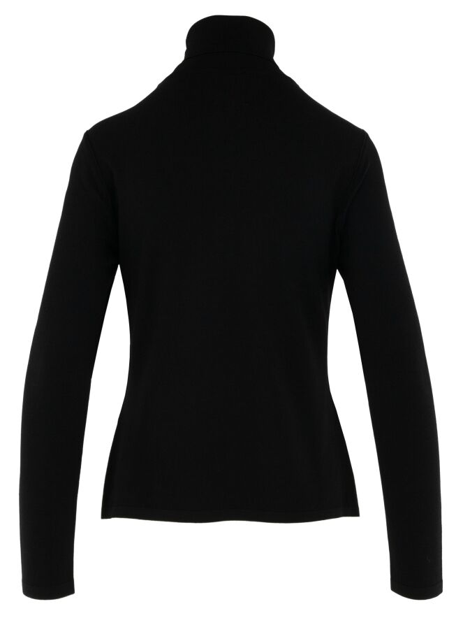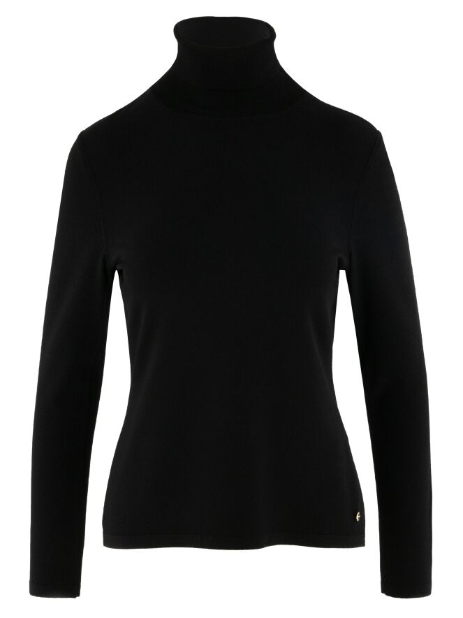 Un pull finement tricoté de Marc Cain en noir. Le col roulé tombant est finement côtelé et le pull a des manches longues. Ce pull peut être lavé à 30 degrés.