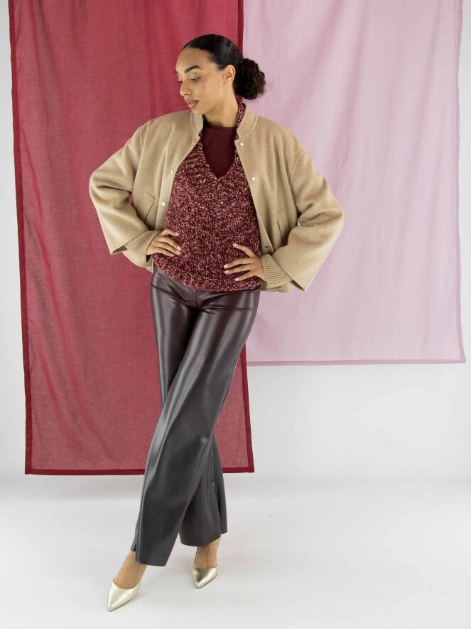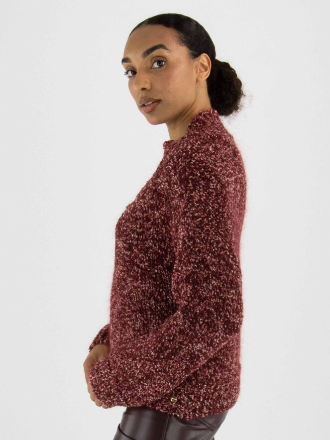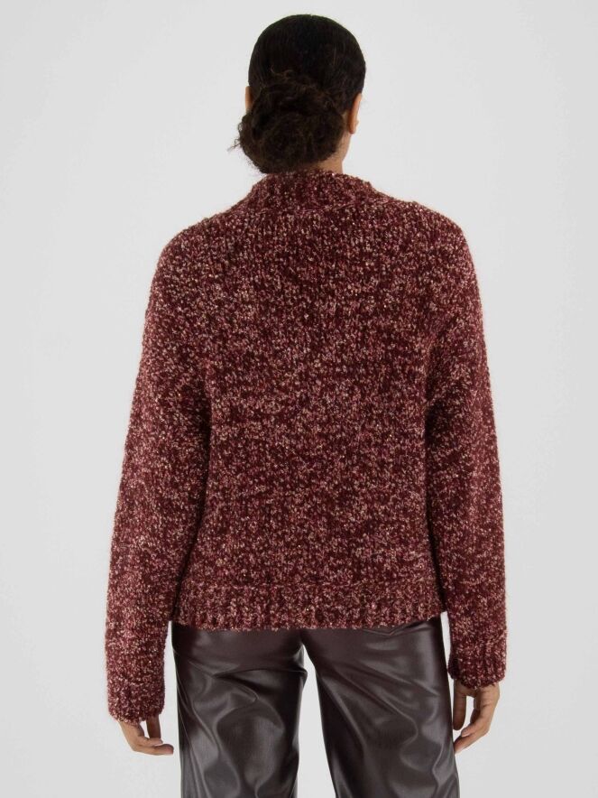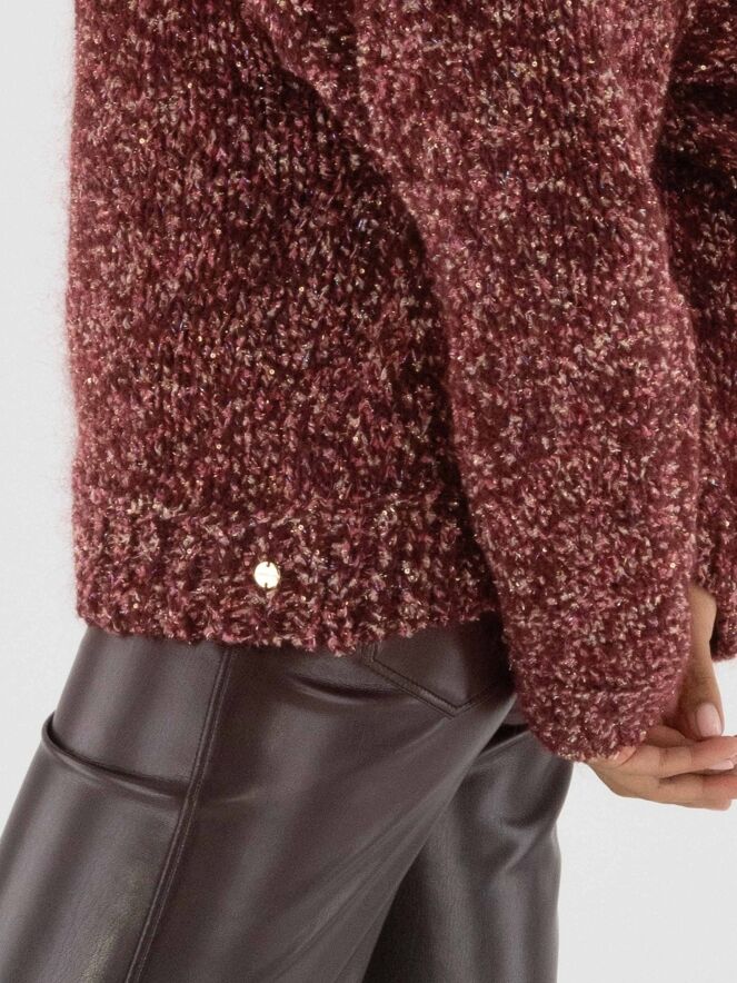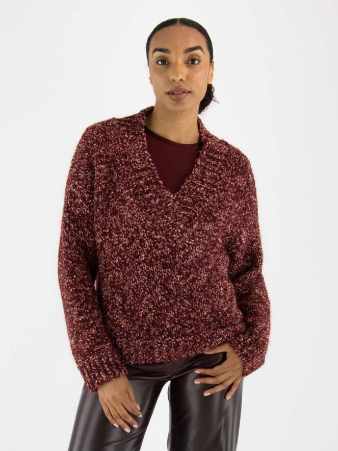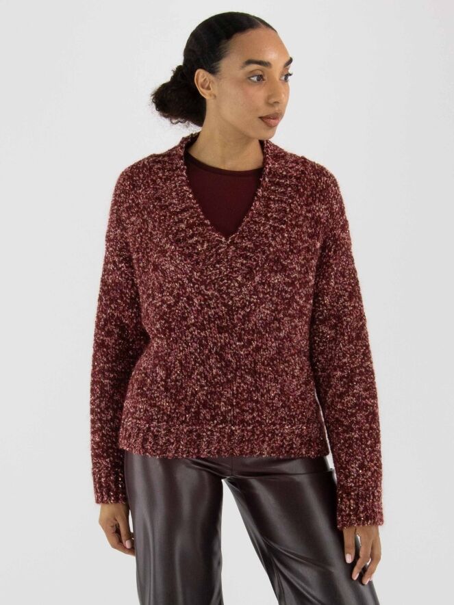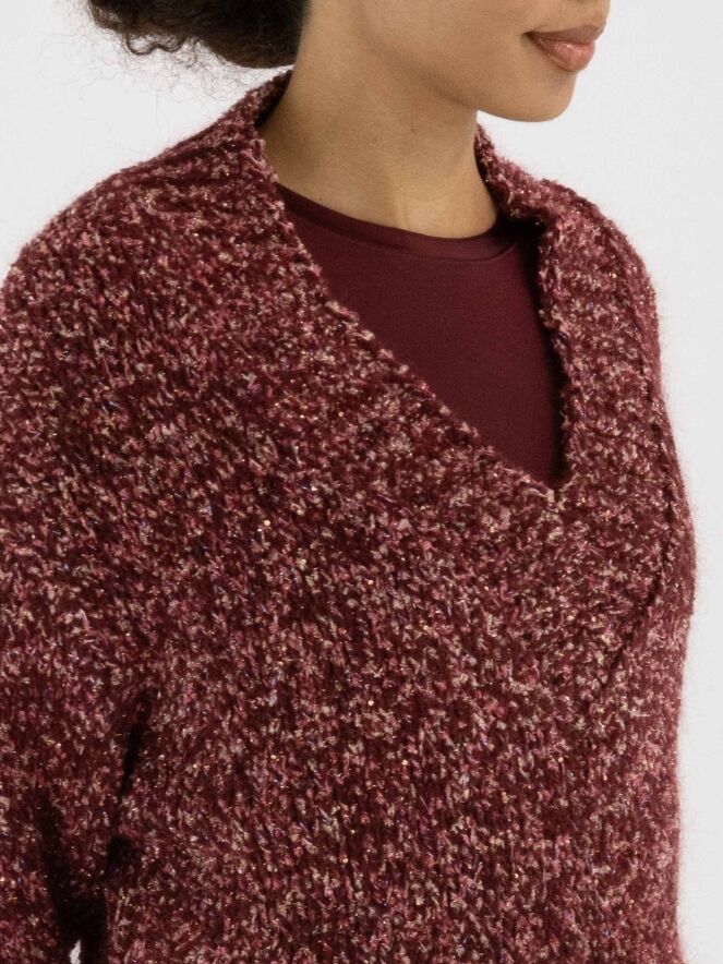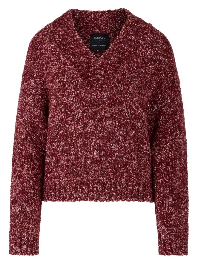 Pull chiné luxueux de Marc Cain dans différentes nuances de rouge avec du blanc cassé. Un fil doré est tissé dans le tissu. Le pull présente un col en V et des manches longues. Lavage à la main uniquement.