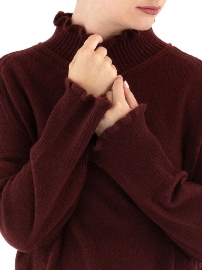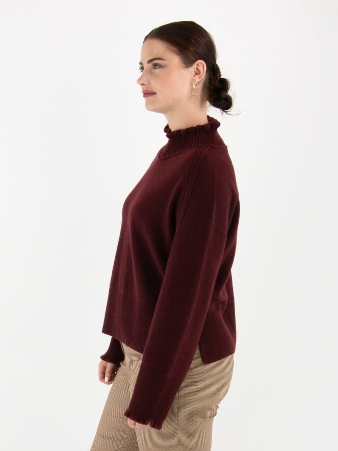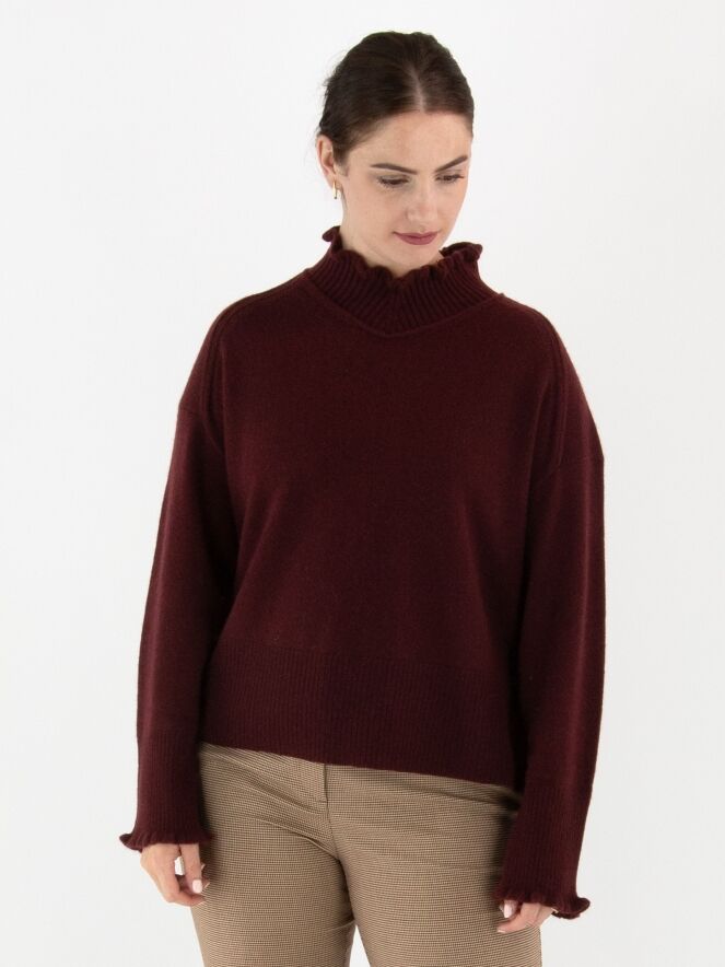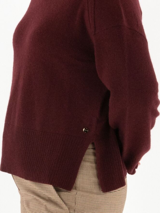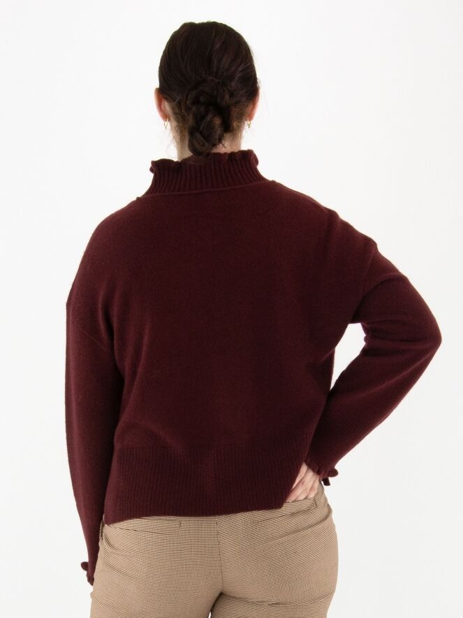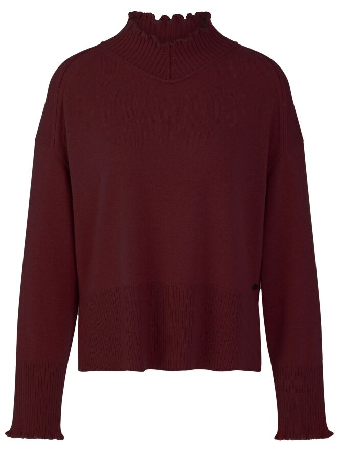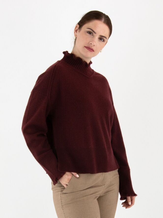 Un pull Marc Cain de couleur bordeaux. Il présente un col roulé ample avec un large bord côtelé. Les poignets sont smockés et le bas est fini par une large bande côtelée. Ce pull doit être lavé à la main.