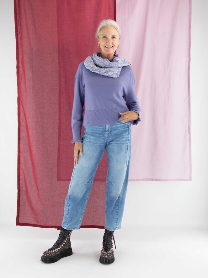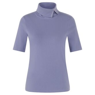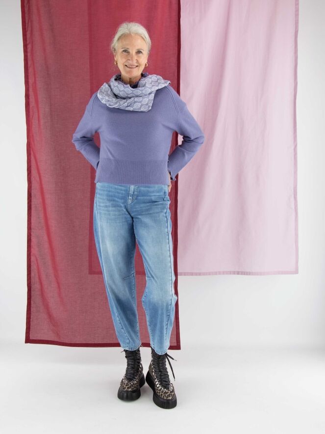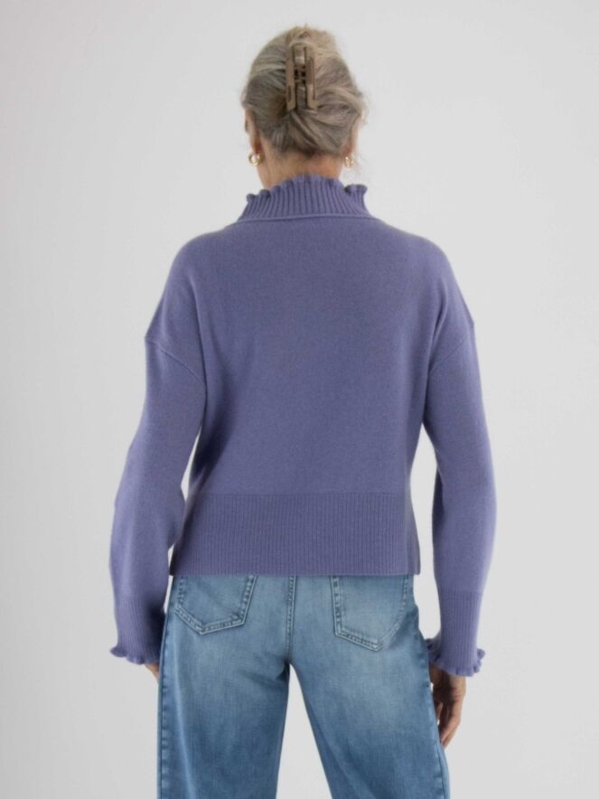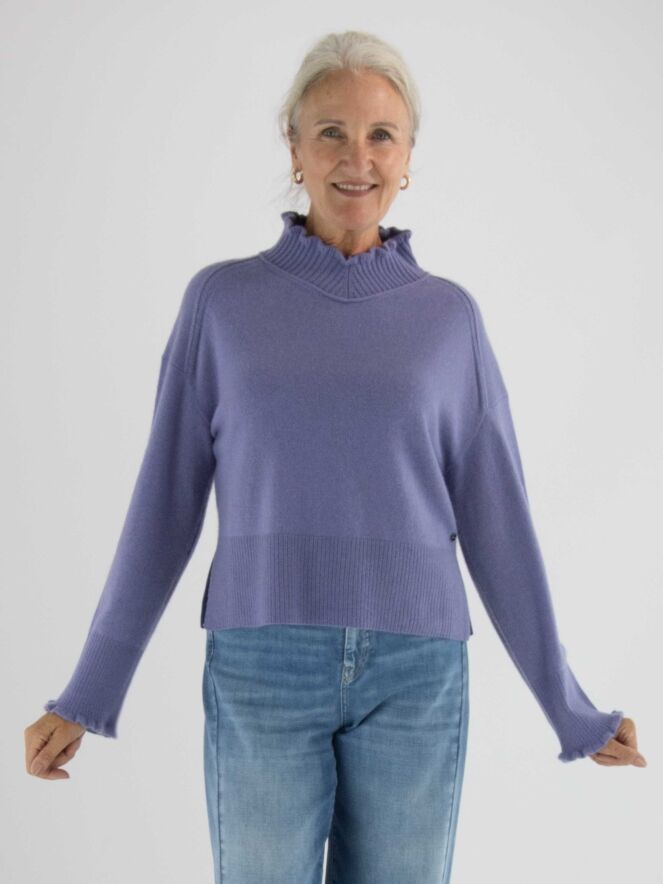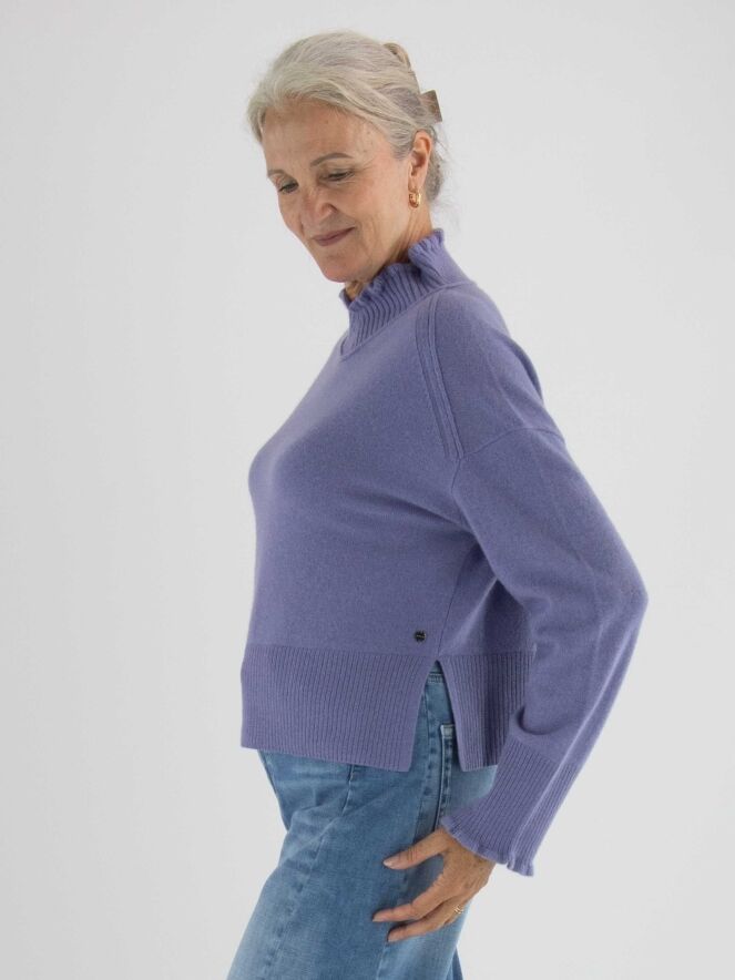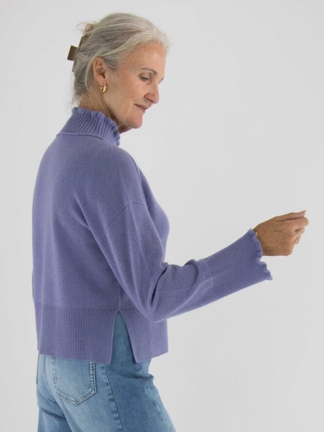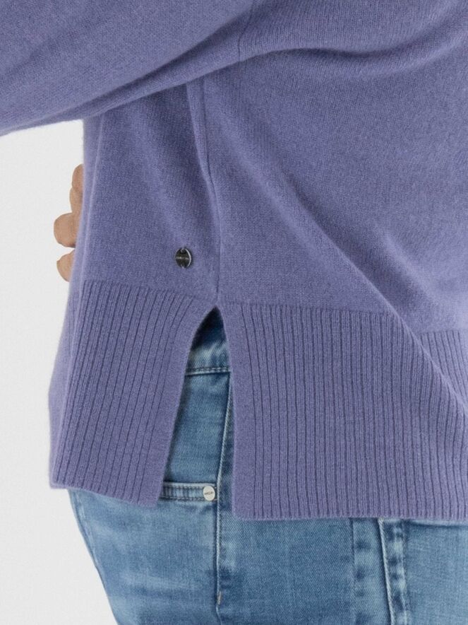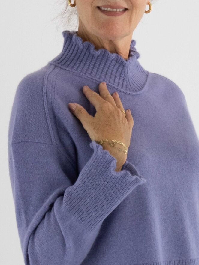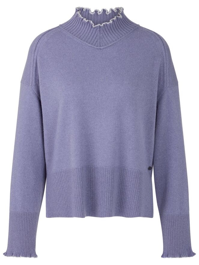 Pull Marc Cain dans une teinte lilas. Ce modèle présente un col roulé ample à large bord côte. Les poignets des manches longues sont smockés. Une large bordure côtelée termine le bas du pull. Ce modèle se lave à la main.