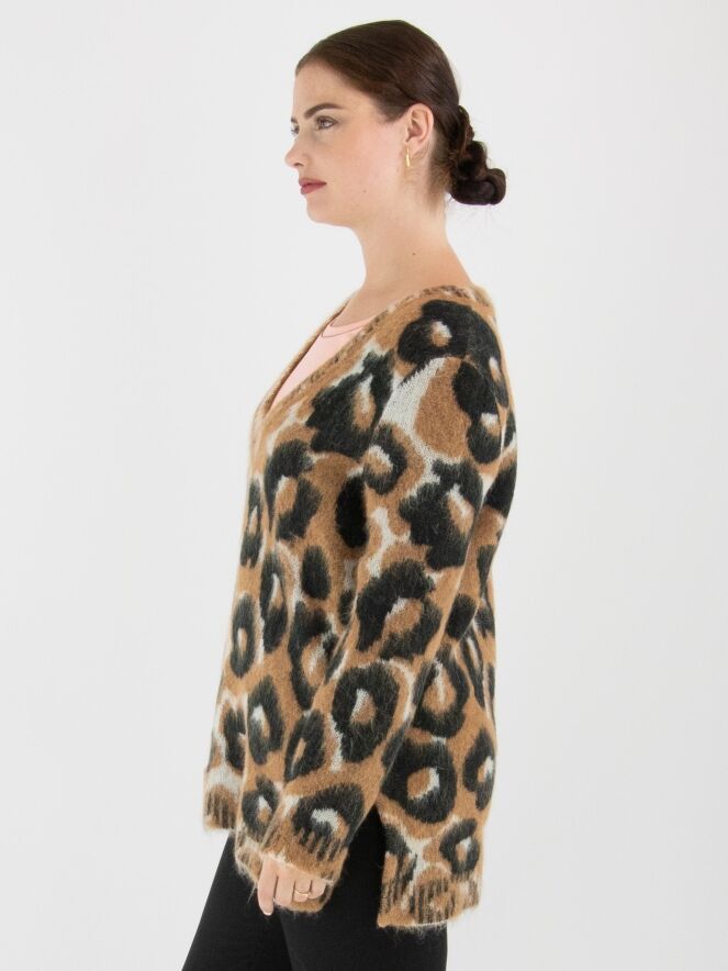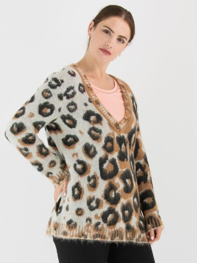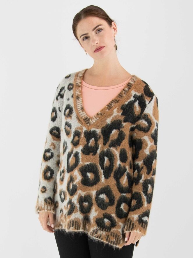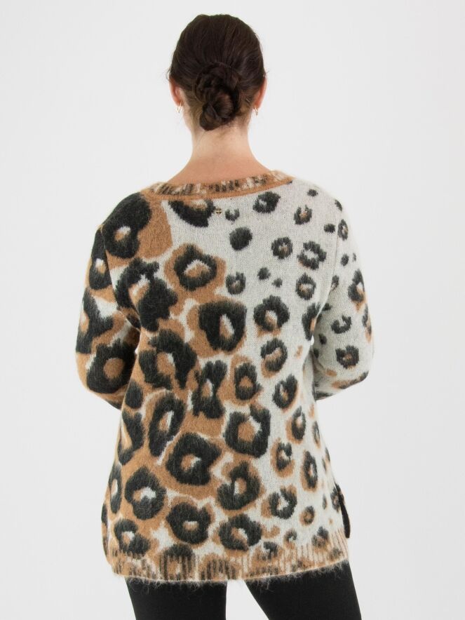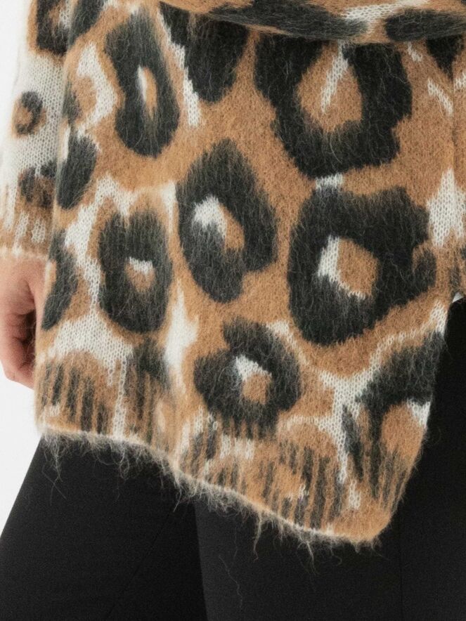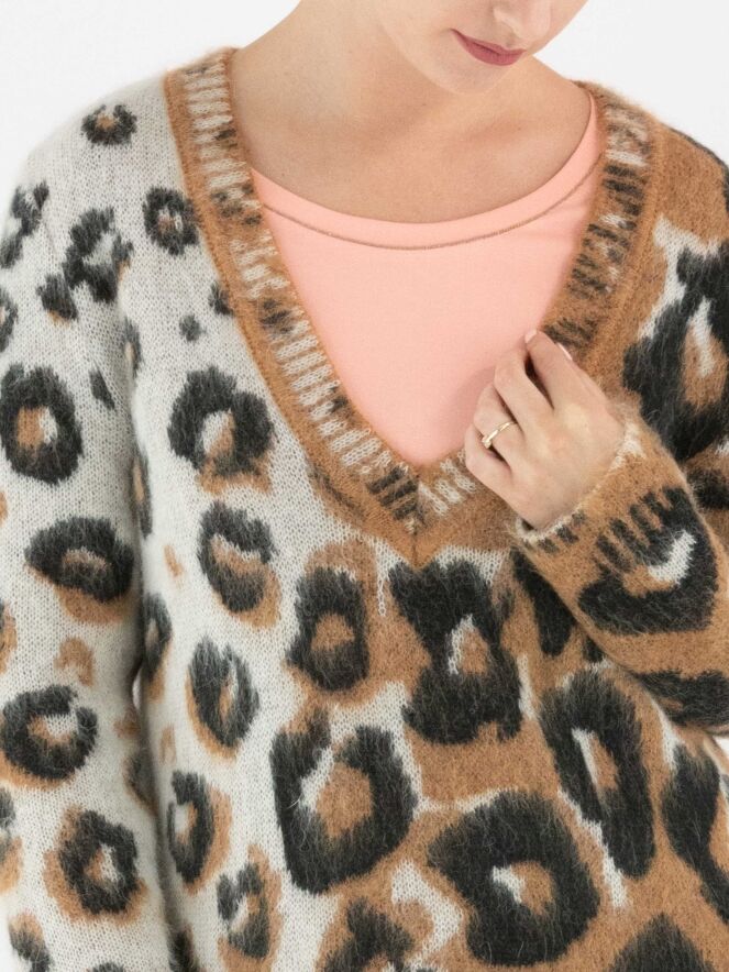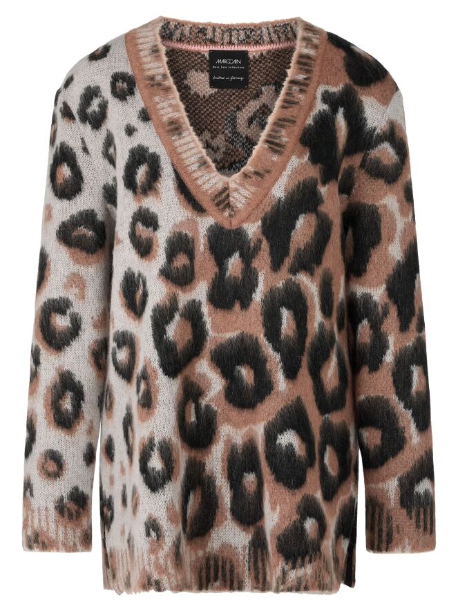 Un pull luxueux de Marc Cain à imprimé léopard dans les tons cognac, noir et beige. Le profond col en V est bordé d’une finition côtelée. Ce pull doit être lavé à la main.