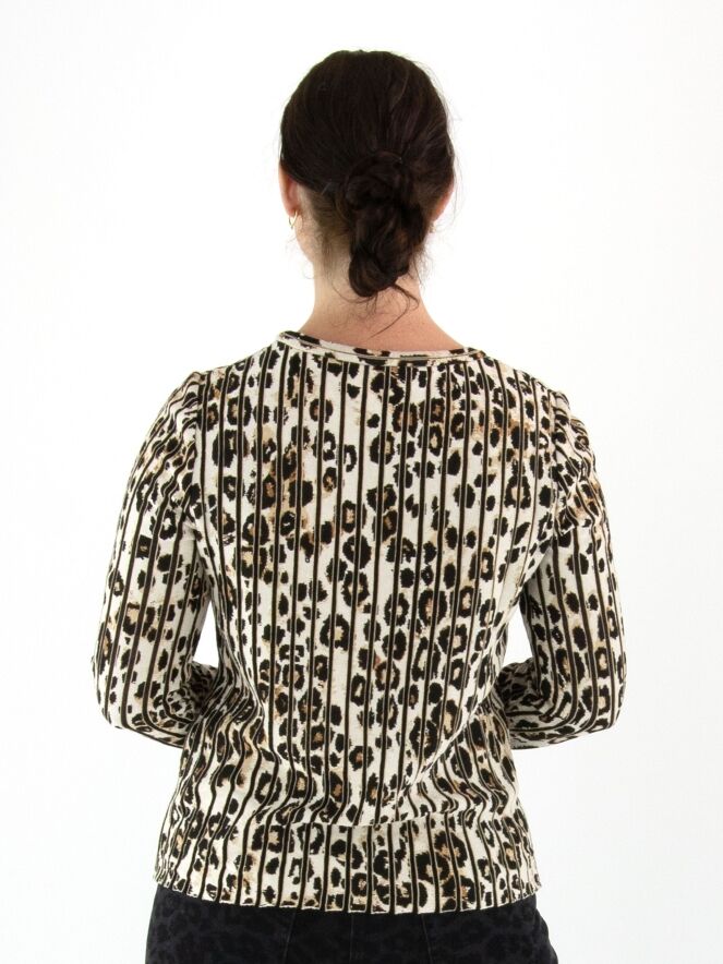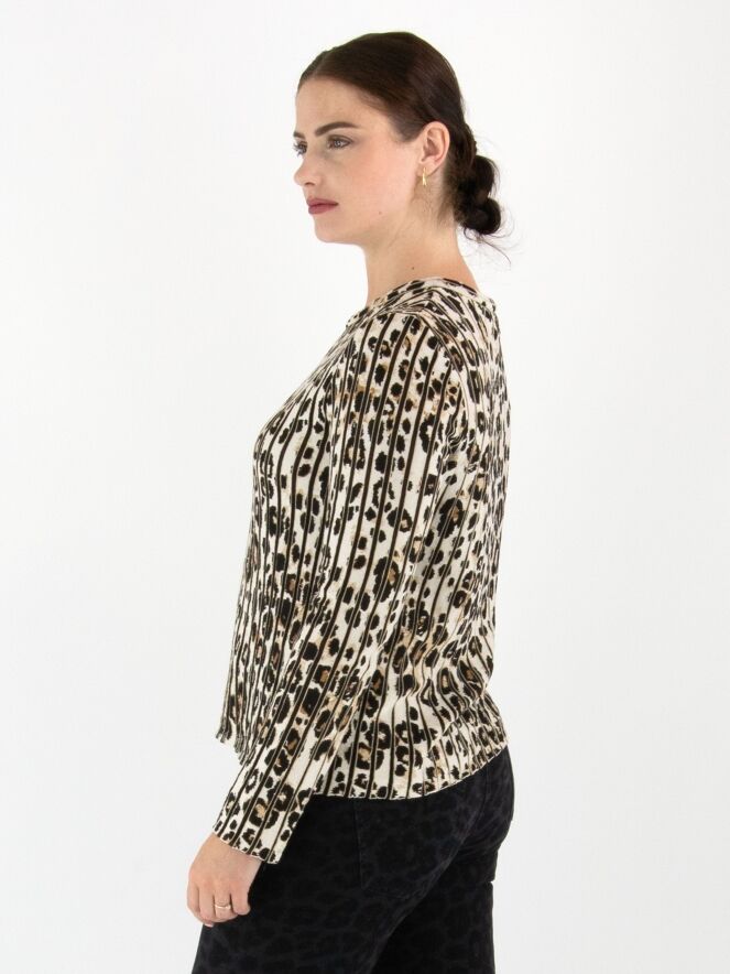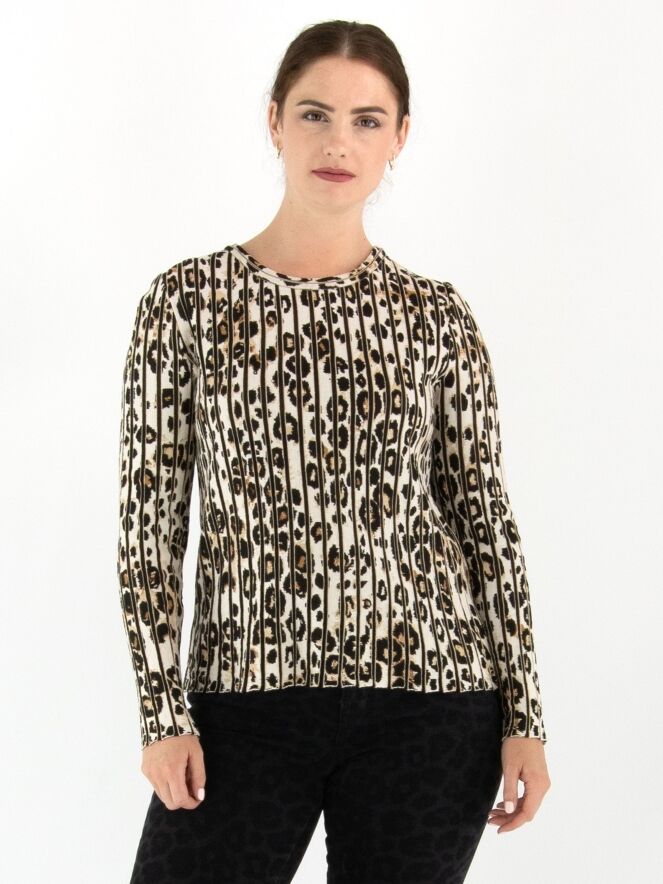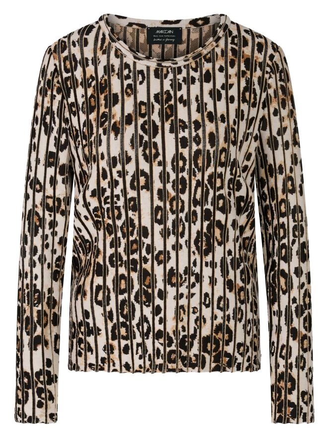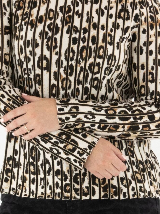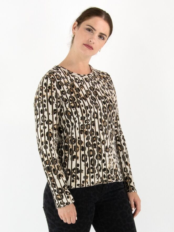 Un pull de Marc Cain avec un imprimé léopard dans plusieurs nuances de brun et de noir sur un fond couleur sable. L’imprimé est structuré par des rayures verticales noires. Le pull a un col rond et des manches longues. Ce pull peut être lavé à 30 degrés.