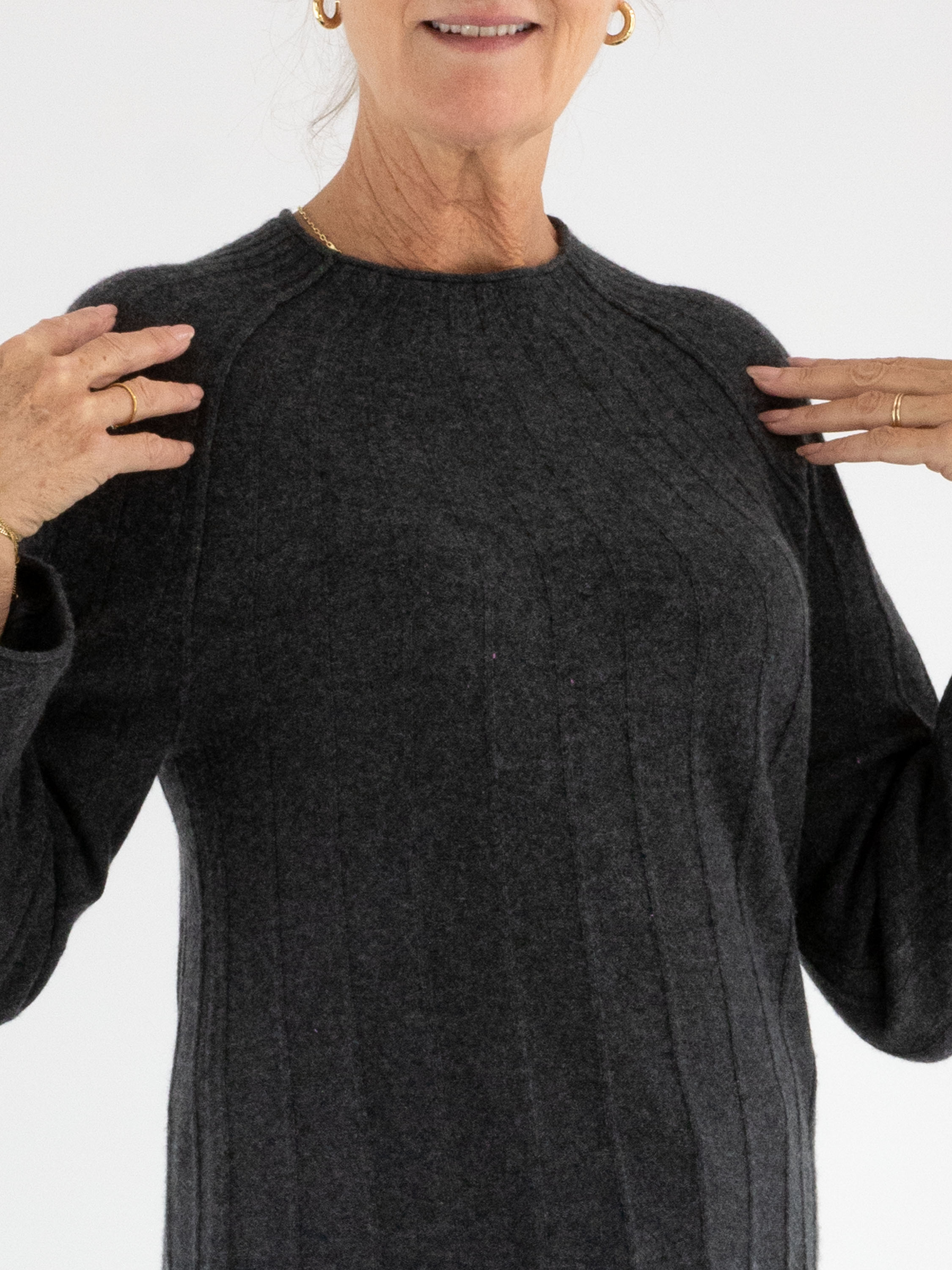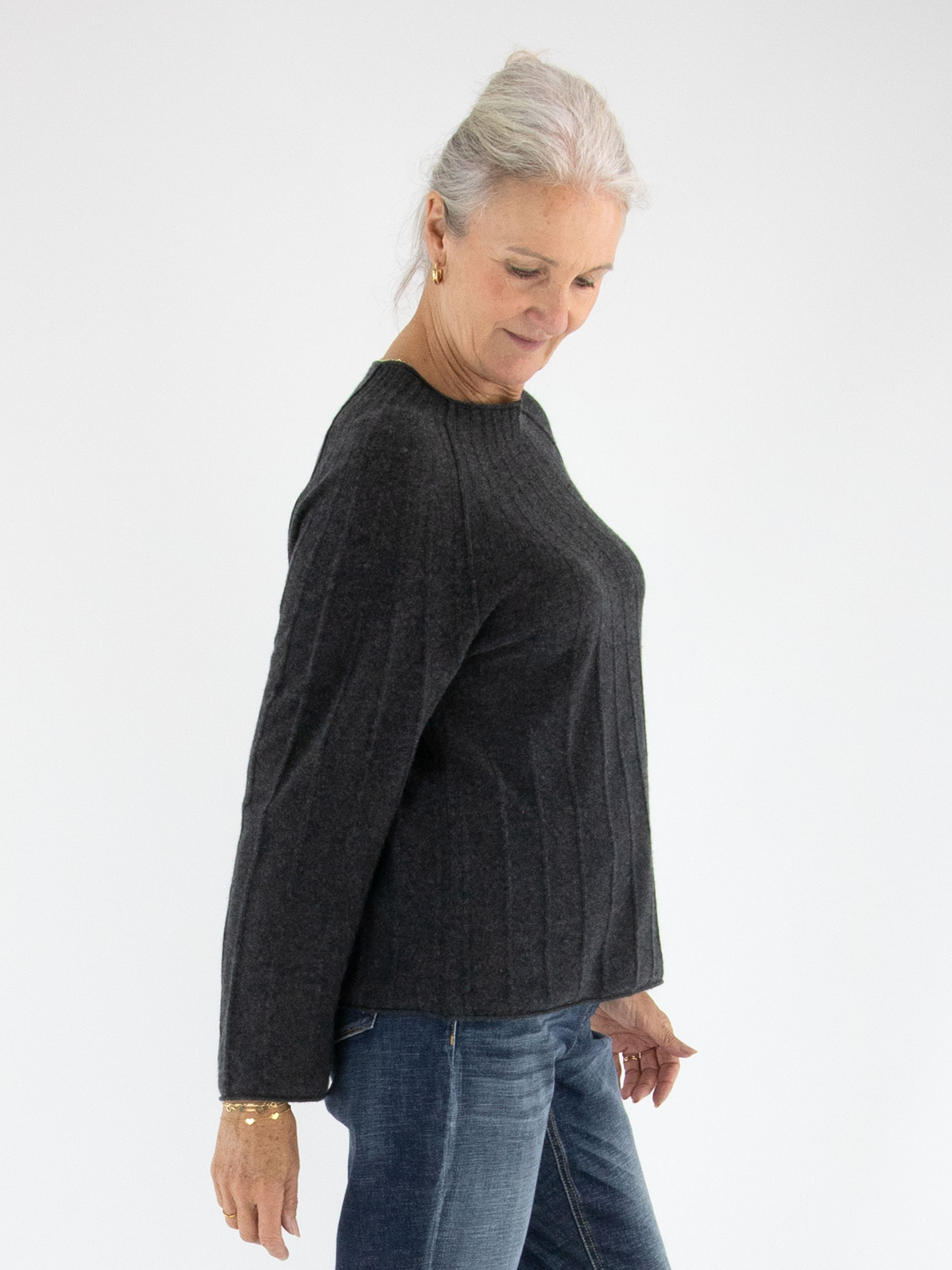 Pull luxueux Marc Cain en gris foncé chiné. De fines rayures, partant de l’encolure vers le bas, sont tricotées dans la maille. Le pull présente un col rond haut et doit être lavé à la main.