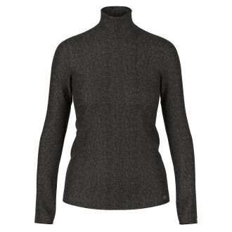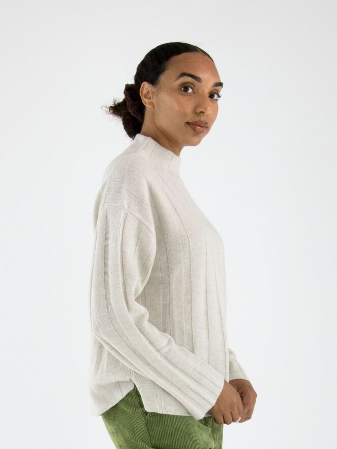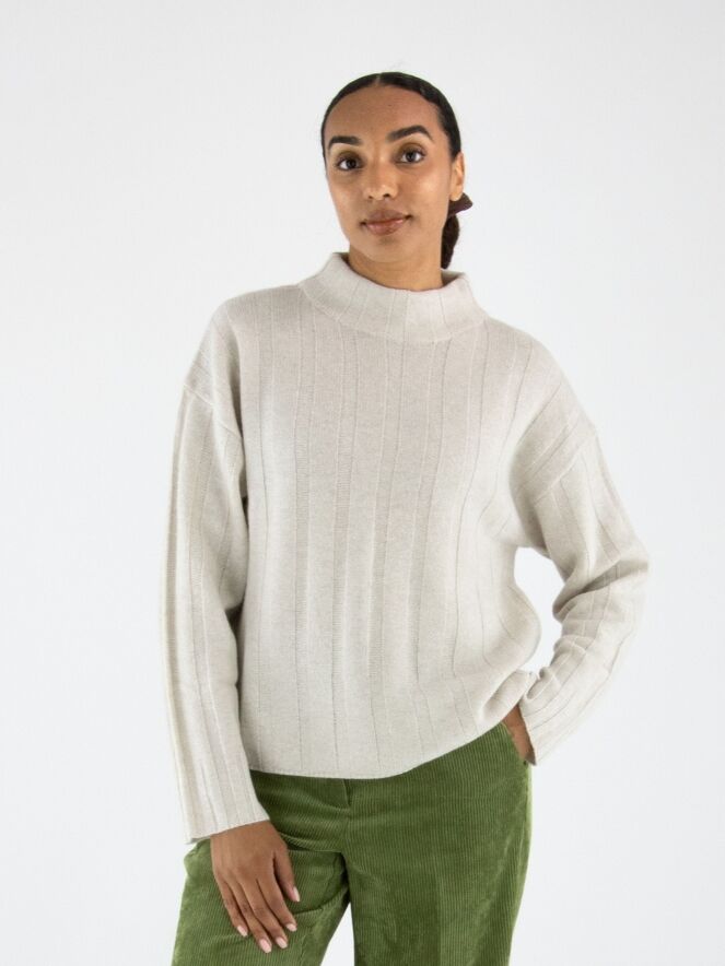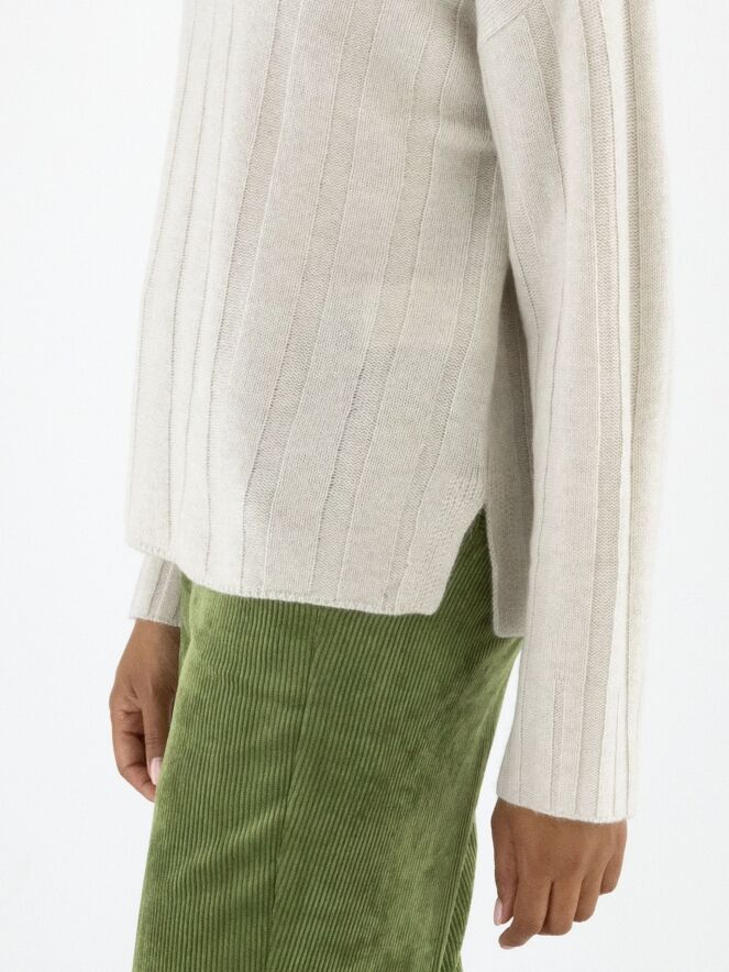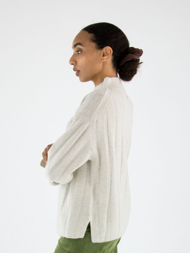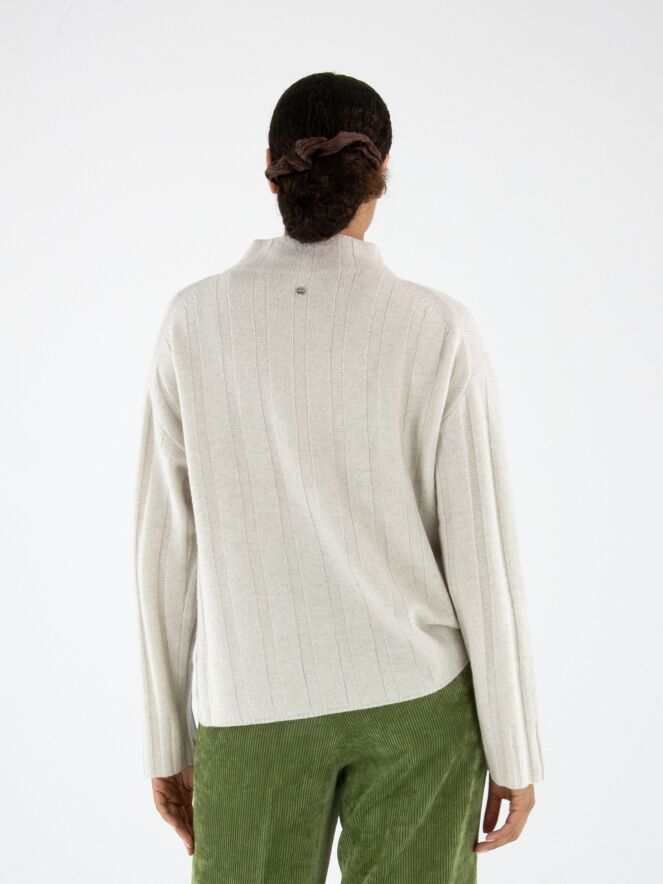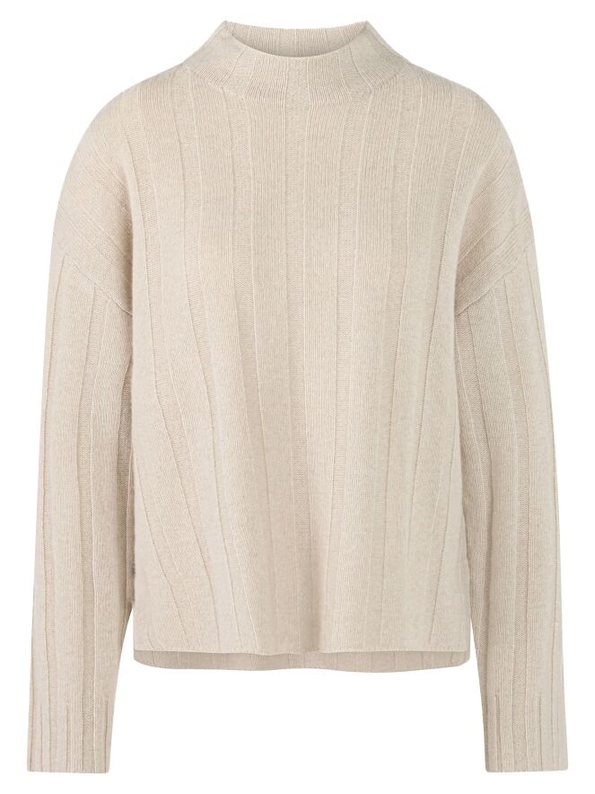 Pull luxueux Marc Cain à motif de rayures verticales en beige. Le pull présente un col roulé haut et des manches longues. De petites fentes se trouvent de chaque côté à la base. Ce pull doit être lavé à la main.