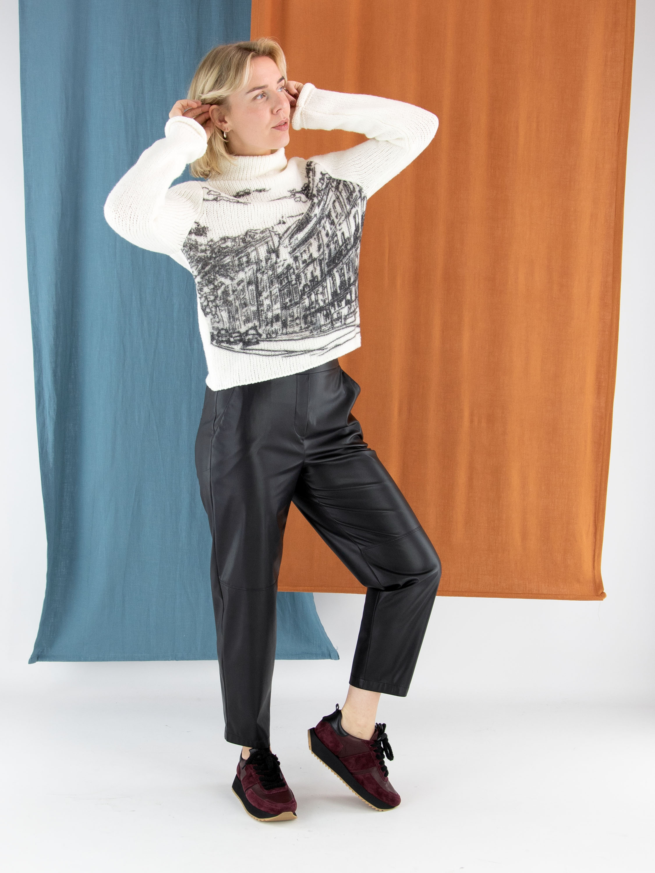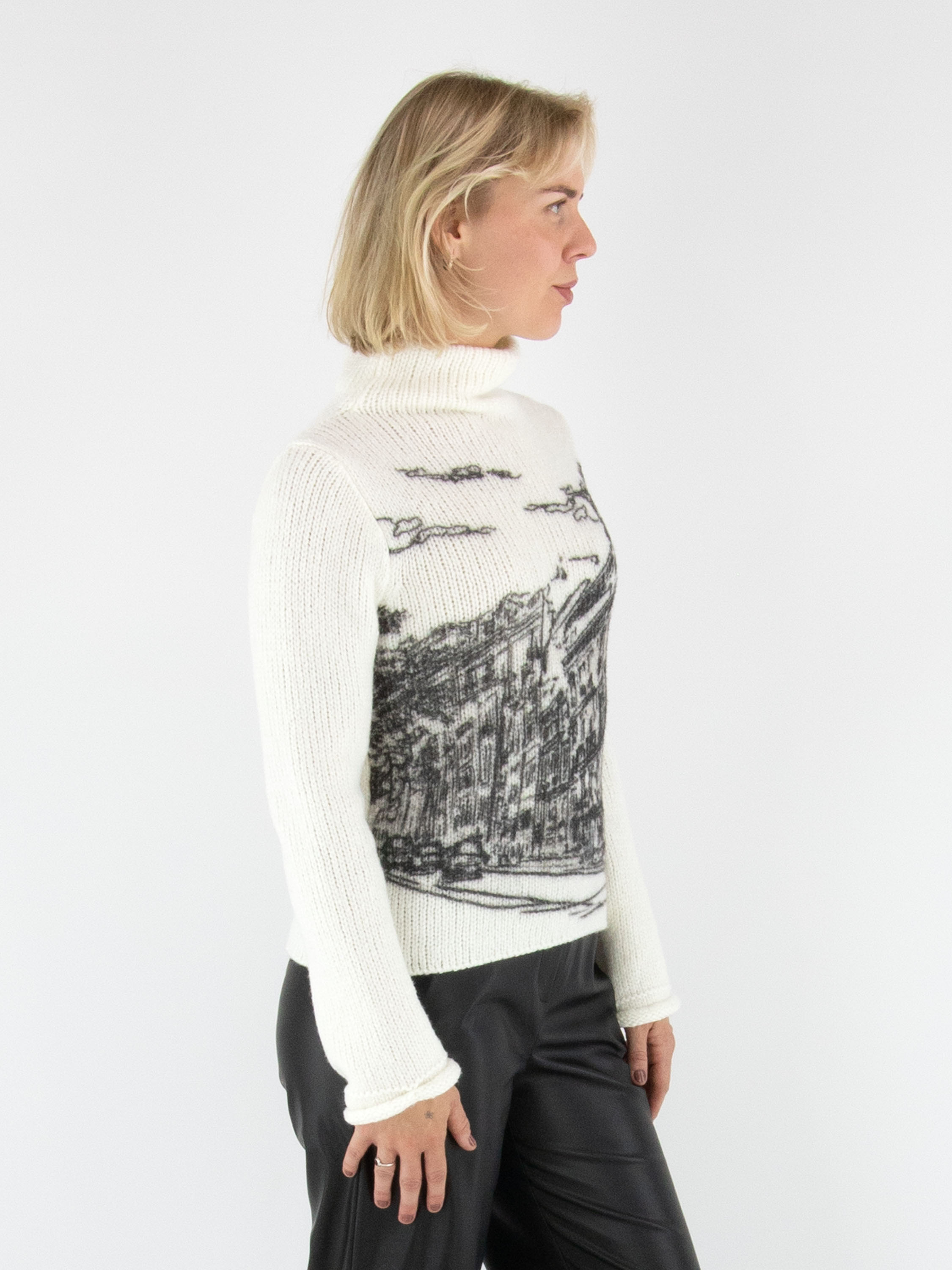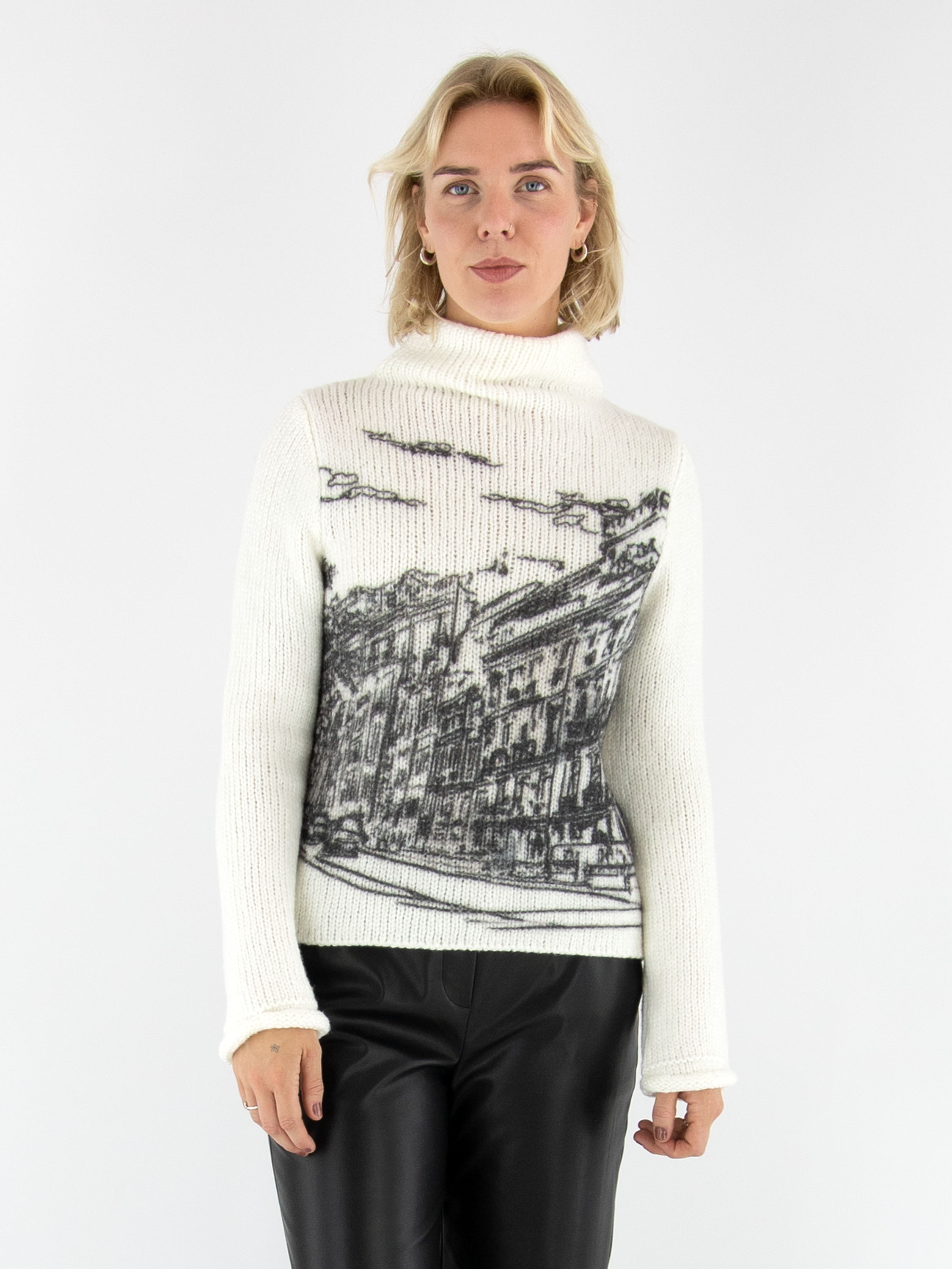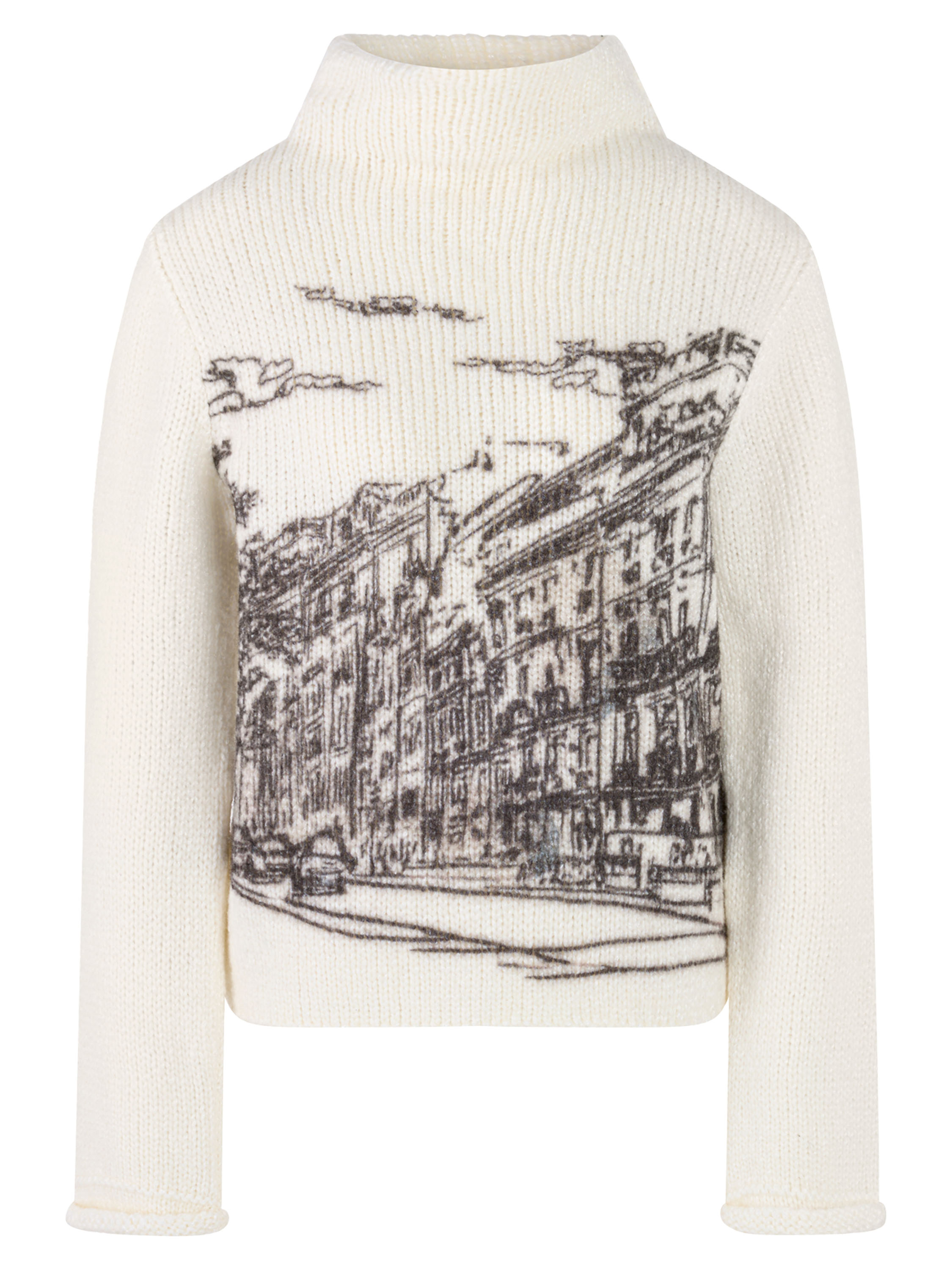 Ce pull élégant de Marc Cain présente sur le devant un motif représentant l’esquisse d’un bâtiment en noir sur un fond blanc crème. Le dos est uni en blanc crème. Le pull est doté d’un col drapé élégant et peut être lavé à la main.