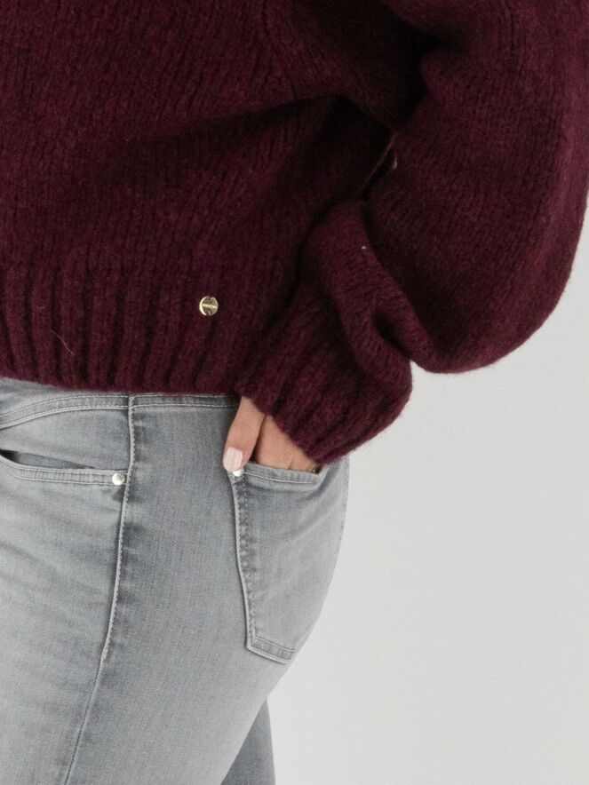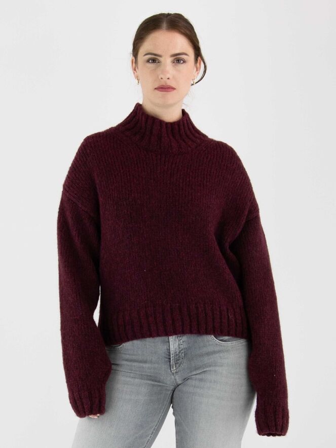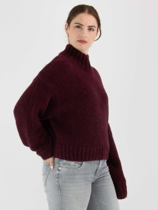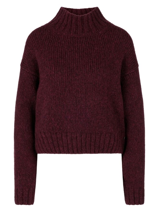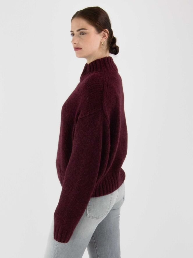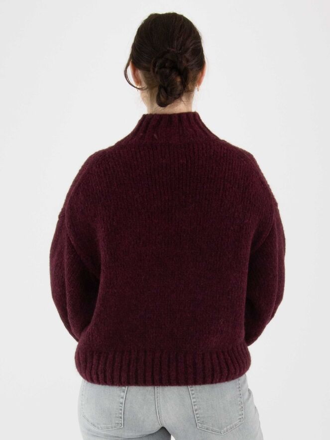 Pull de la marque Marc Cain en aubergine. Le col roulé, les extrémités des manches longues et le bas sont finis avec un motif côtelé à grosses mailles. Ce pull doit être lavé à la main.