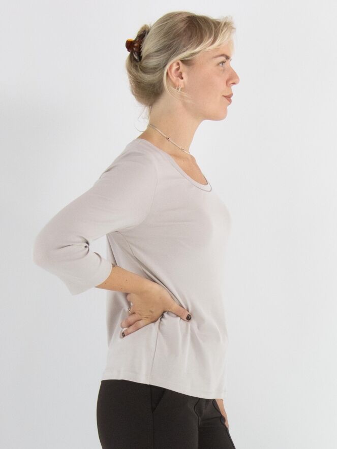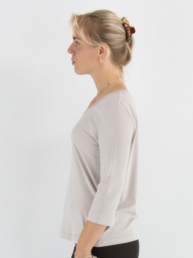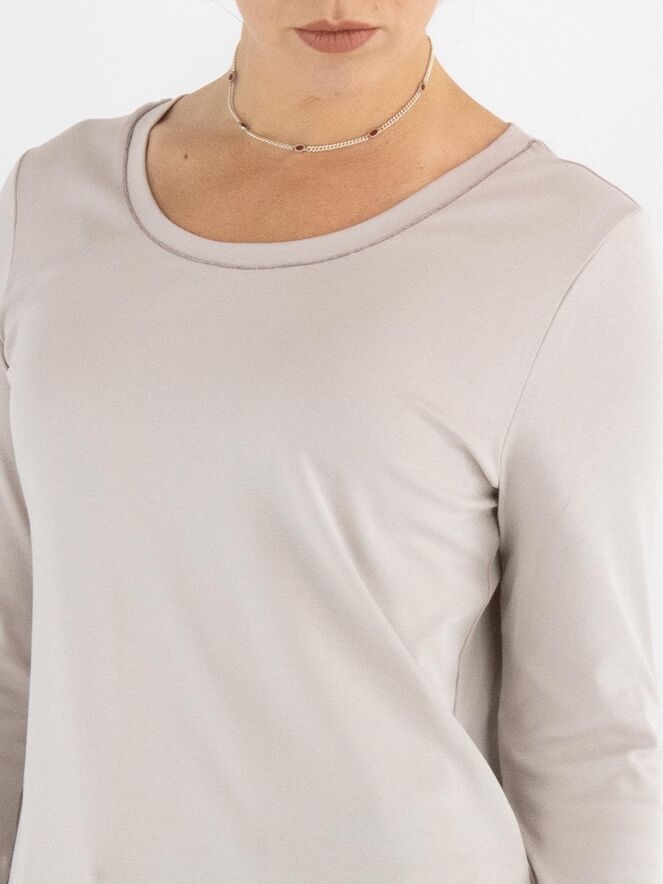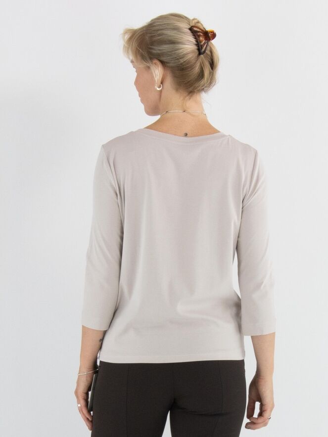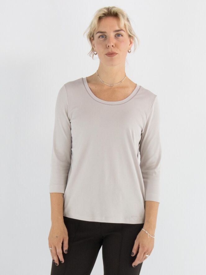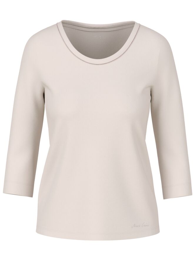 Un t-shirt de Marc Cain de couleur beige. Il a des manches mi-longues et un col rond. Le bord du col est orné d’un galon avec strass. Ce t-shirt peut être lavé à 30 degrés.