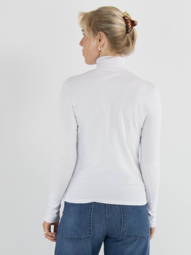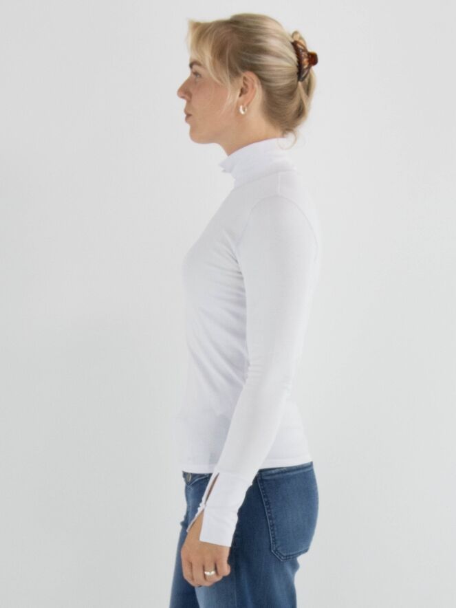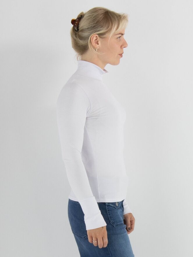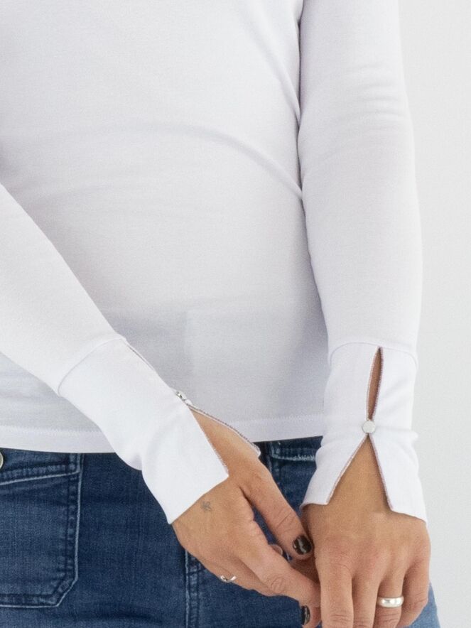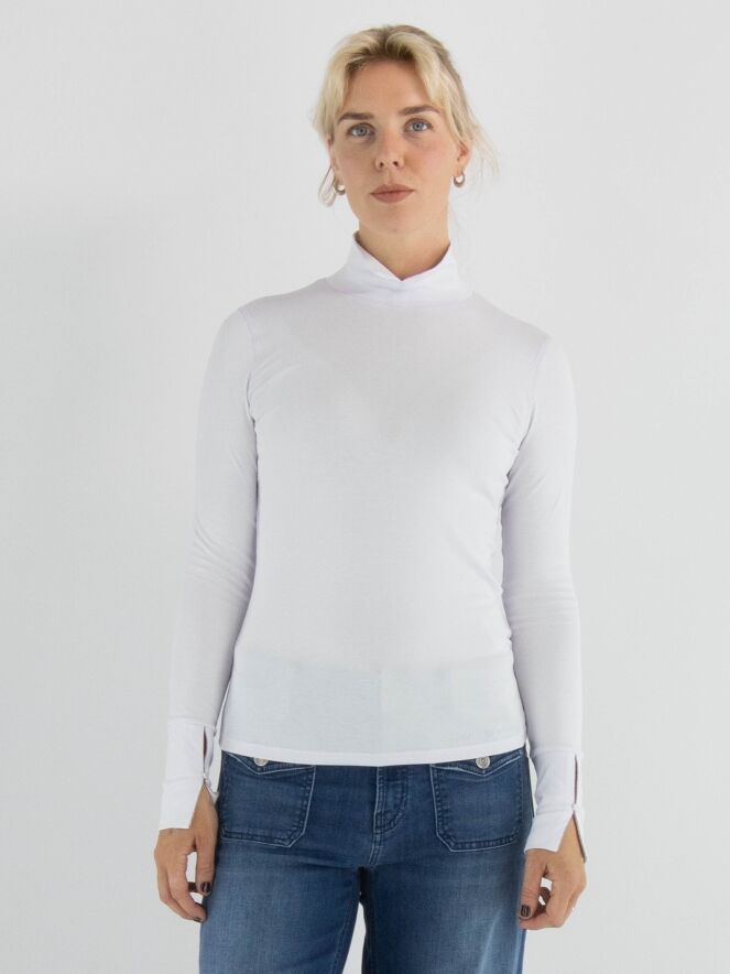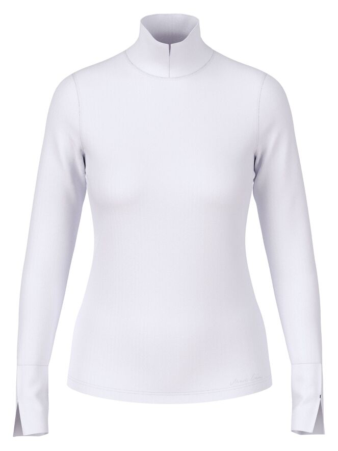 T-shirt Marc Cain dans une teinte lilas pastel. Il a des manches longues et un col montant avec une petite fente au centre sur le devant. Ce t-shirt peut être lavé à 30 degrés.