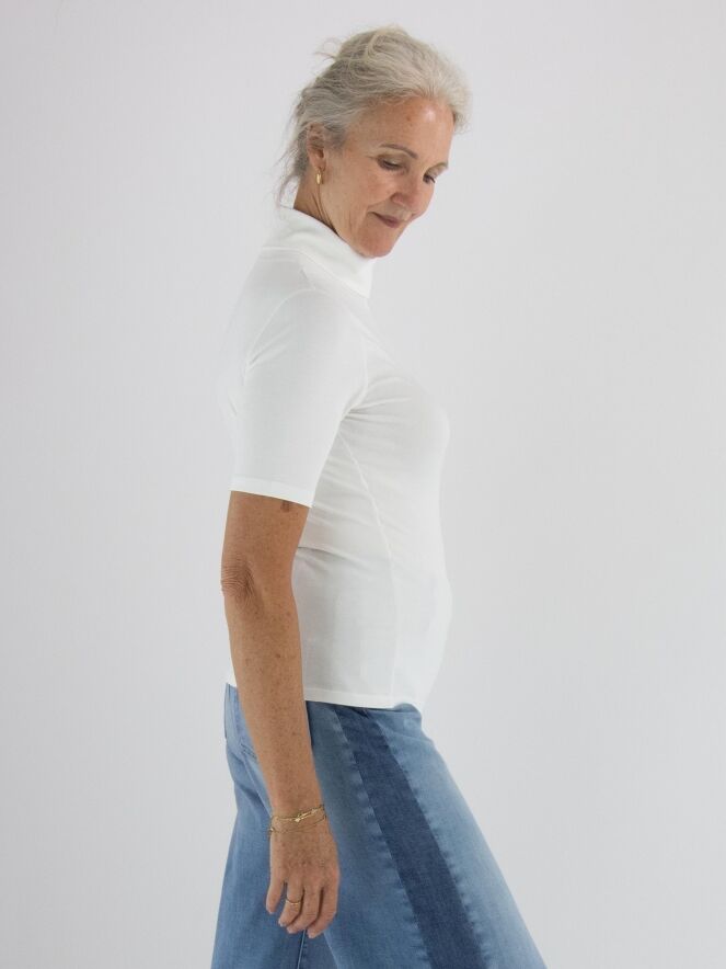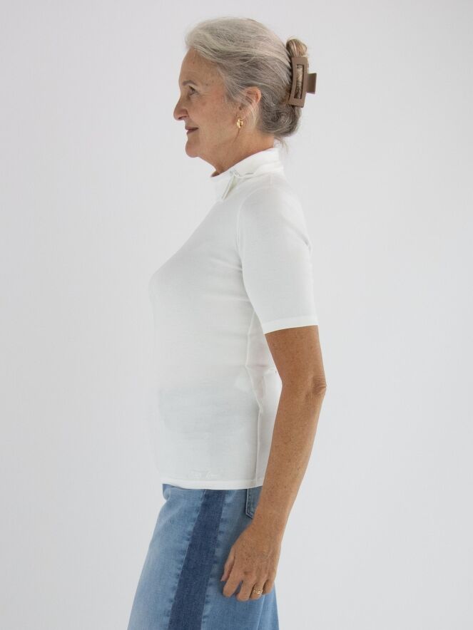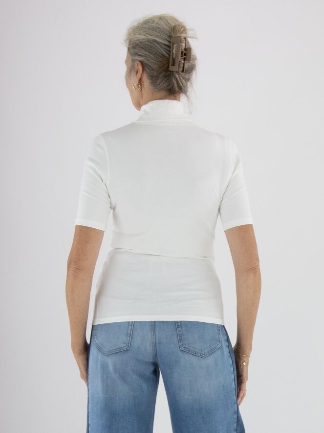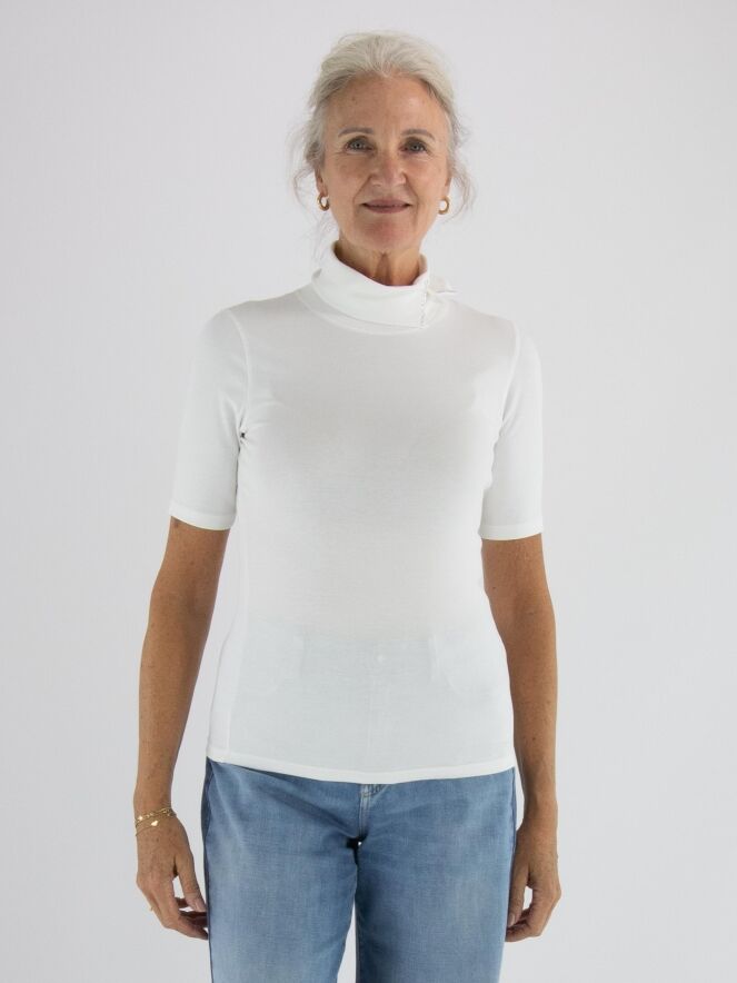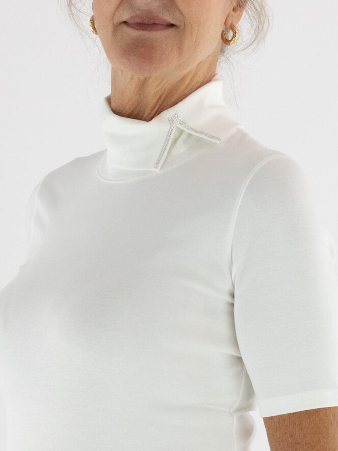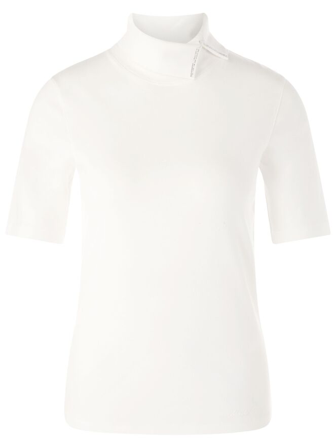T-shirt Marc Cain de couleur blanc cassé. Il possède des manches courtes et un col cheminée avec une petite fente à l'avant, légèrement décalée vers la gauche. Des strass décoratifs ornent le bord de la fente. Ce t-shirt peut être lavé à 30 degrés.