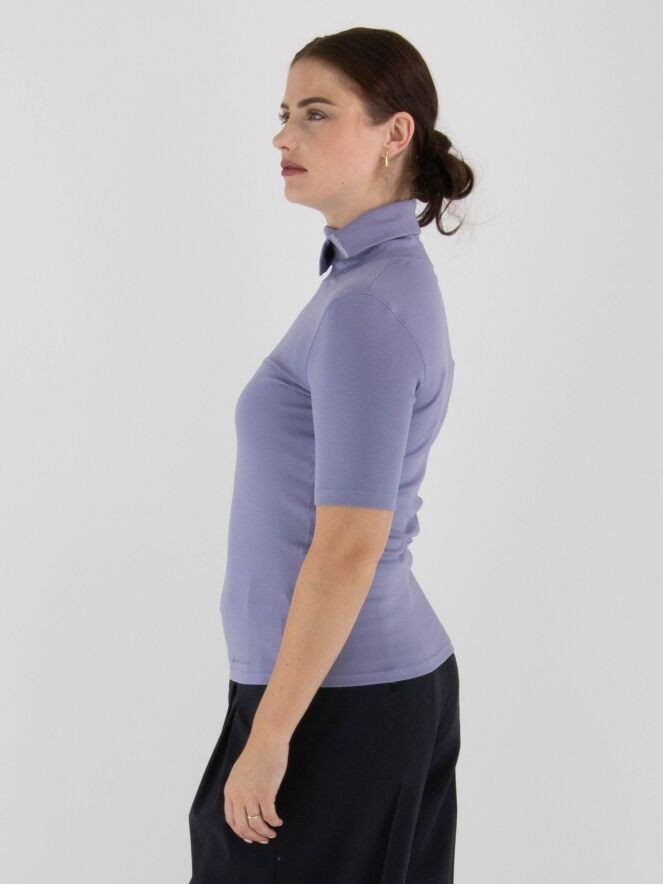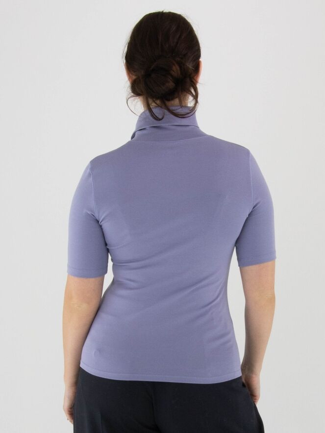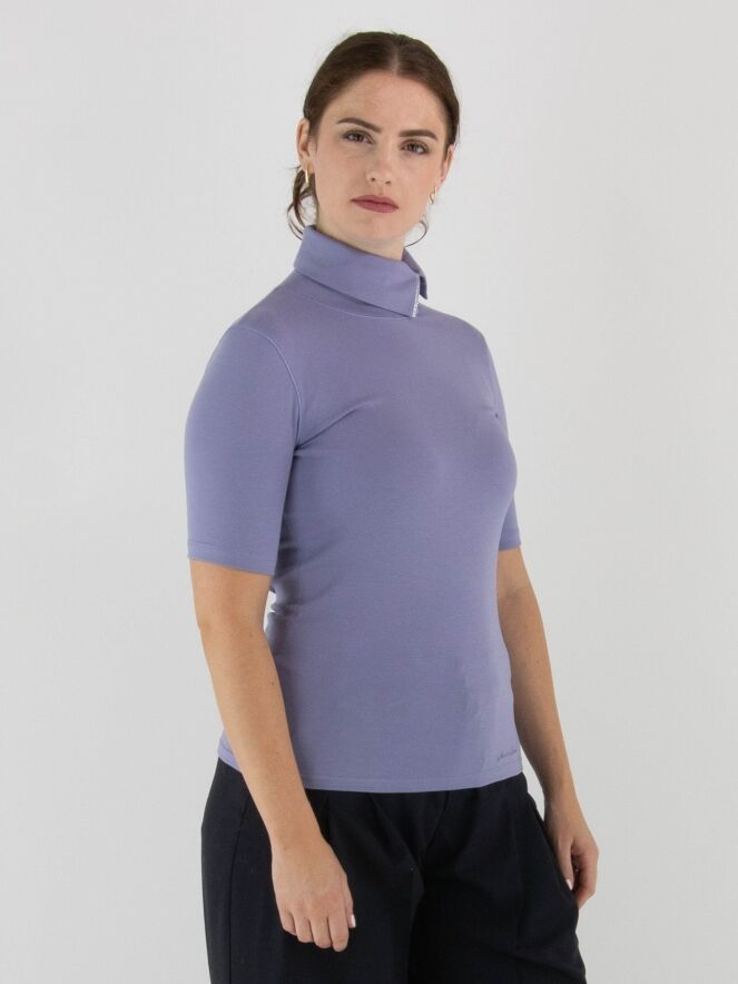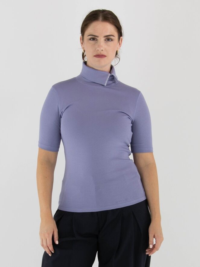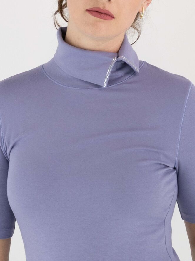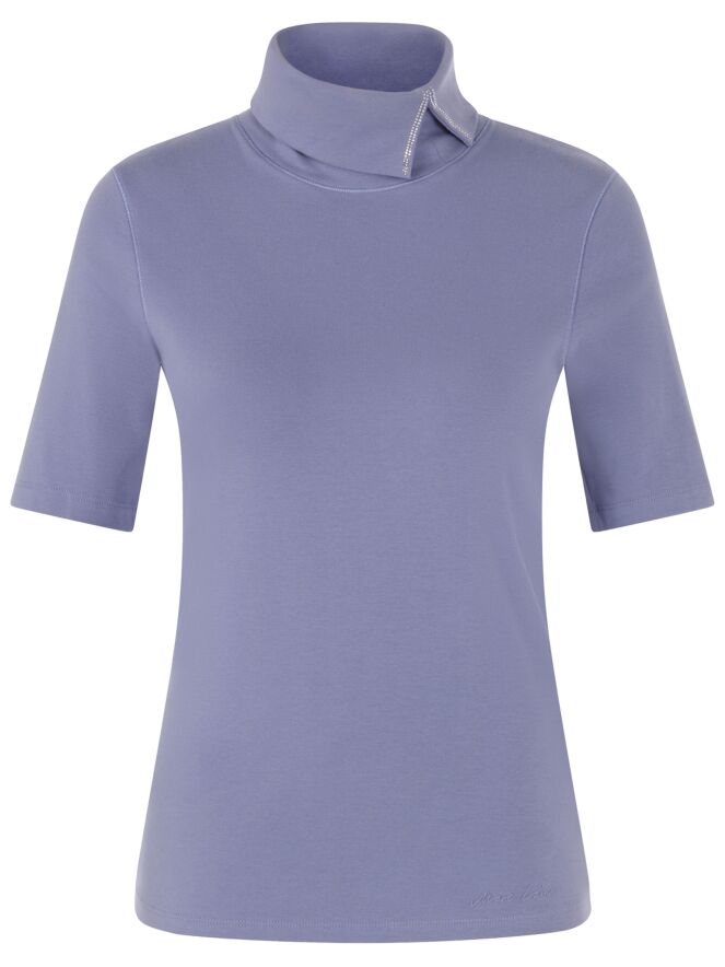 T-shirt Marc Cain de couleur lilas. Il a des manches courtes et un col cheminée avec une petite fente sur le devant, légèrement décalée vers la gauche. Des strass décoratifs ornent le bord de la fente. Ce t-shirt peut être lavé à 30 degrés.