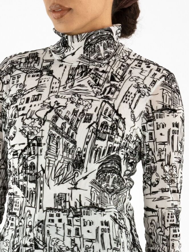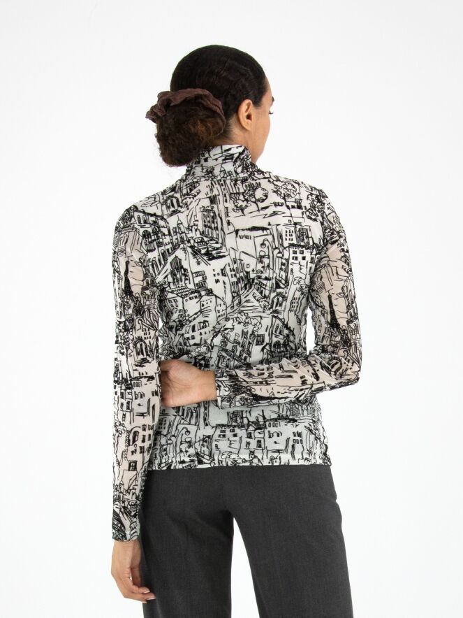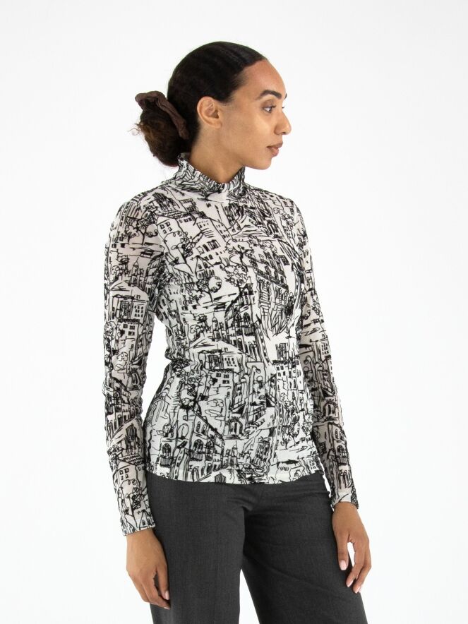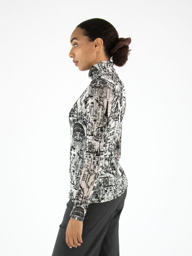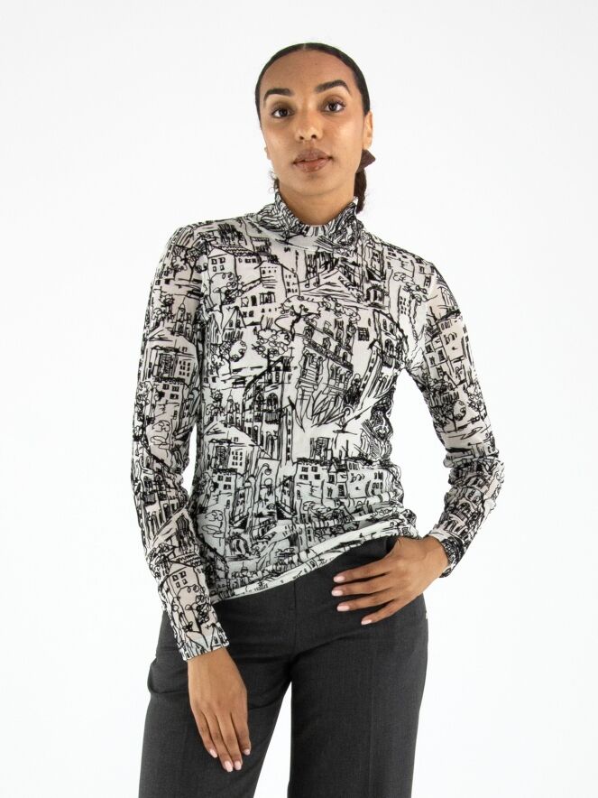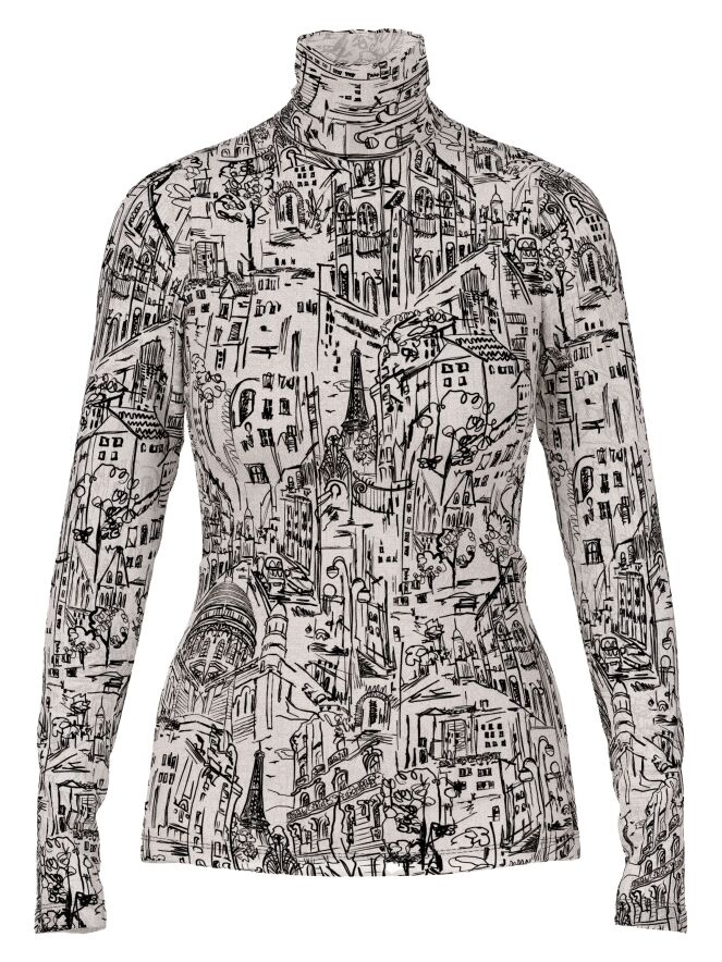 Chemisier léger et transparent Marc Cain avec un imprimé esquisse des rues de Paris en noir sur fond gris clair. Doté d’un col roulé et de manches longues. Ce chemisier peut être lavé à 30 degrés.
