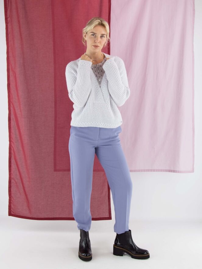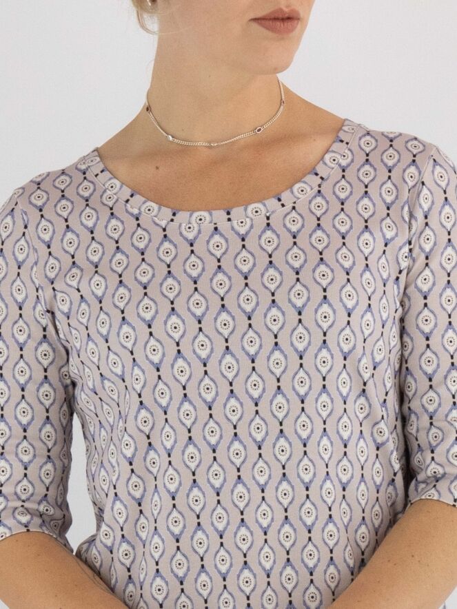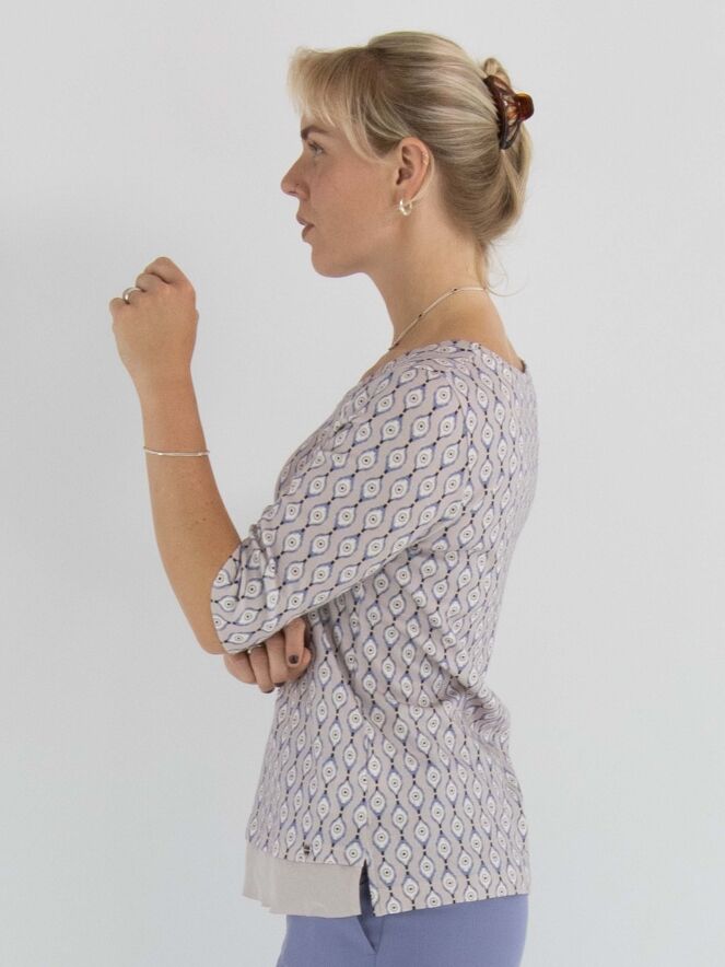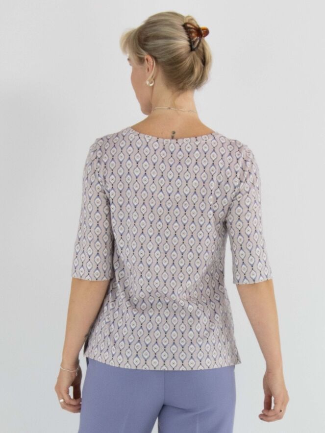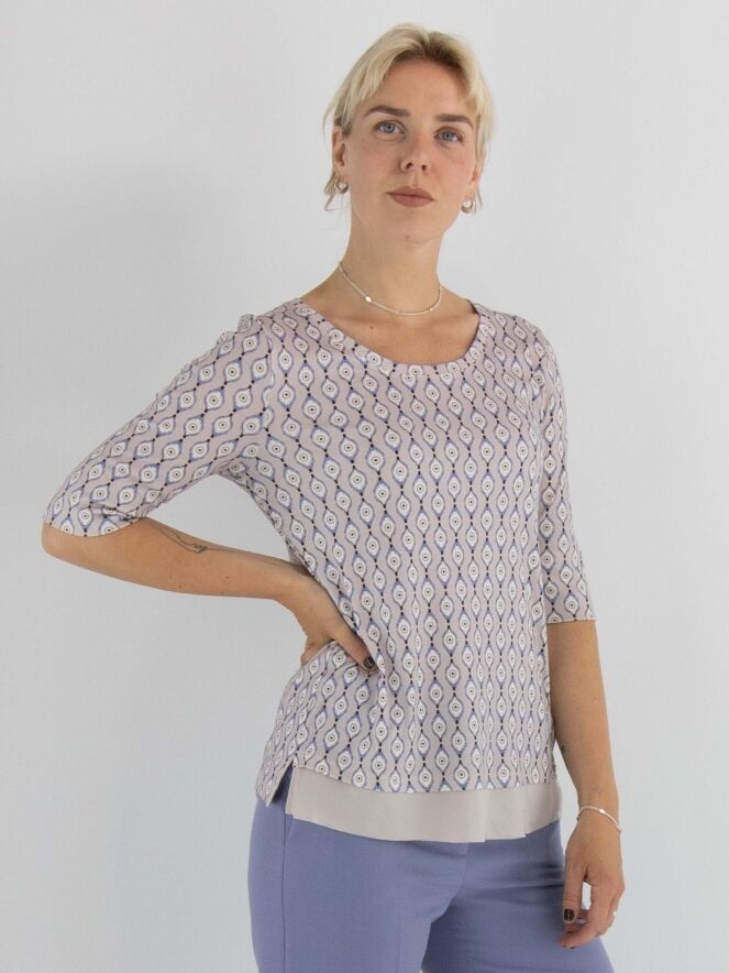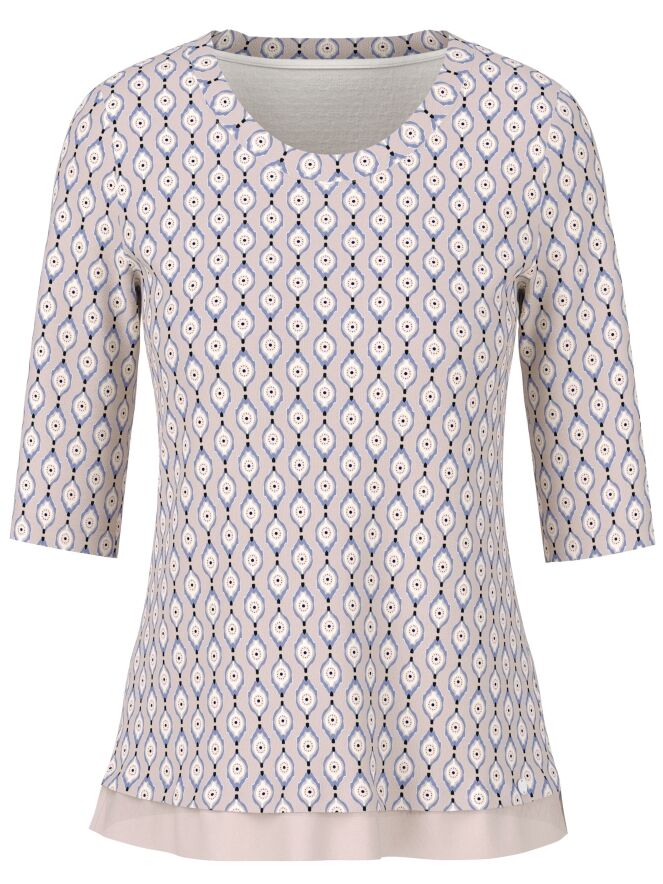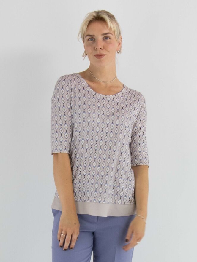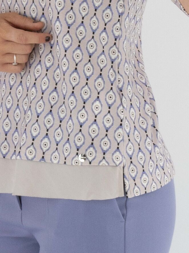 T-shirt Marc Cain avec un imprimé graphique dans les tons lilas, blanc cassé et noir sur fond rose. Une large bordure en voile rose orne l'avant de l’ourlet. Le t-shirt présente un col rond et des manches courtes. Il peut être lavé à 30 degrés.