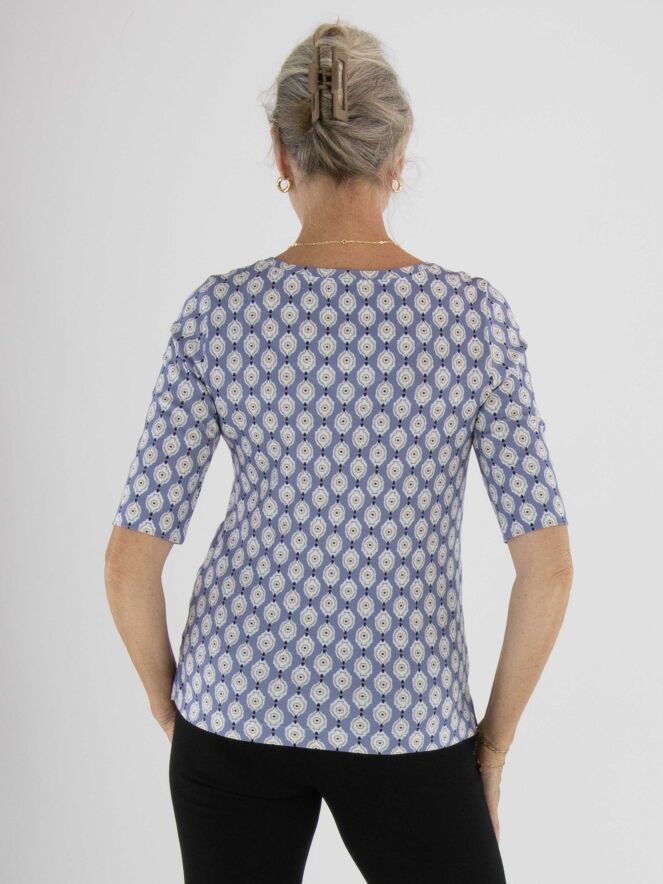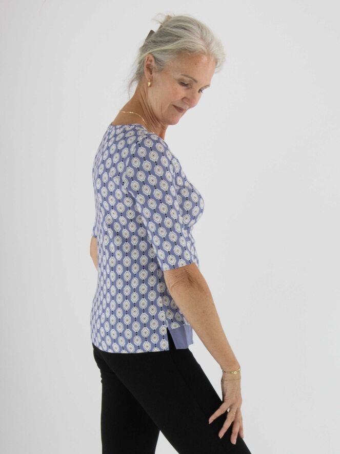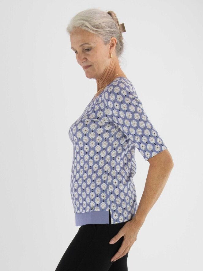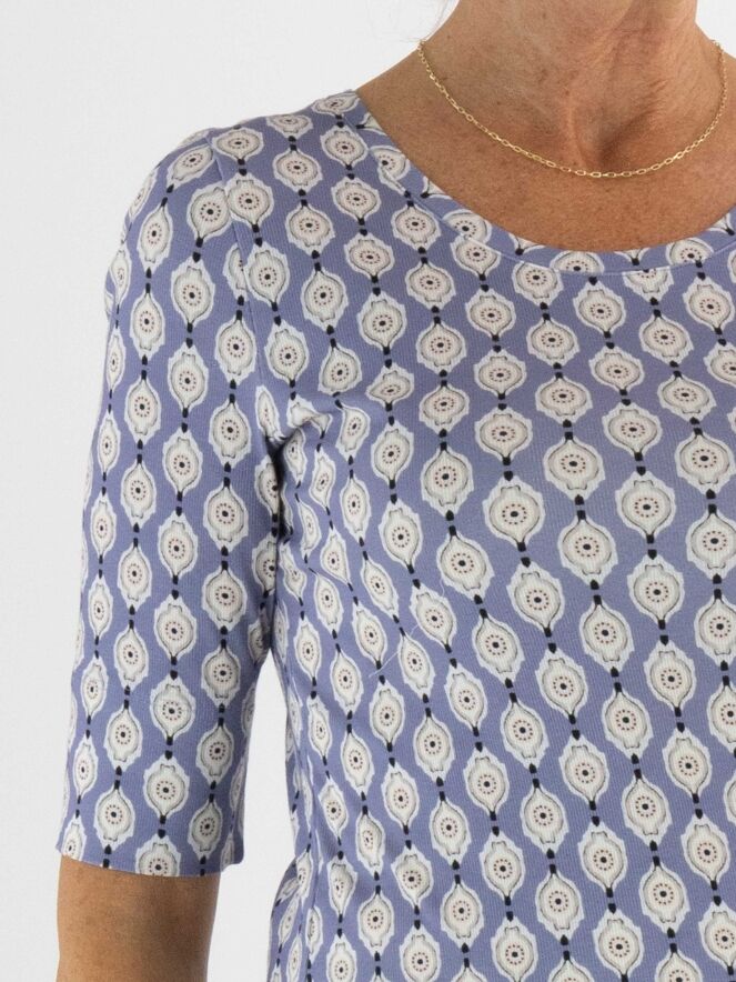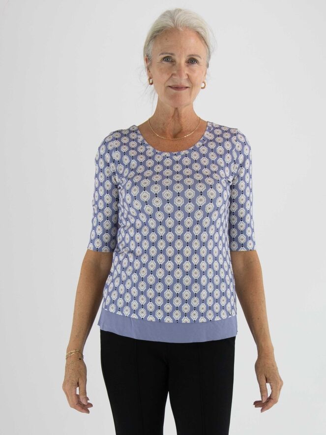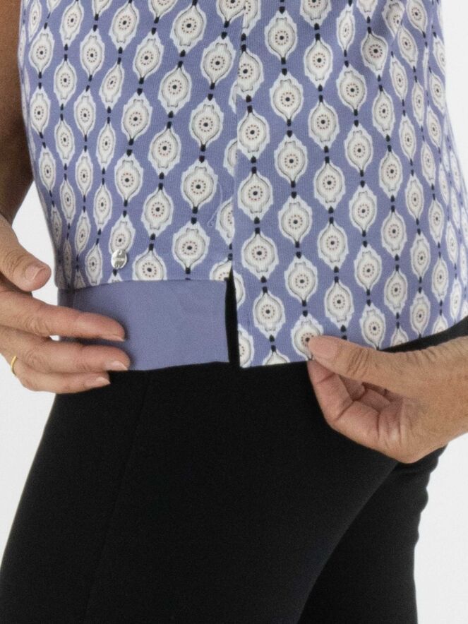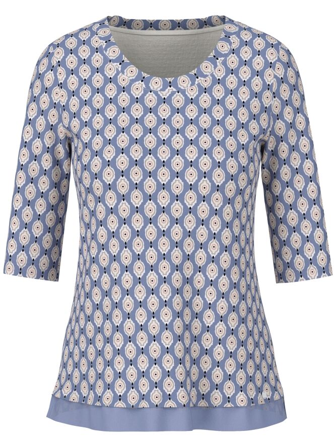 T-shirt Marc Cain à imprimé graphique dans les tons beige, rose, blanc cassé et noir sur fond lilas. Une large bande de voile rose orne le bas à l'avant. Le t-shirt présente un col rond et des manches courtes. Il peut être lavé à 30 degrés.