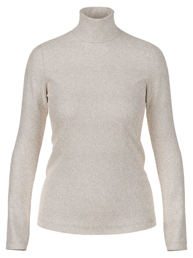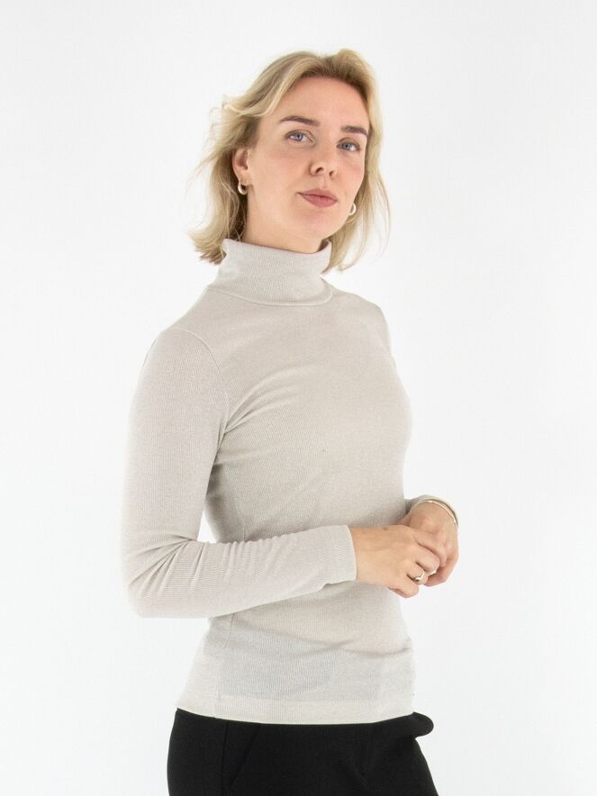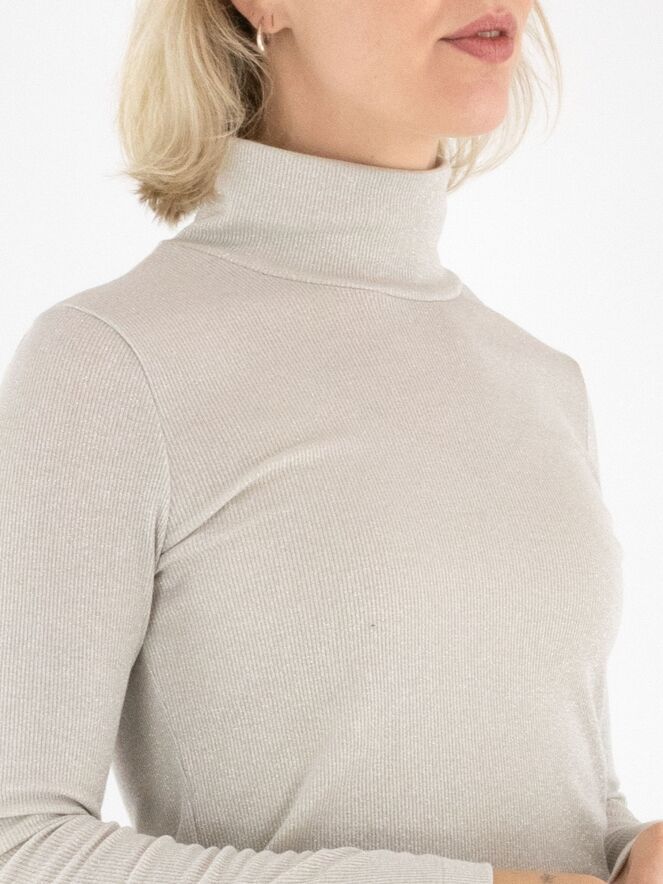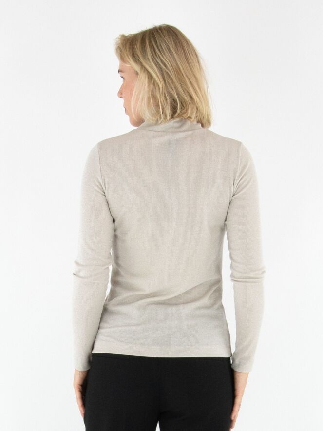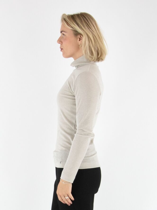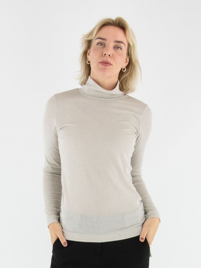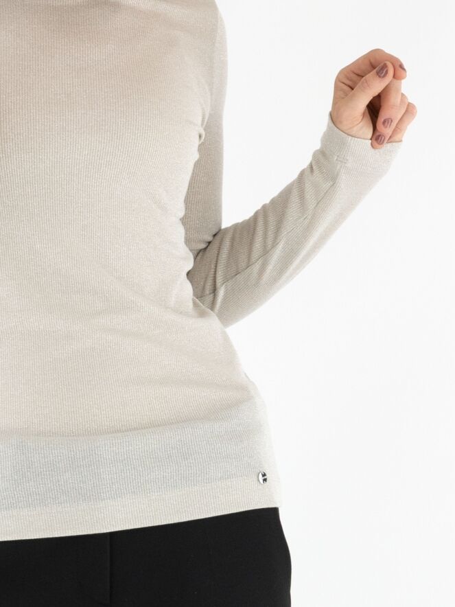 Pull Marc Cain en fine maille côtelée de couleur gris clair. Un fil argenté discret est tissé dans le tissu. Le pull est doté d’un col drapé et de manches longues. Ce pull peut être lavé à 30 degrés.