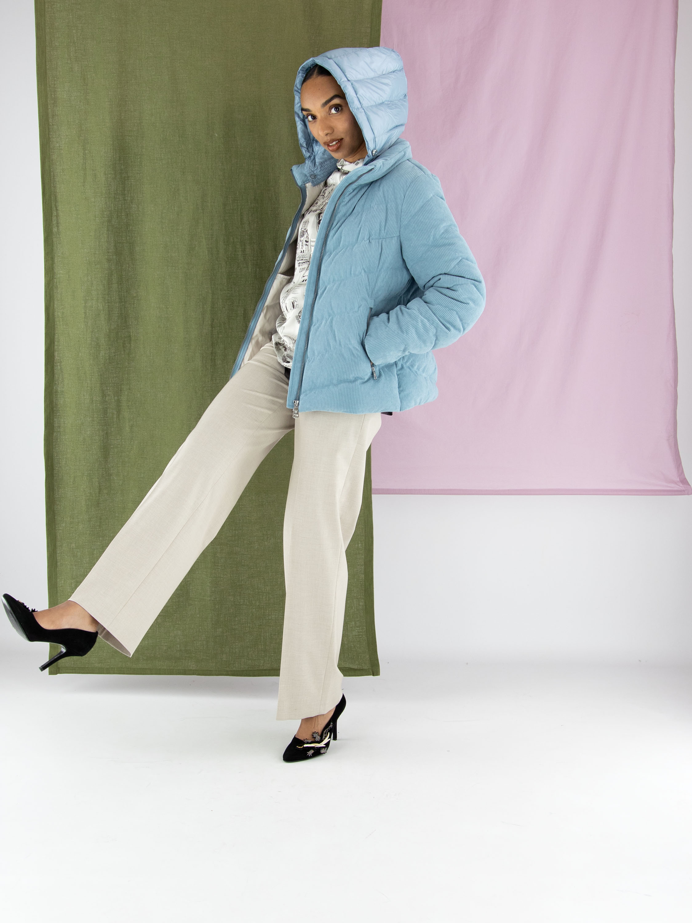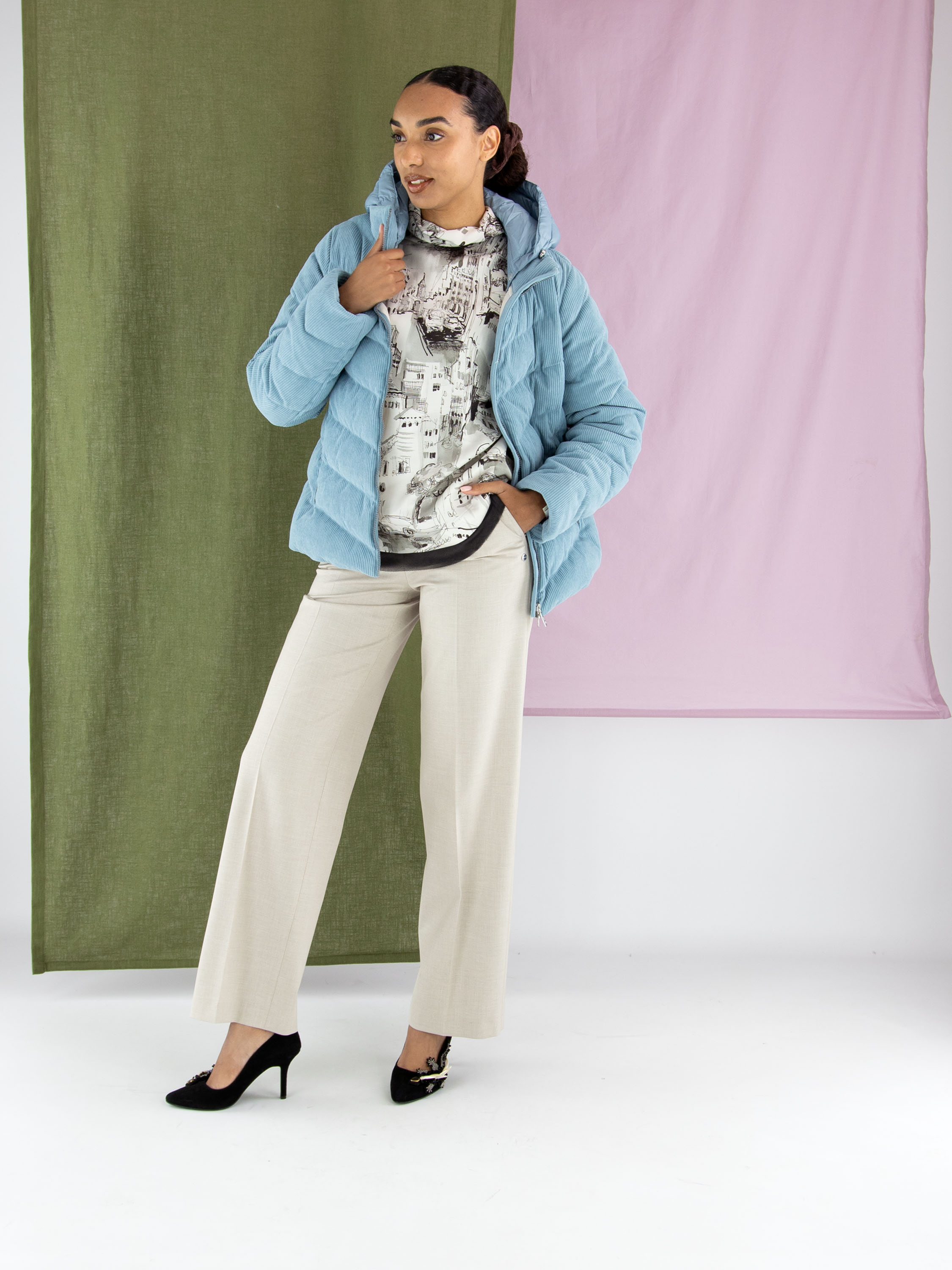 Un haut Marc Cain à imprimé des rues de Paris dans des tons de blanc, gris et noir. Le haut possède un col roulé tombant et élégant. Le bas est orné d’une bande en voile noir qui dépasse subtilement sous le tissu. Ce voile est également partiellement intégré le long des bords des manches longues. Les poignets sont finis par un poignet élastique finement plissé. Ce haut peut être lavé à 30 degrés.