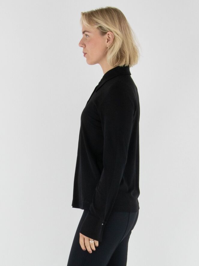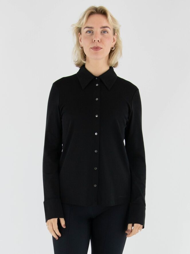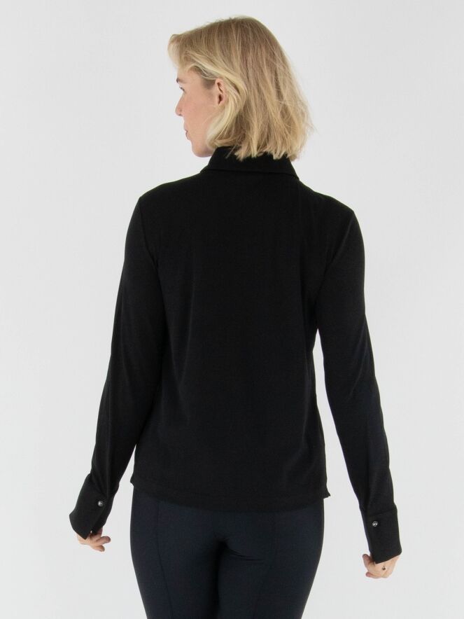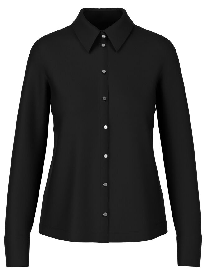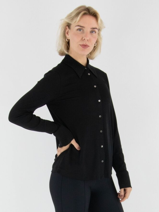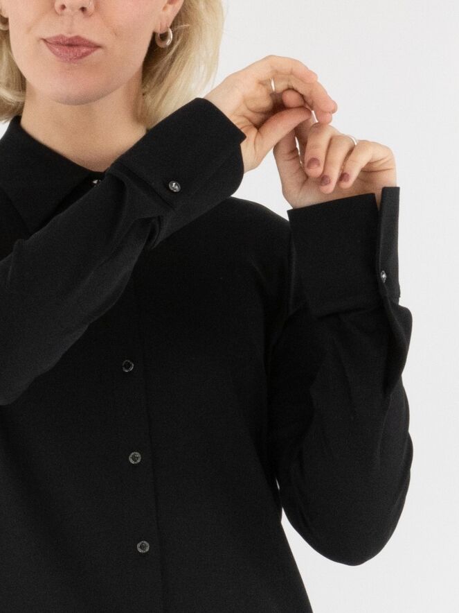 Blouse Marc Cain en noir. La fermeture est composée de boutons argentés et chaque poignet est orné d’un bouton avec strass. Cette blouse peut être lavée à 30 degrés.