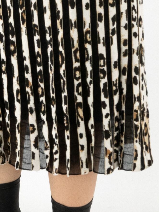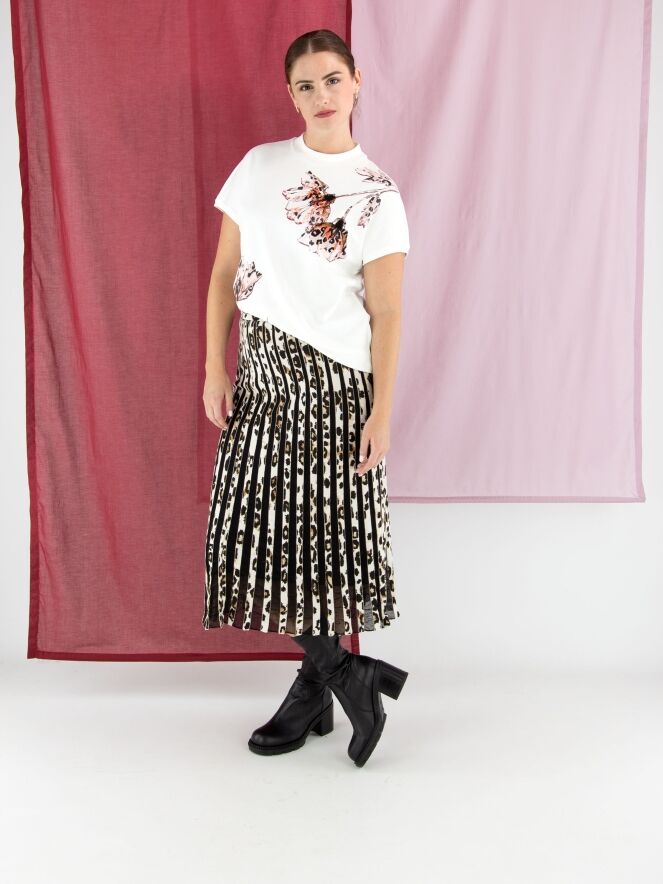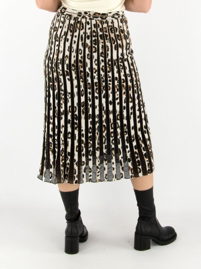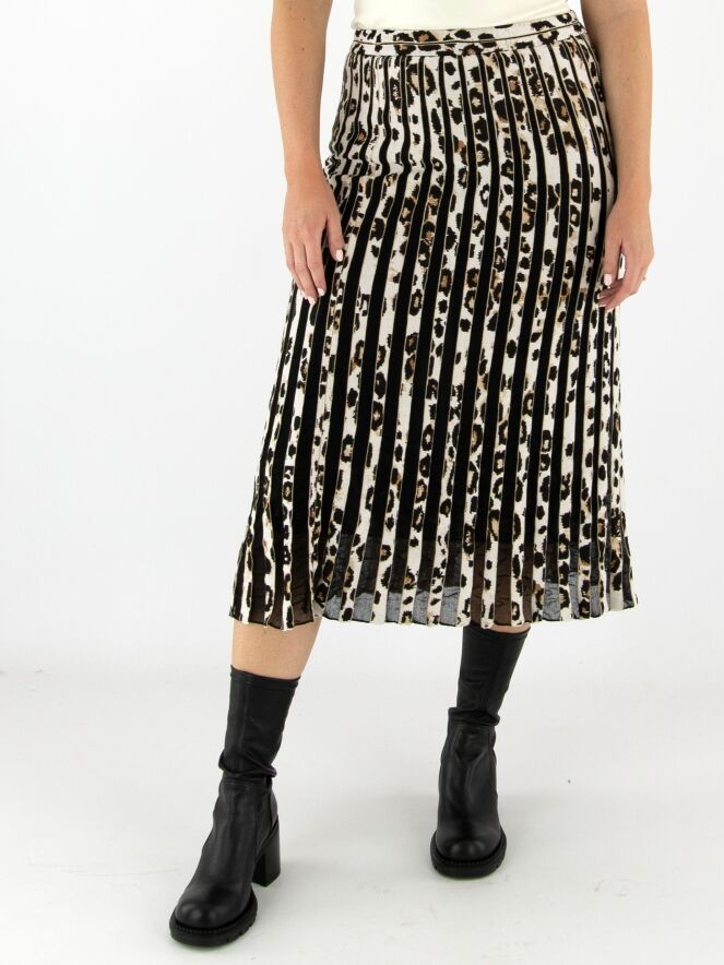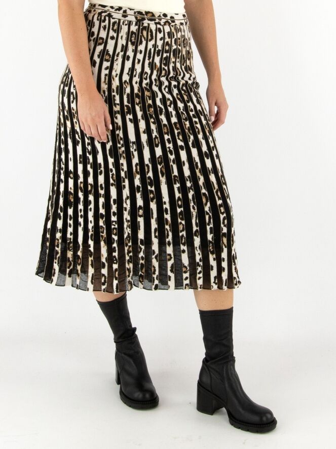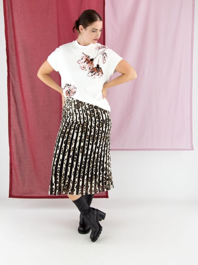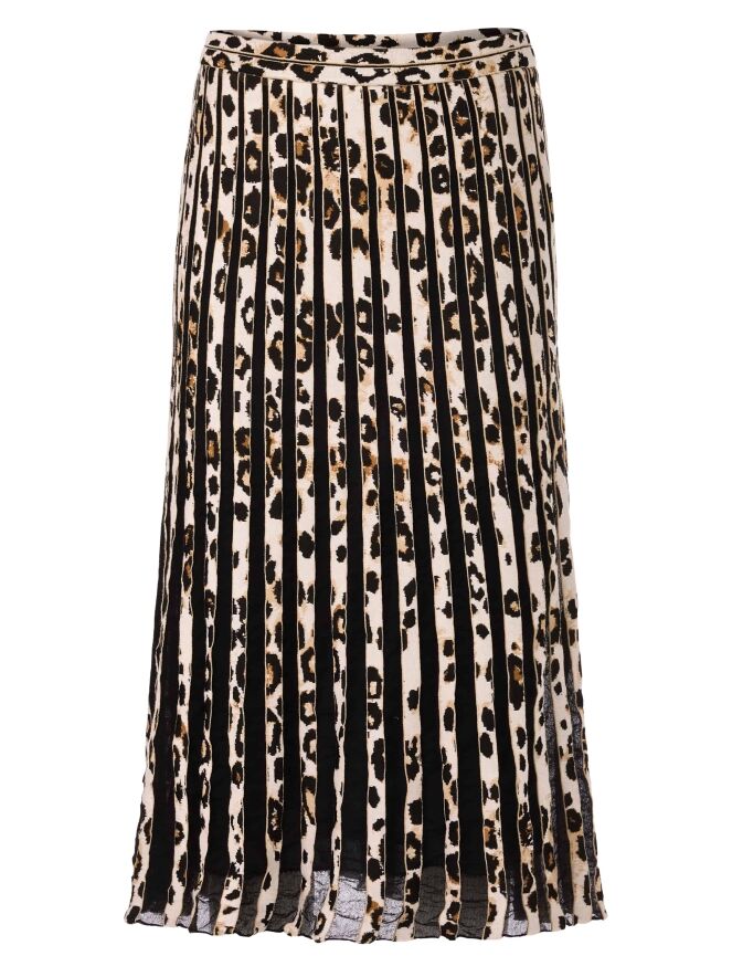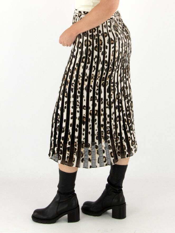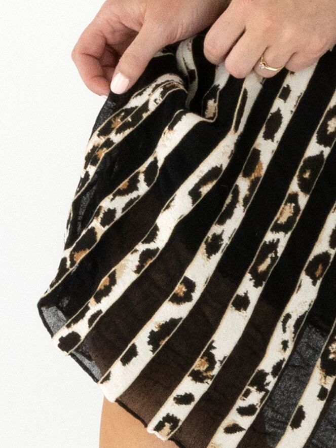Une jupe de Marc Cain avec un imprimé léopard dans plusieurs nuances de brun et de noir sur un fond couleur sable. L’imprimé est structuré par des rayures verticales noires. La taille est élastiquée. La jupe a une coupe légèrement évasée en A et est dotée d’une doublure amovible. Cette jupe peut être lavée à 30 degrés.