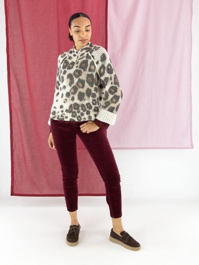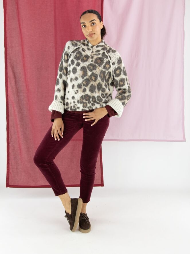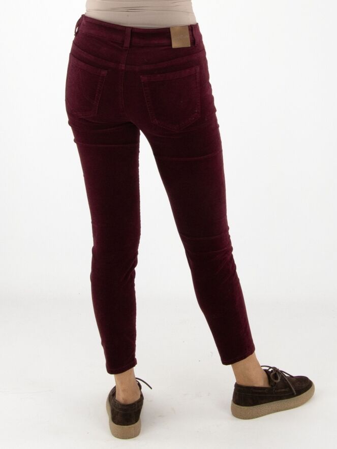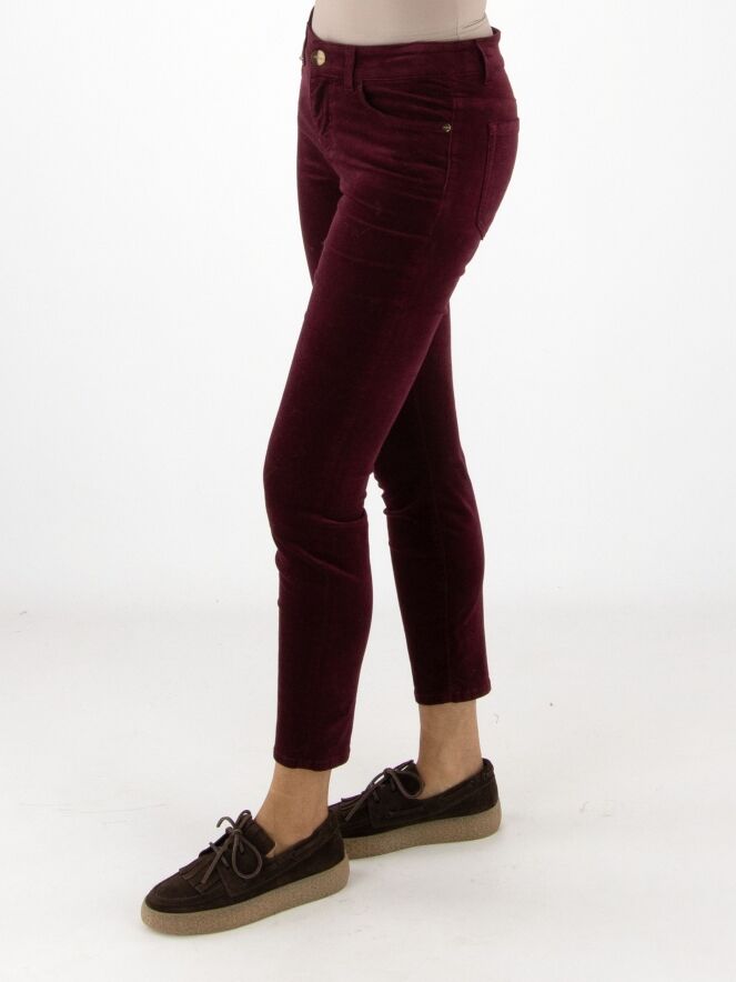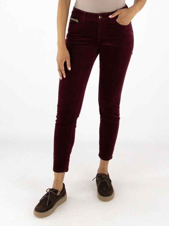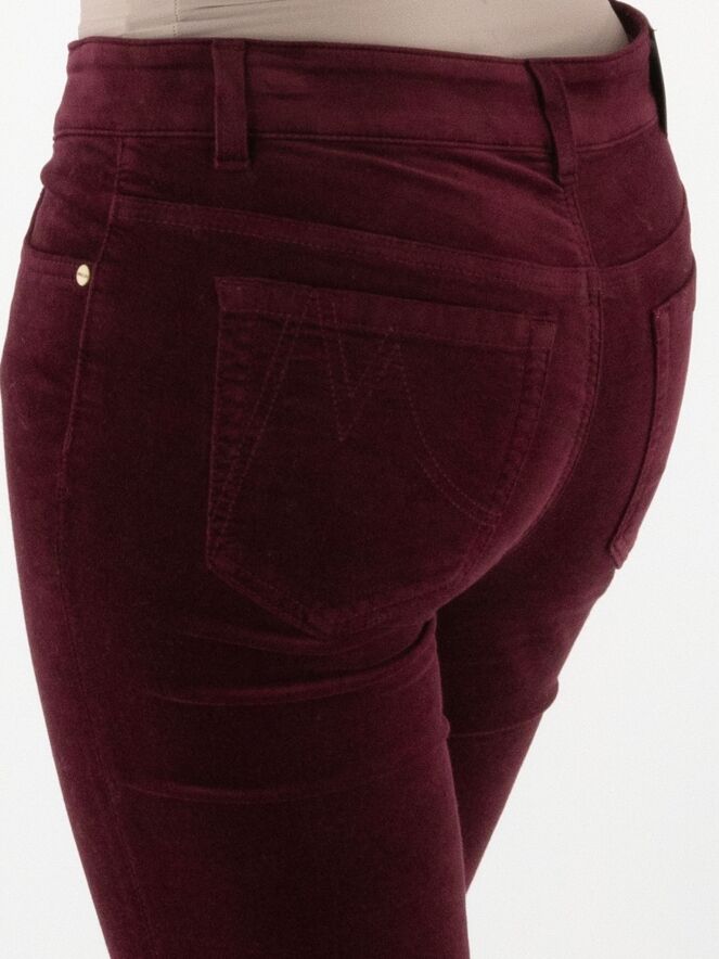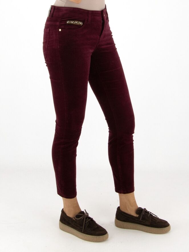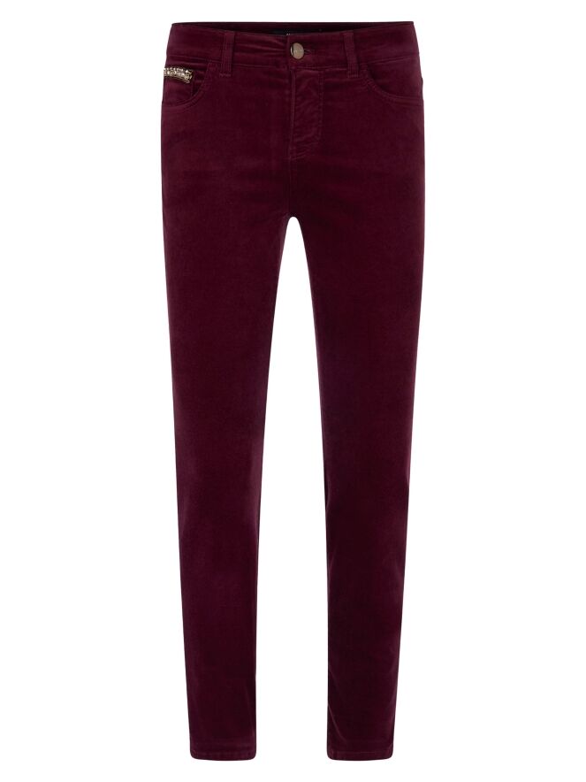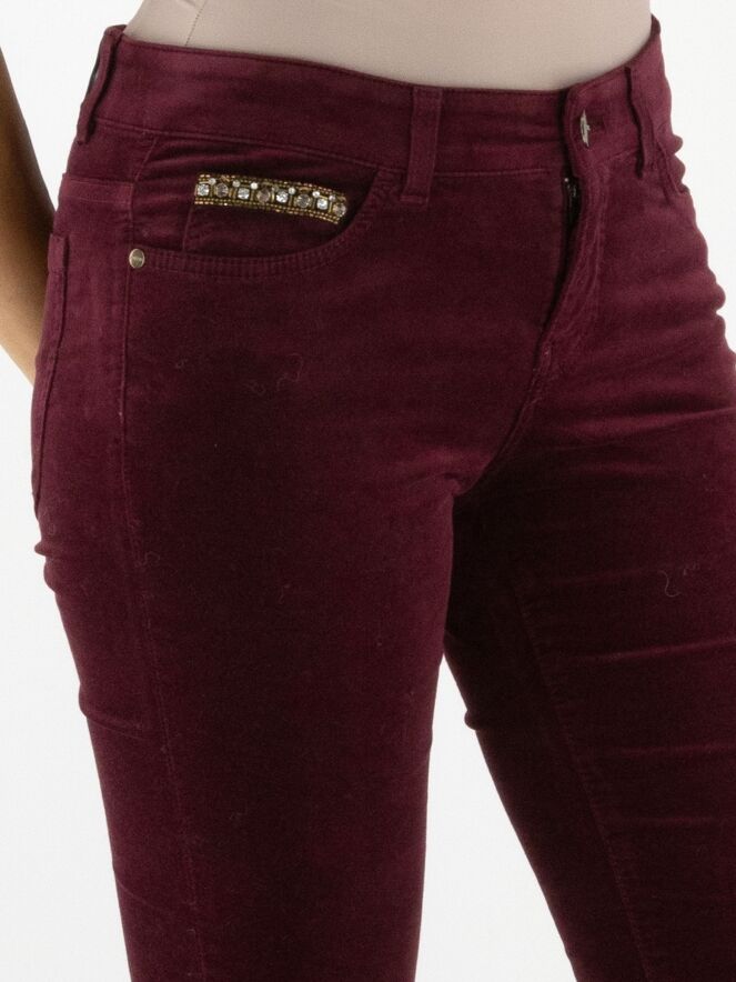Pantalon en velours Marc Cain de couleur rouge aubergine. Ce modèle 5 poches est orné de strass le long du petit rabat de poche avant. Ce pantalon peut être lavé à 30 degrés.