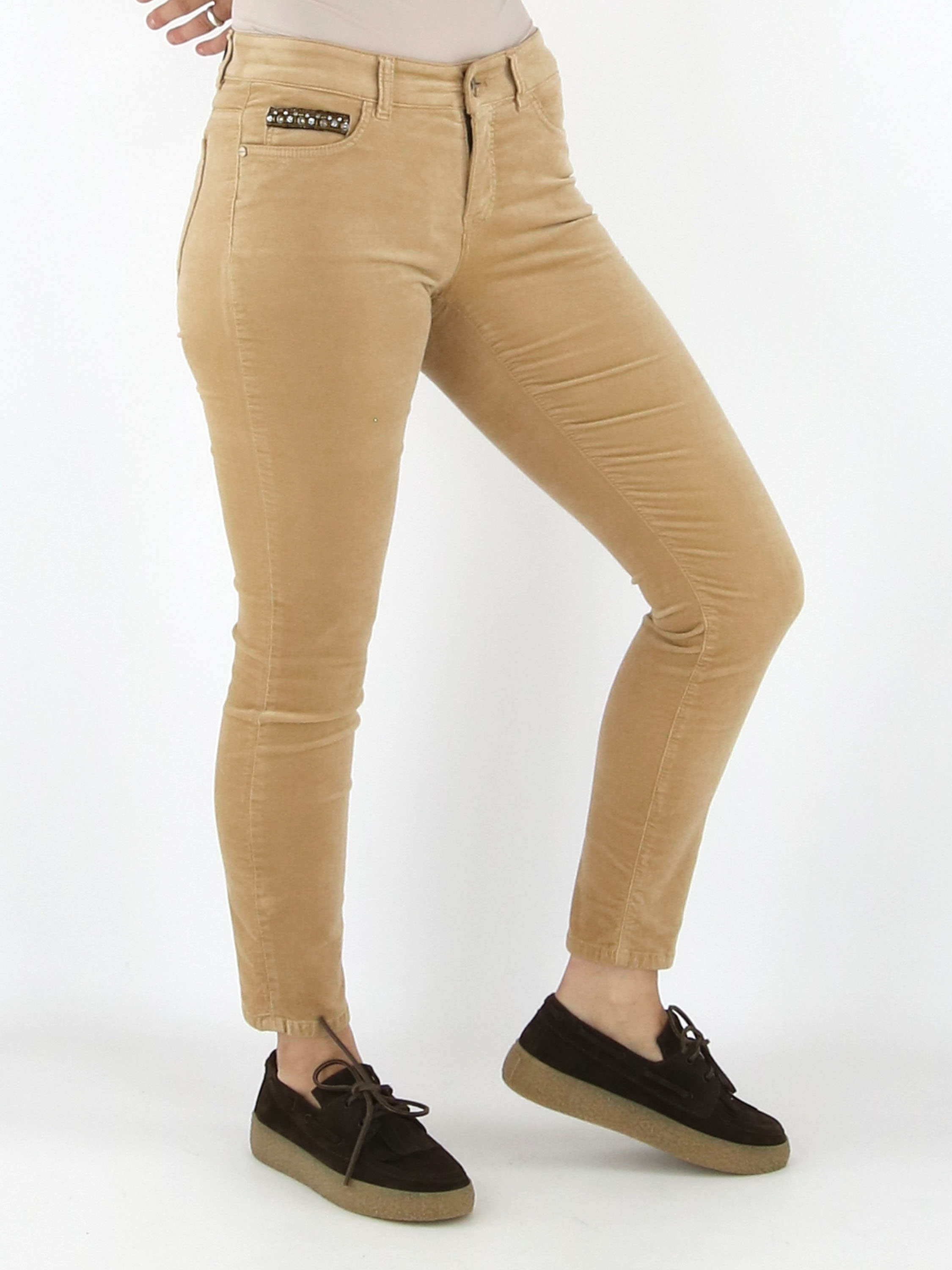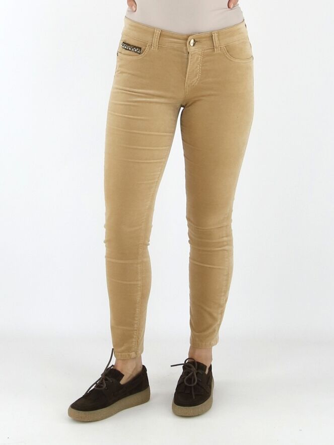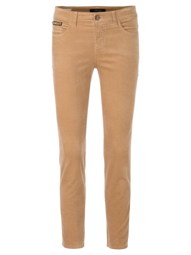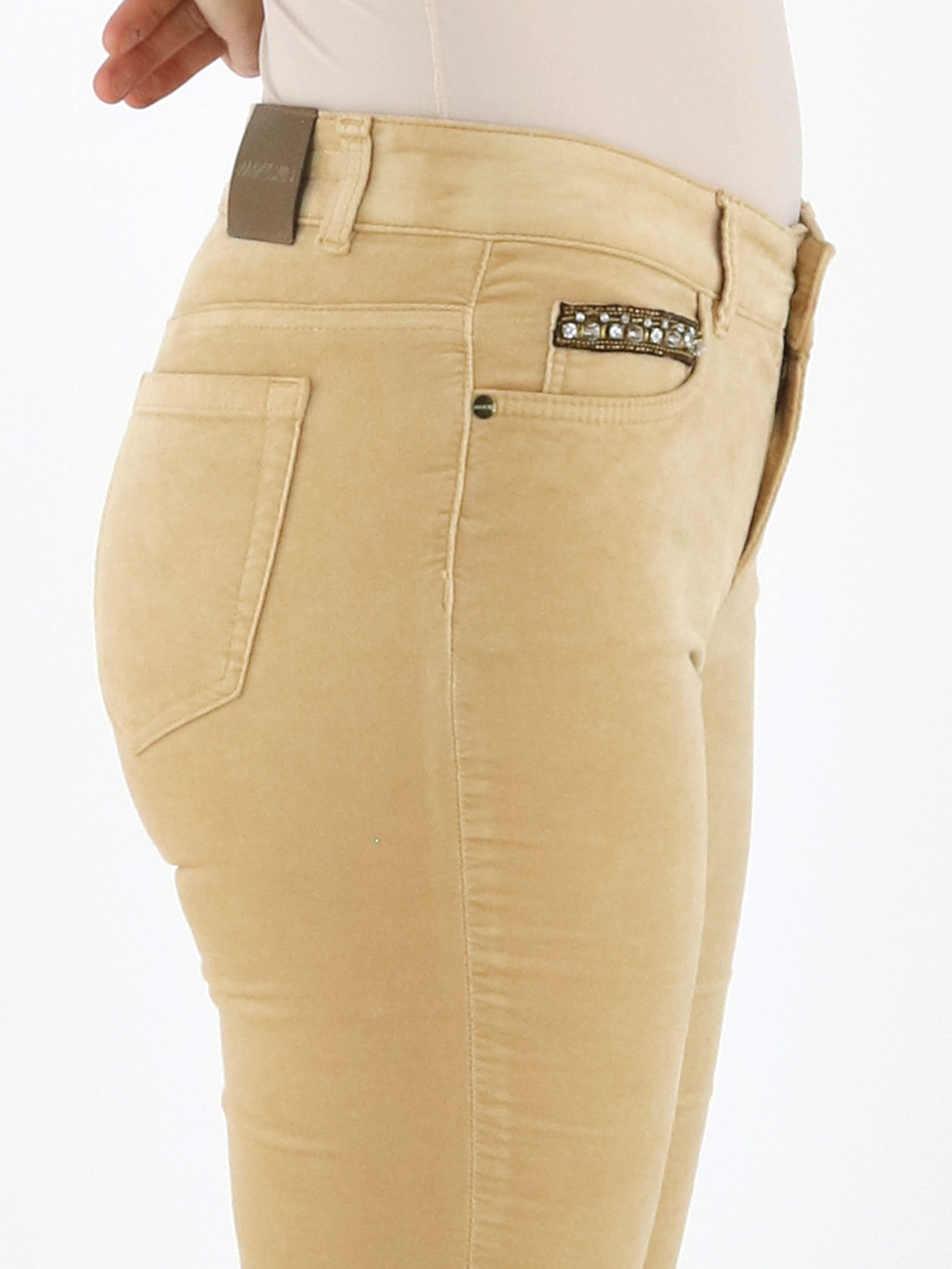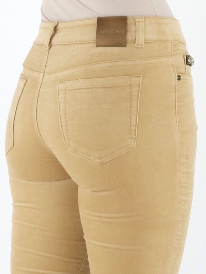 Pantalon en velours de Marc Cain dans une teinte camel. Conçu dans un style 5 poches, orné de strass le long du bord de la petite poche avant. Ce pantalon peut être lavé à 30 degrés.