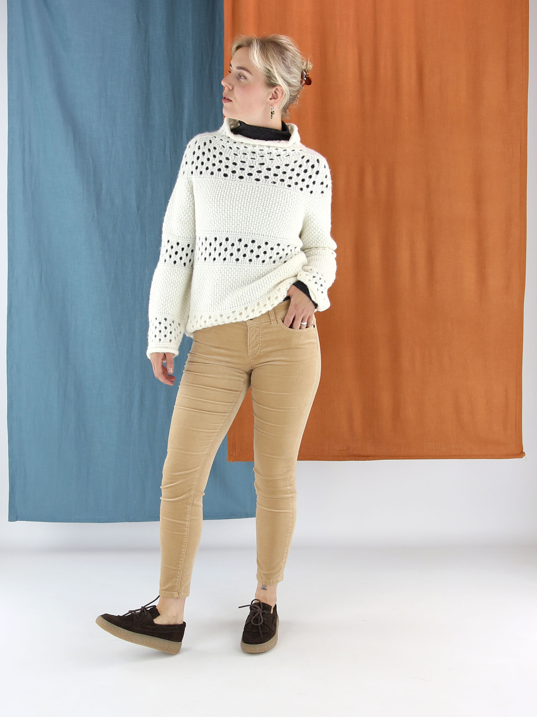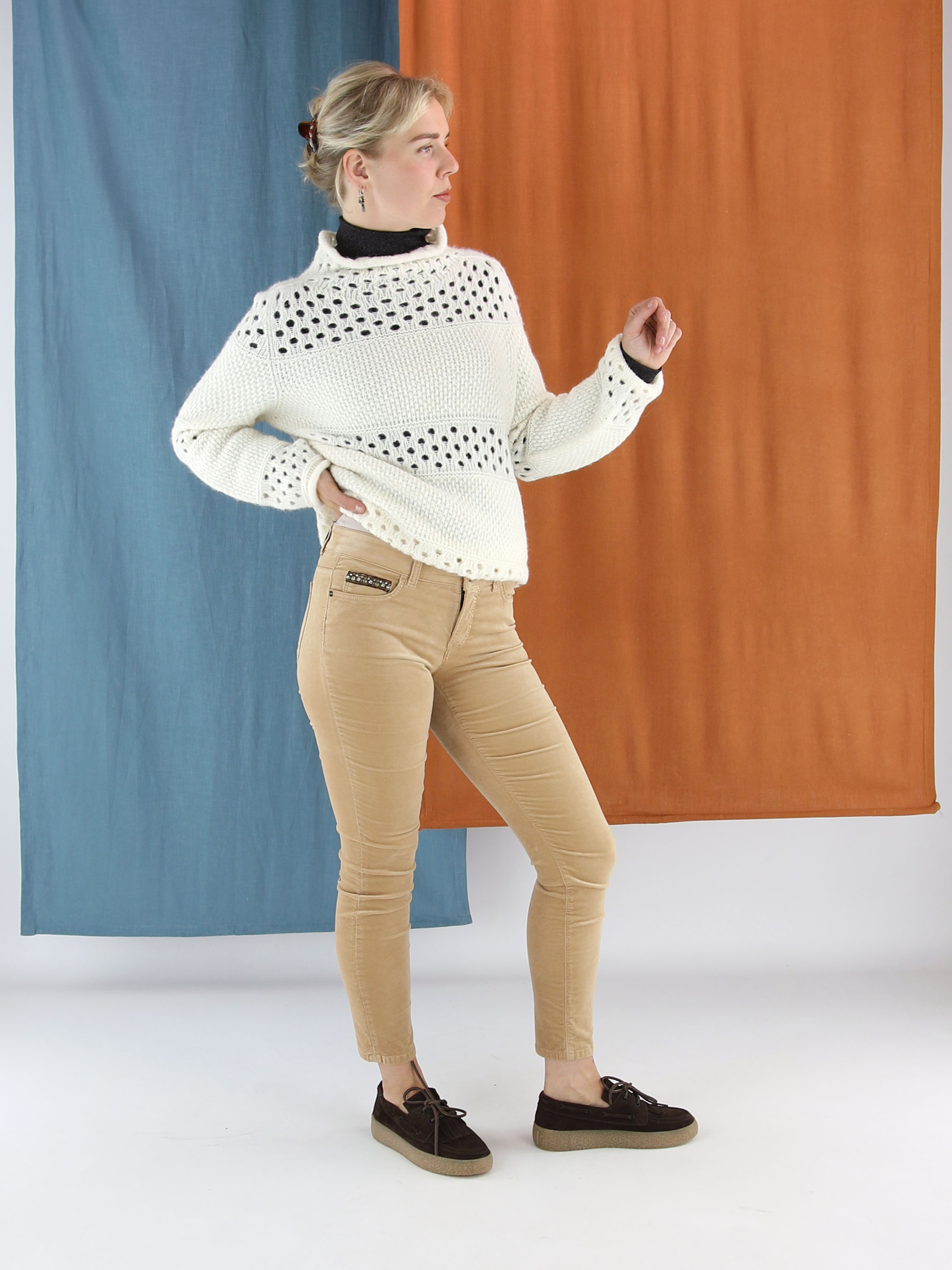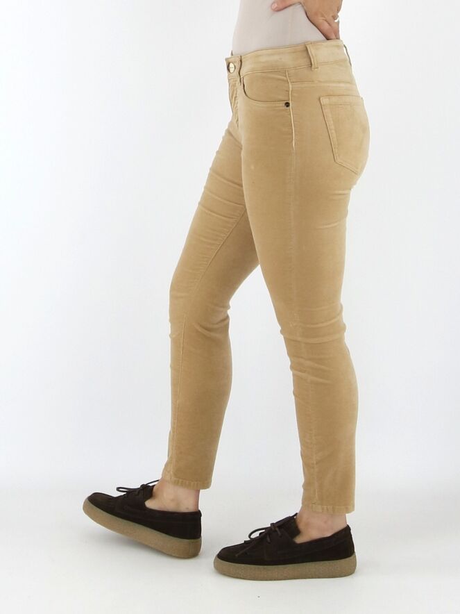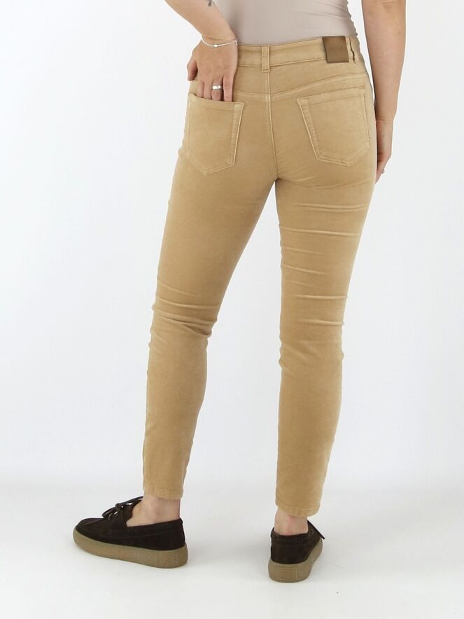 Pantalon en velours de Marc Cain dans une teinte camel. Conçu dans un style 5 poches, orné de strass le long du bord de la petite poche avant. Ce pantalon peut être lavé à 30 degrés.