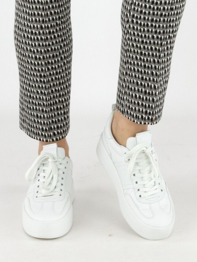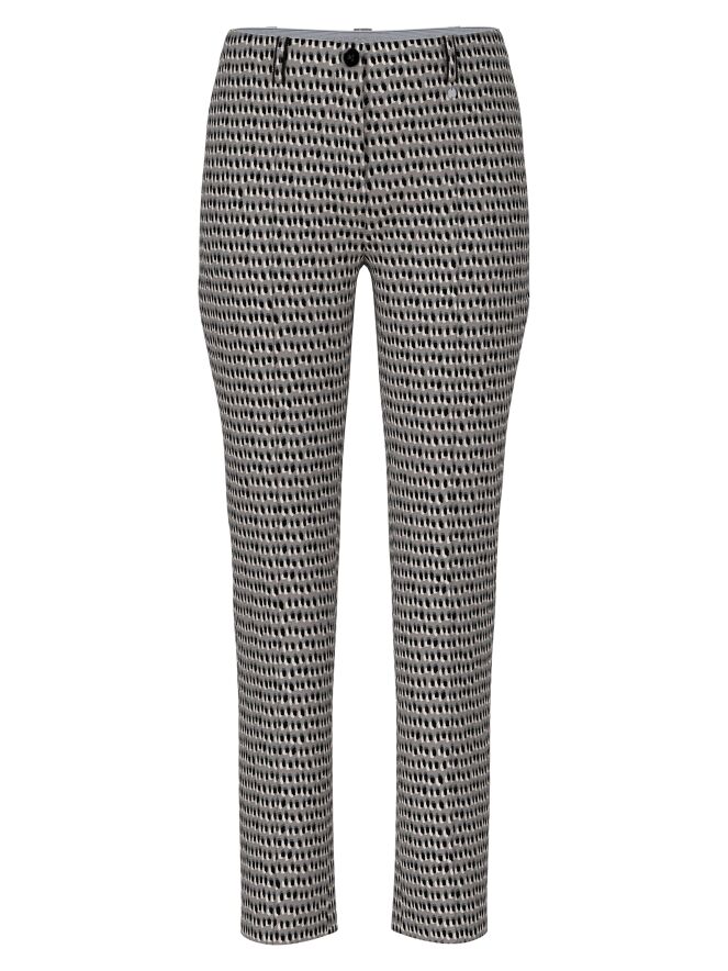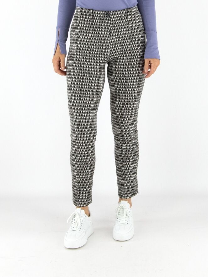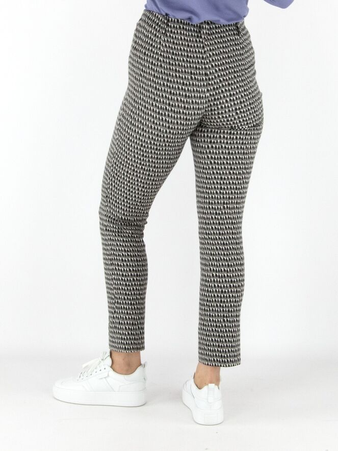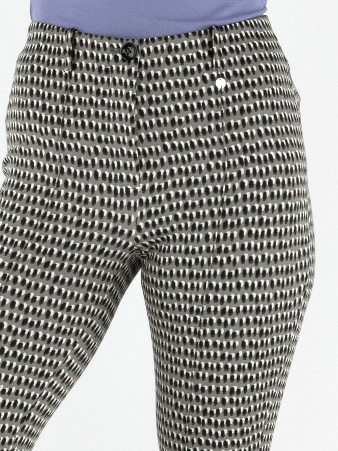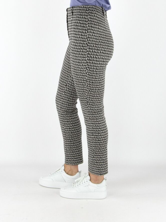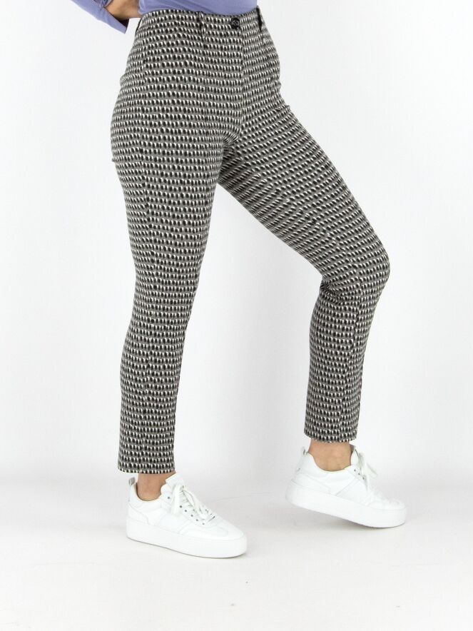Pantalon Marc Cain en qualité scuba avec un imprimé à pois noirs et blanc cassé sur fond gris. La taille est élastiquée et une couture inversée traverse le centre des jambes. Ce pantalon peut être lavé à 30 degrés.