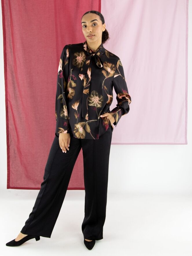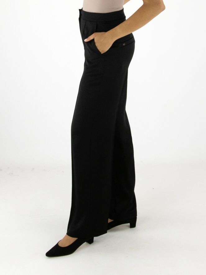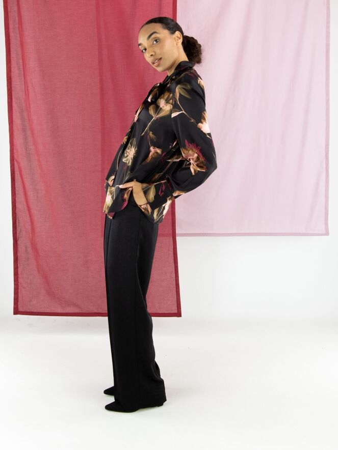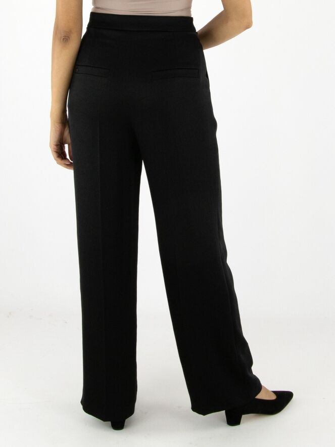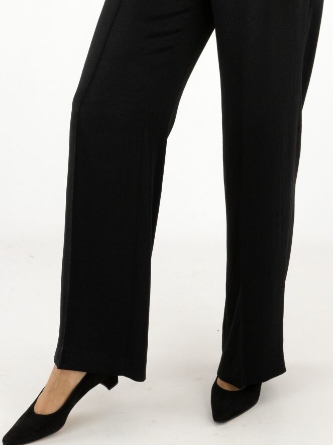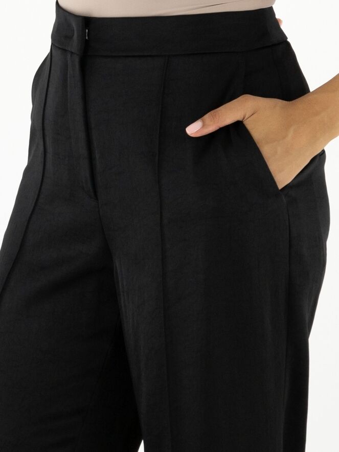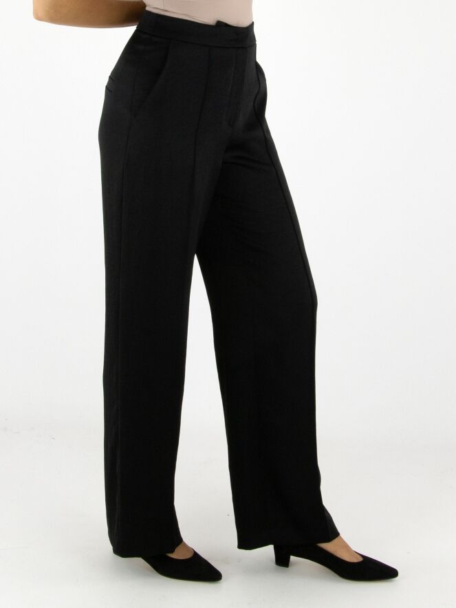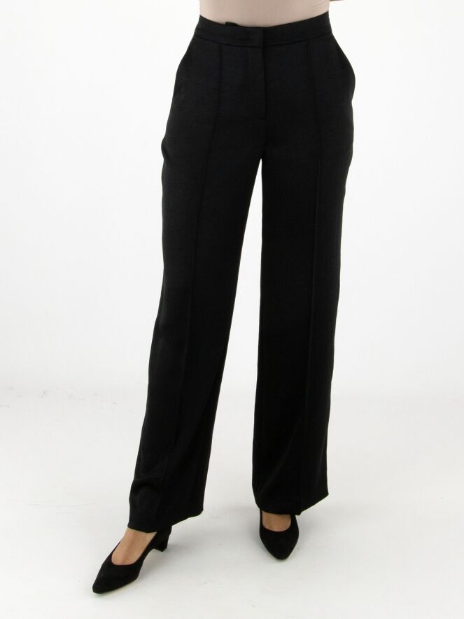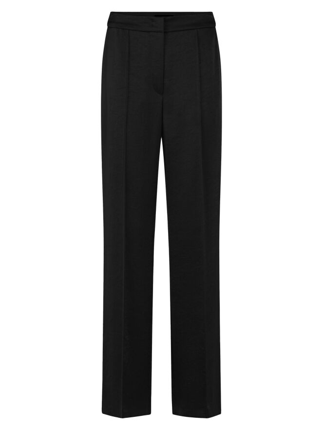 Pantalon en satin mat de Marc Cain, en noir. Une couture inversée traverse le devant des jambes, tandis qu’un pli marqué est présent à l’arrière. Le pantalon est doté de poches italiennes et peut être lavé à 30 degrés.