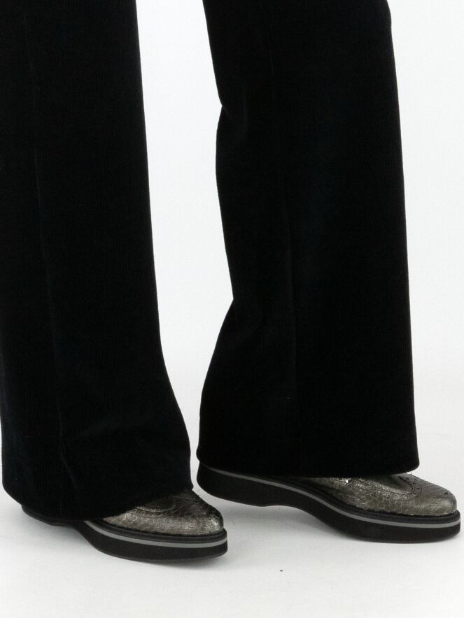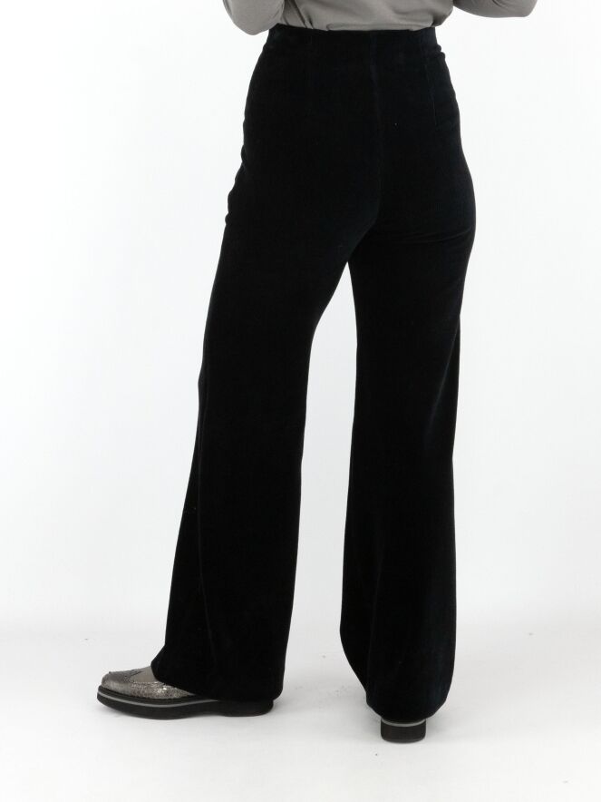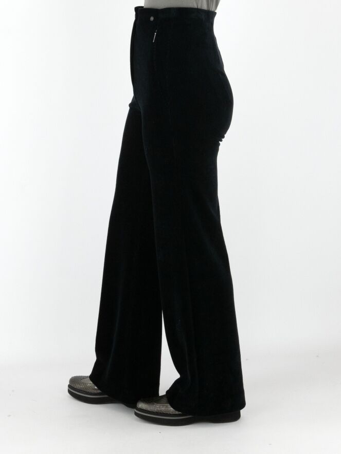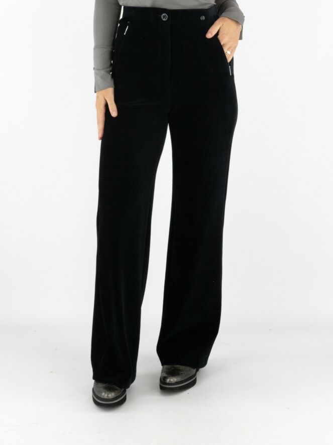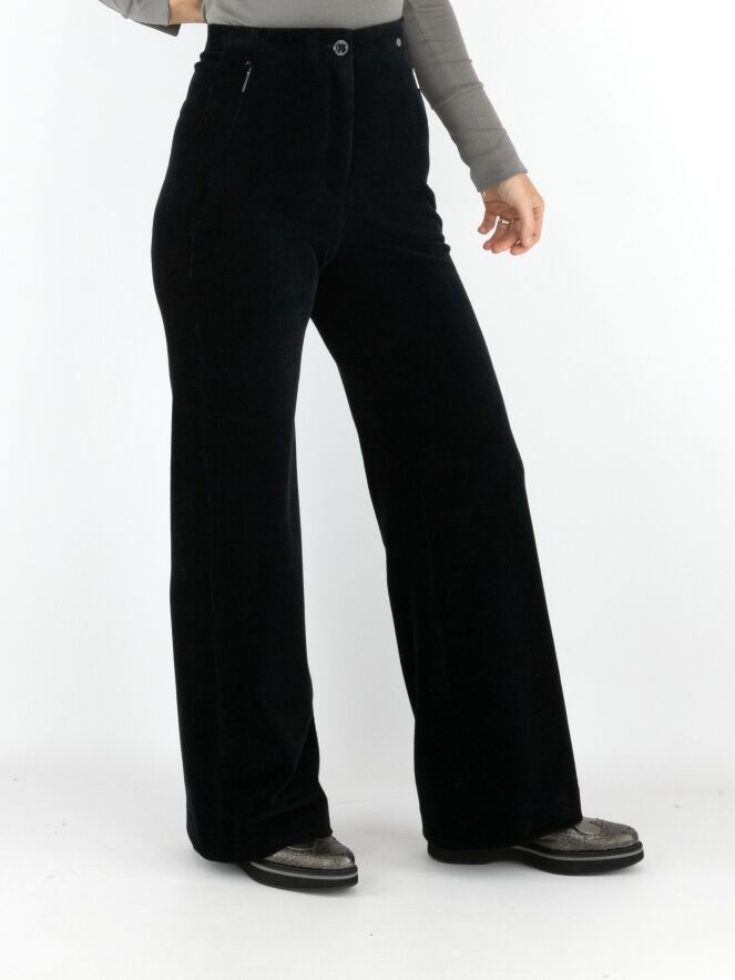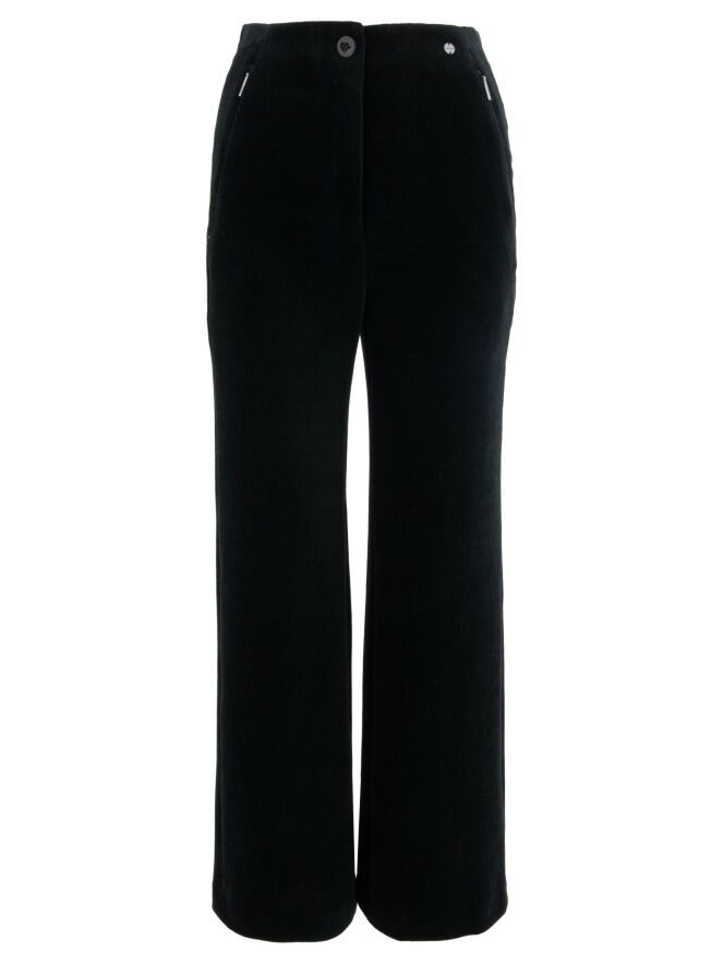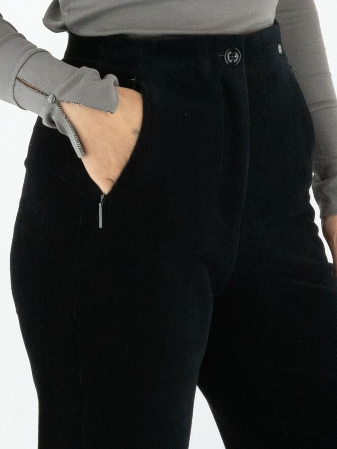Un pantalon en velours côtelé de Marc Cain dans un élégant noir. Conçu avec des jambes droites et des poches latérales zippées, il offre un style moderne et raffiné. Ce pantalon peut être lavé à 30 degrés.