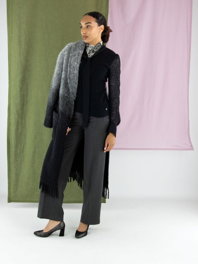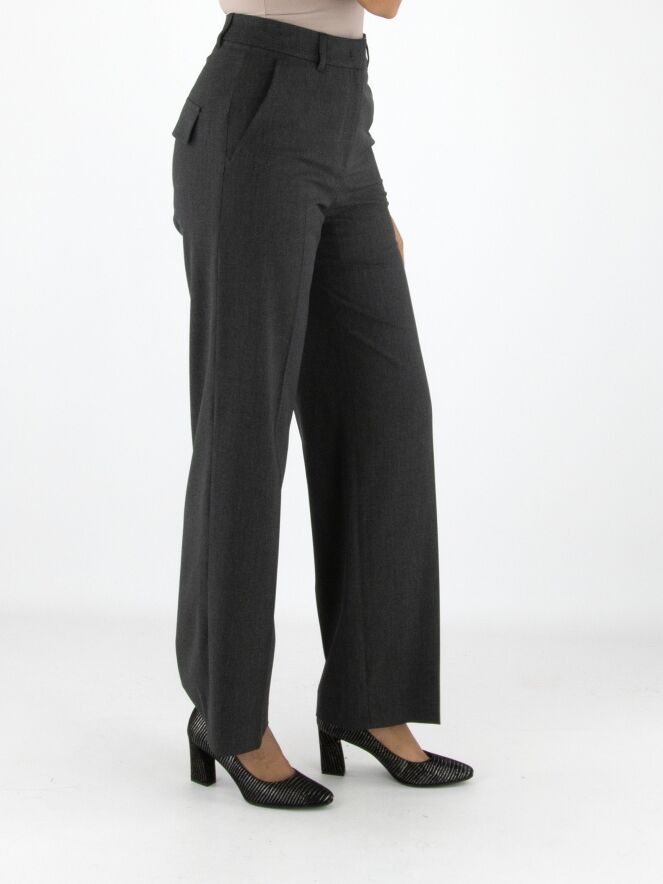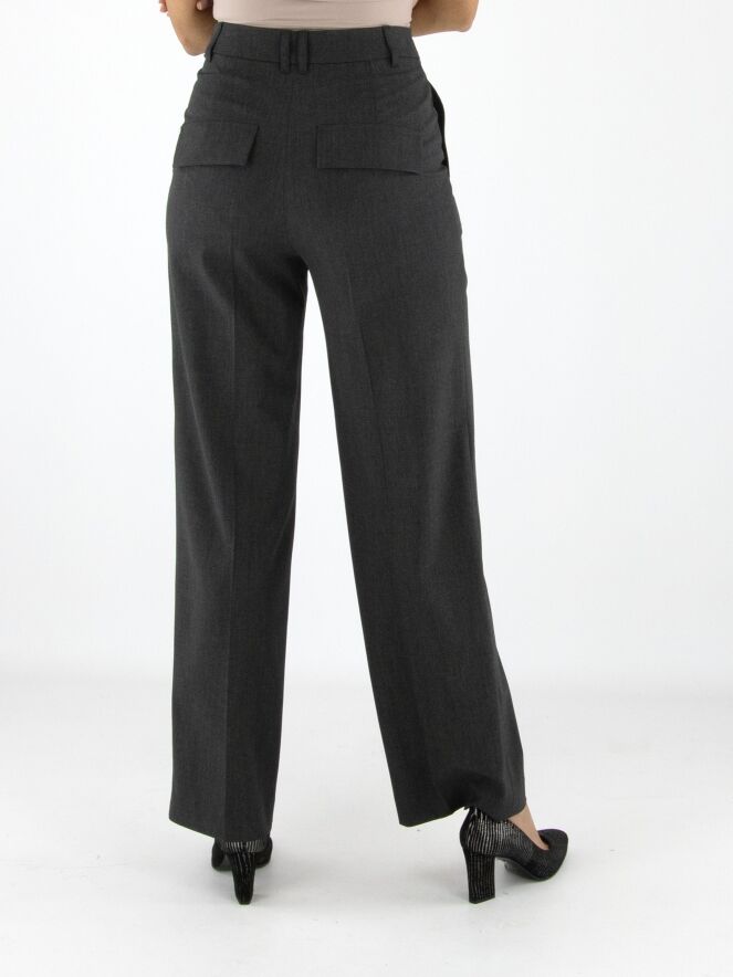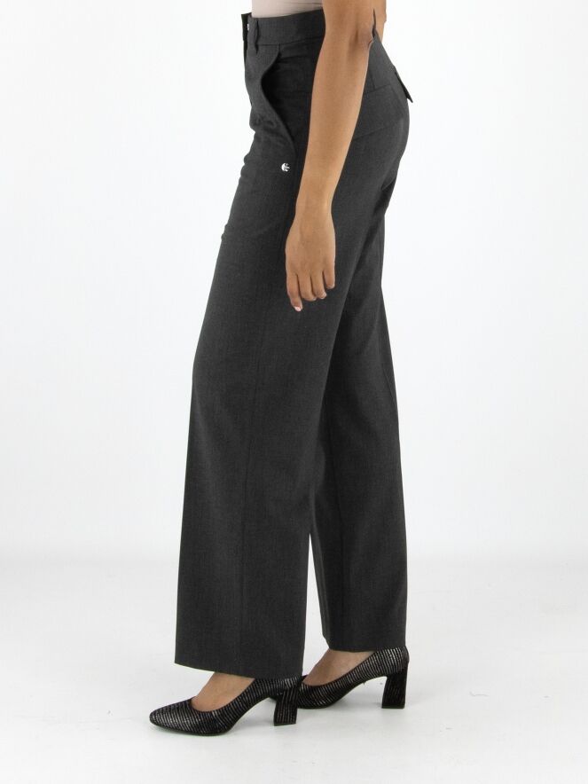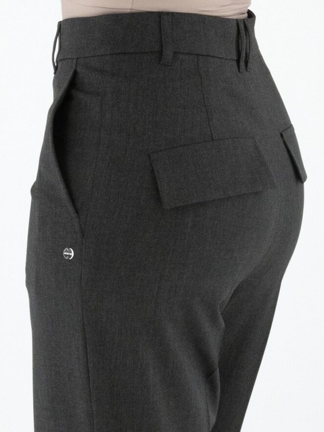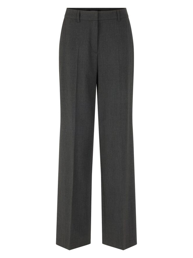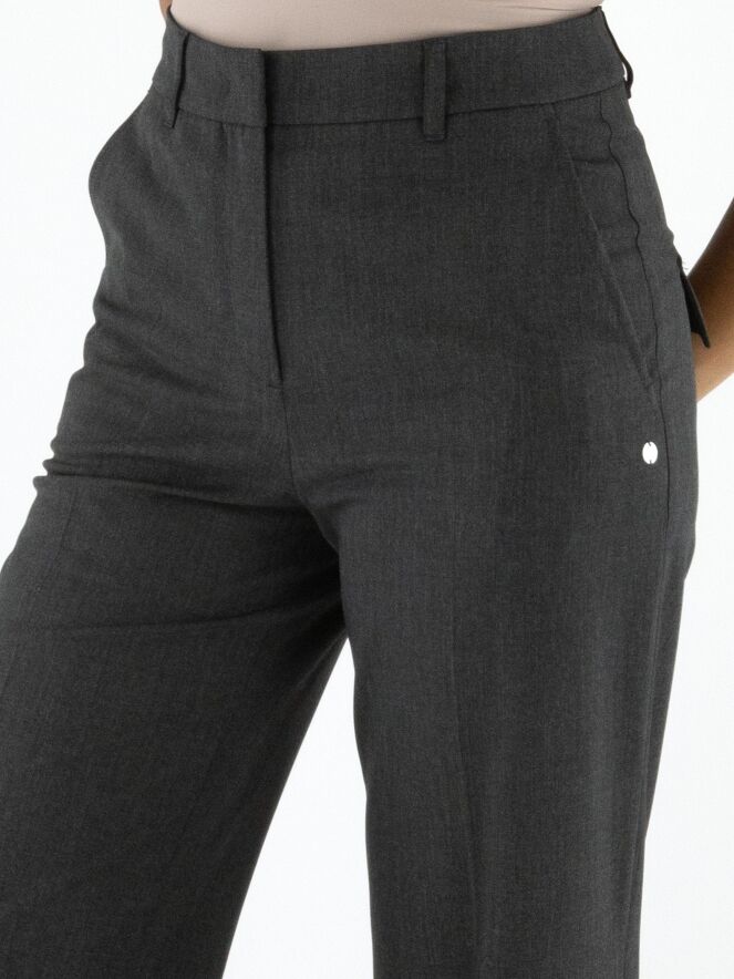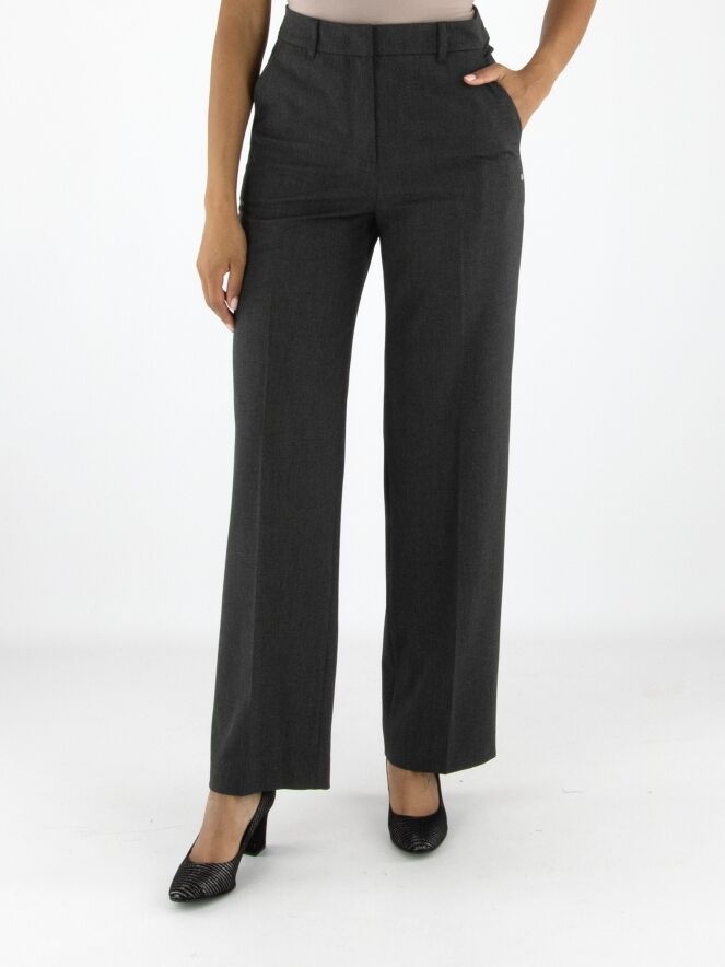Pantalon droit signé Marc Cain en gris raffiné. Un pli repassé au centre des jambes apporte une allure élégante et soignée. Le pantalon est doté de poches italiennes et peut être lavé à 30 degrés.