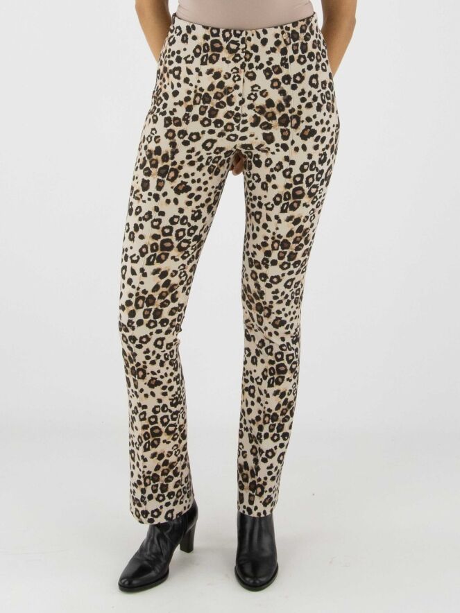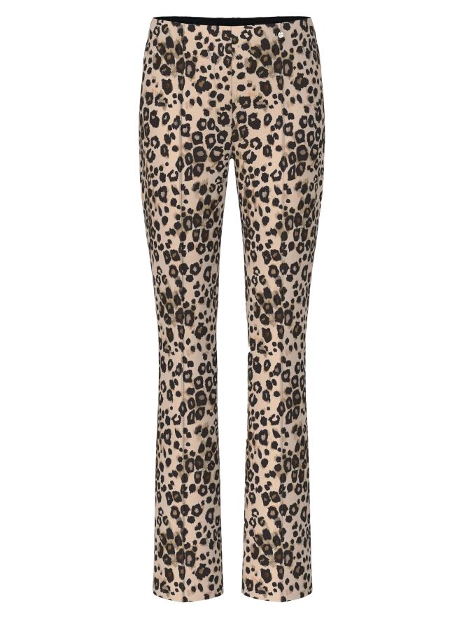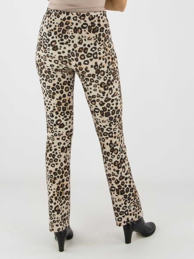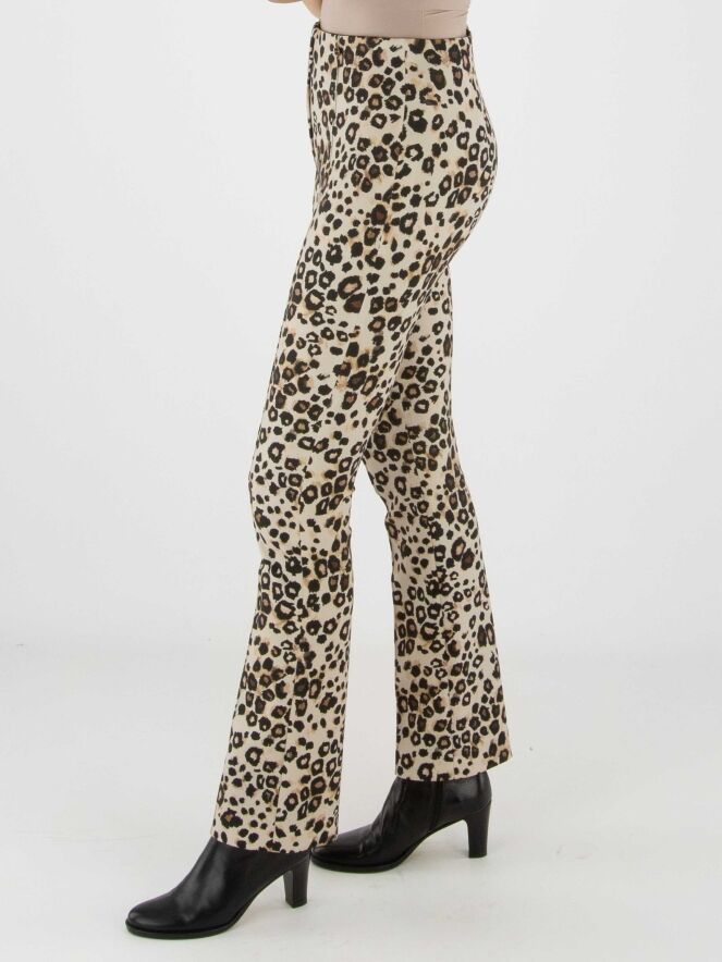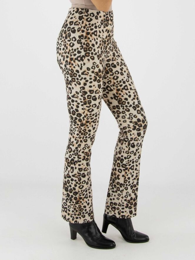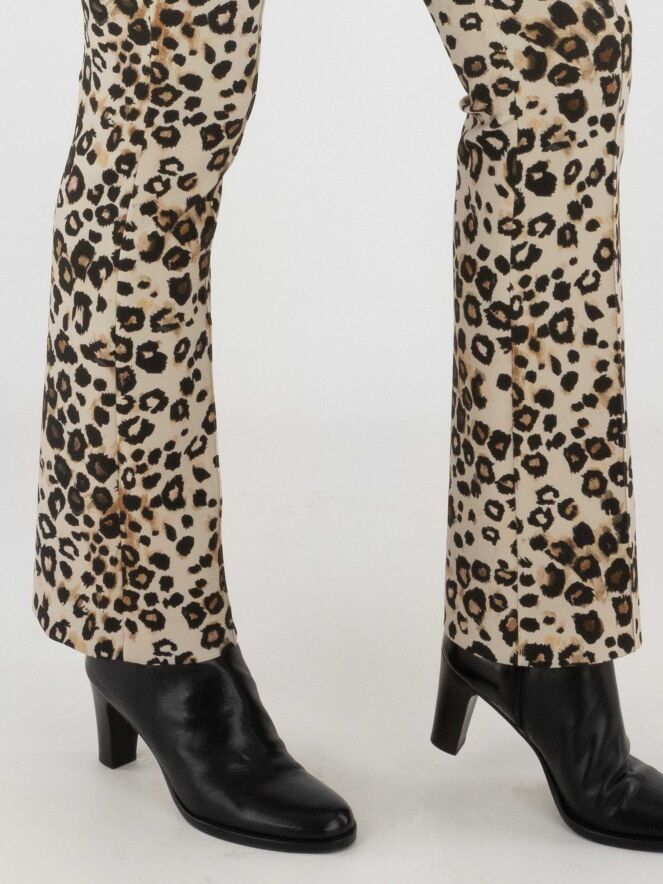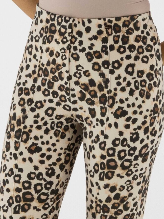 Un pantalon en tissu scuba de Marc Cain à imprimé léopard dans plusieurs tons de brun et de noir sur un fond sable. La taille est élastiquée et une couture inversée traverse le centre des jambes. Ce pantalon peut être lavé à 30 degrés.