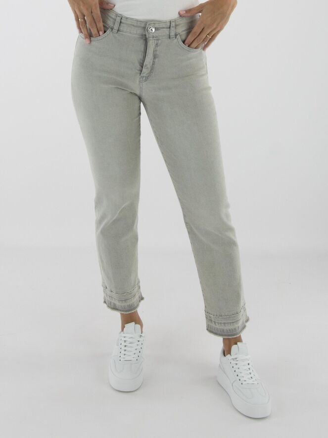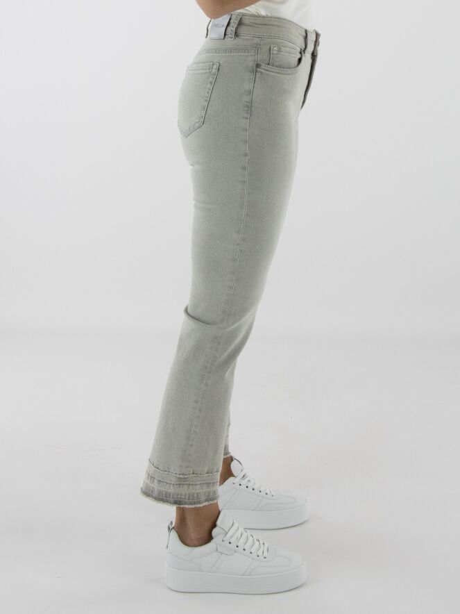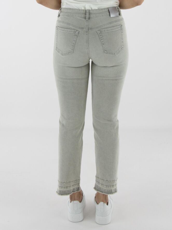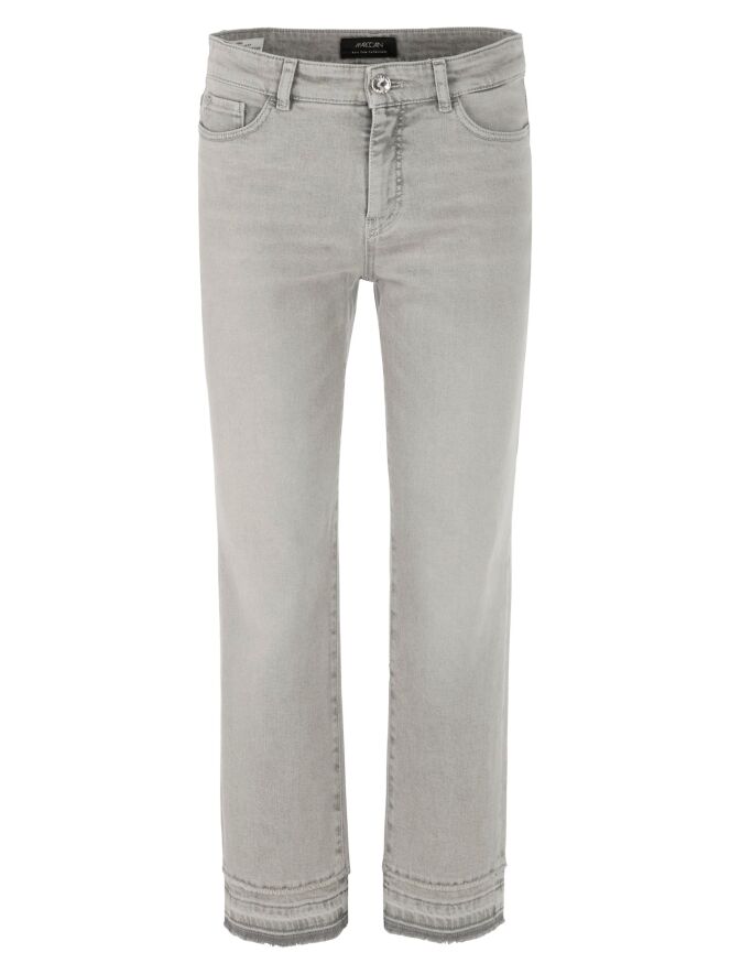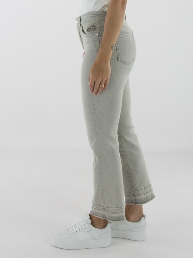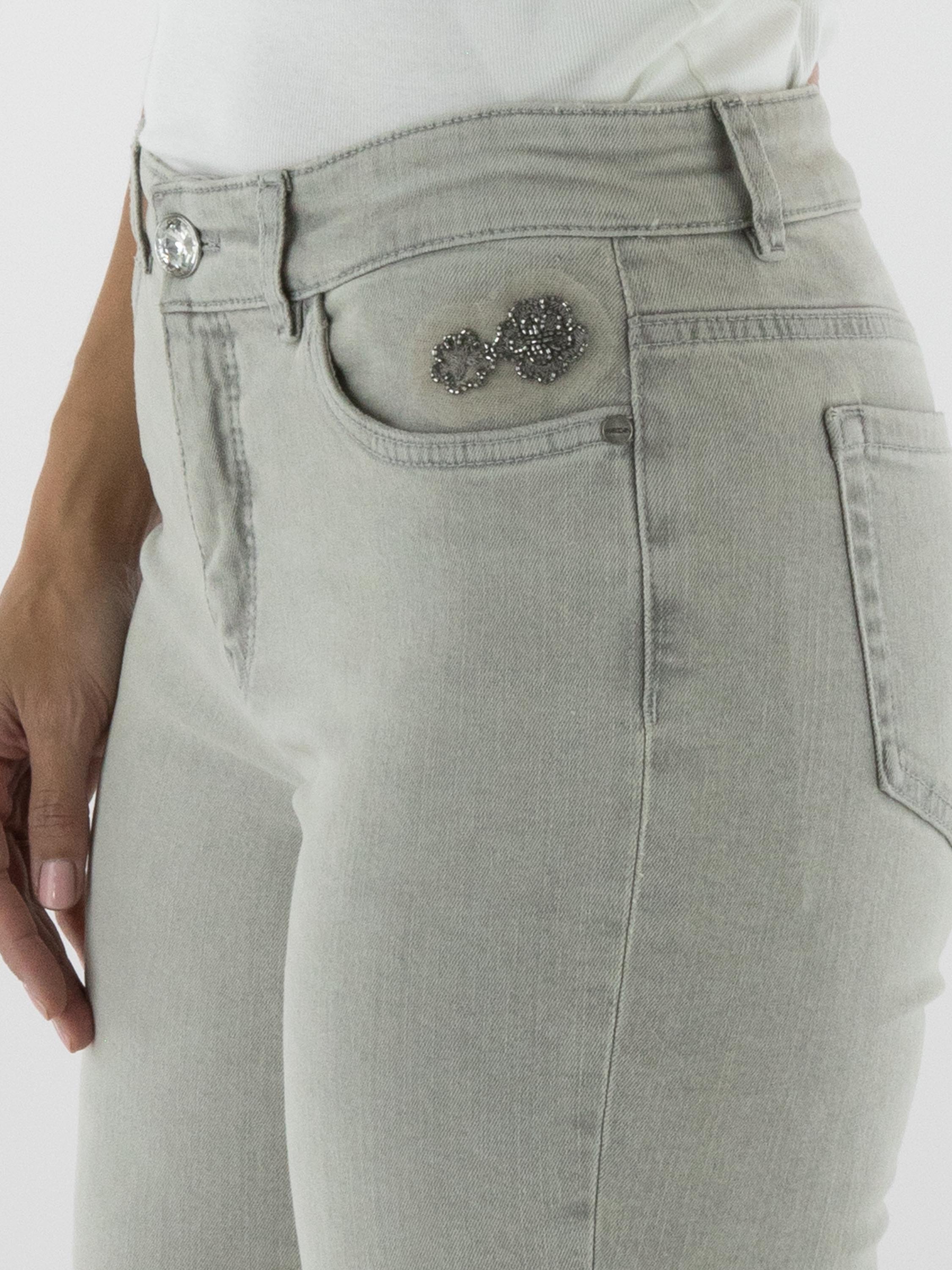 Un jean de Marc Cain en gris clair. Le modèle est conçu dans une coupe 5 poches classique. Sur la poche avant gauche, un motif en strass représente deux fleurs. Environ dix centimètres au-dessus de l’ourlet finement effiloché, une couture entoure la jambe avec un léger effet effiloché. Ce jean peut être lavé à 30 degrés.