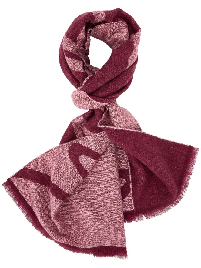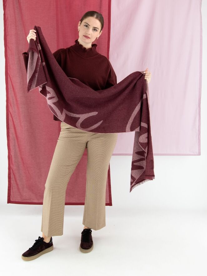 Une écharpe de Marc Cain de couleur lilas. Le texte « MARC CAIN » est intégré dans l’écharpe. Les extrémités de l’écharpe sont légèrement effilochées. Cette écharpe peut être lavée à la main.