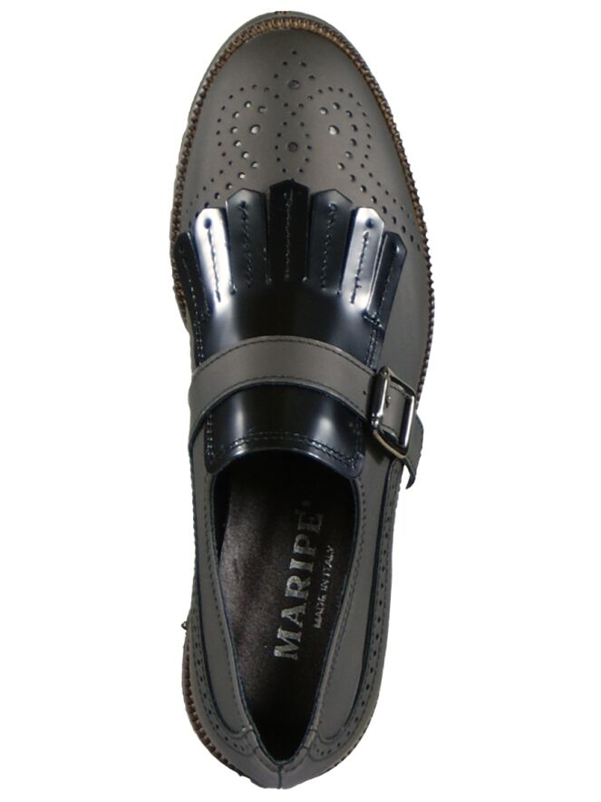 Mocassin de la marque Maripé, en cuir mat couleur taupe. L'avant-pied est dans un design Brooks. La languette en cuir vernis noir du dessus est recouverte d'une jolie boucle sur le coup du pied. La chaussure est bordée de cuir avec une semelle antidérapante. Intérieur doublé cuir.