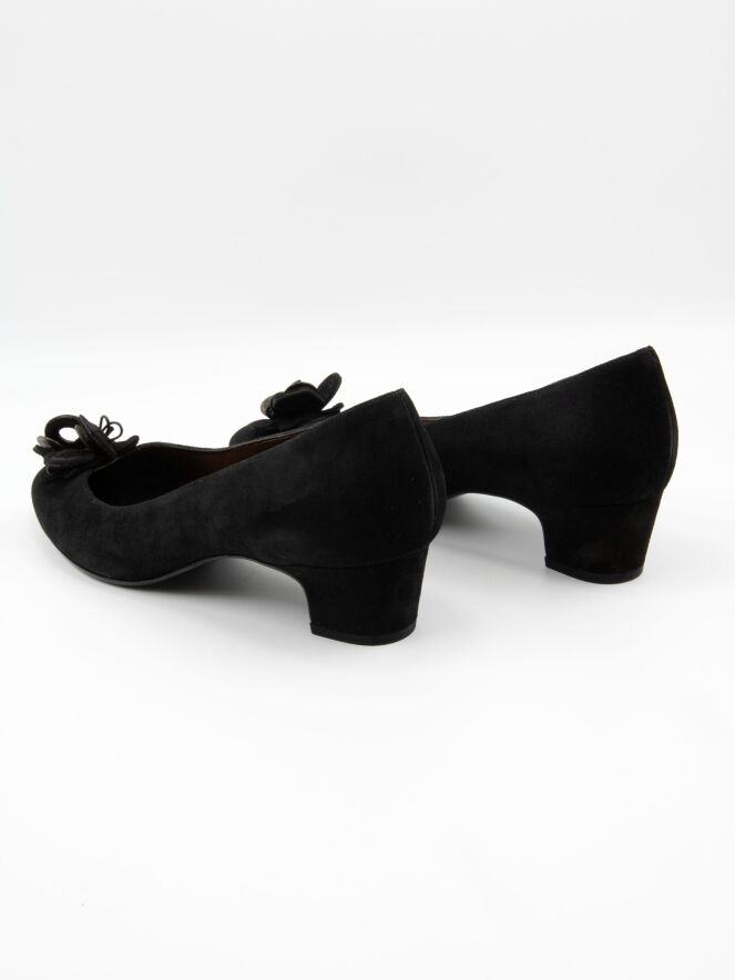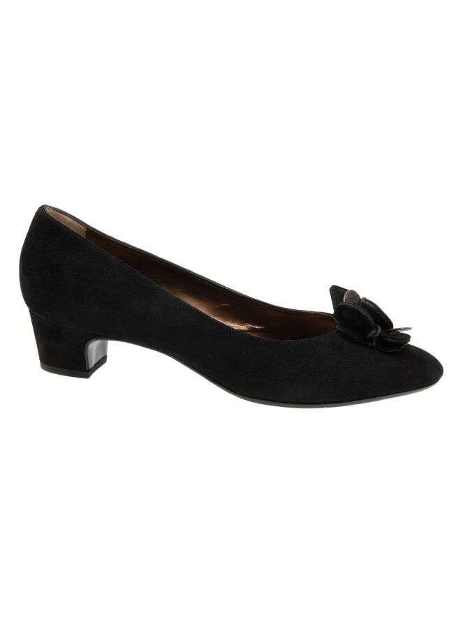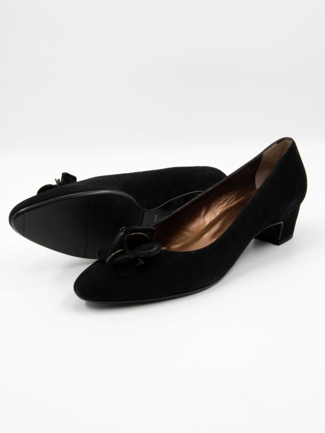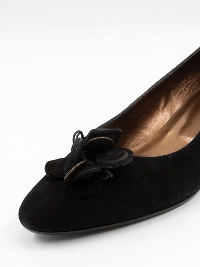 Un escarpin de Mauro Teci en noir. L'escarpin présente un bout fin et une fleur décorative sur l'avant-pied composée de pièces de monnaie couleur cuivre et de morceaux de cuir. Le talon est revêtu de suède. L'intérieur est doublé de cuir.