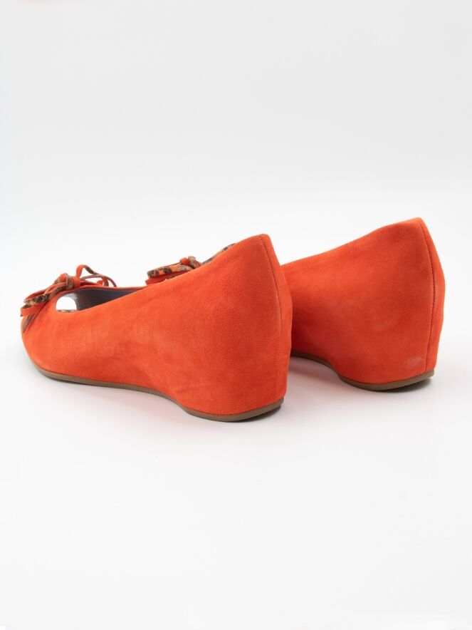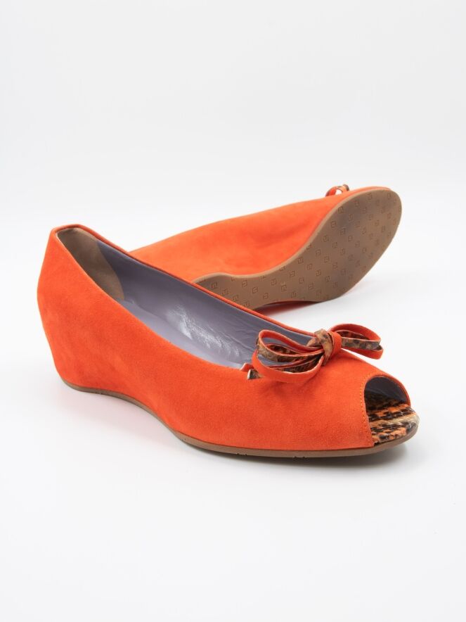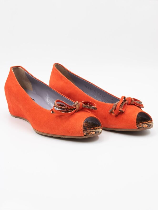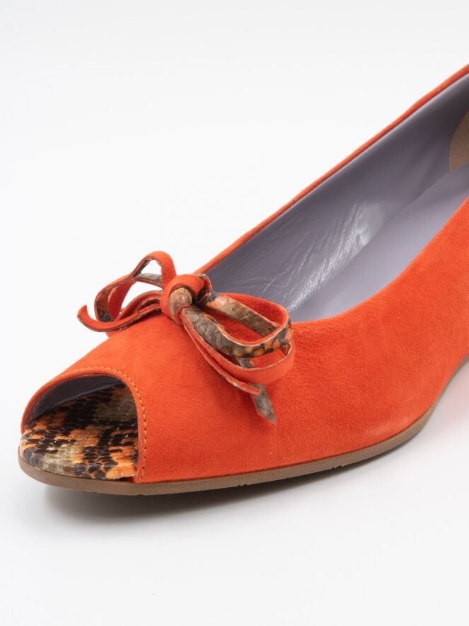 Un escarpin à bout ouvert de Mauro Teci en couleur orange. L'escarpin présente un talon compensé et la semelle près de l'orteil ouvert est recouverte de cuir à imprimé python. Un petit nœud est présent sur l'avant-pied. L'intérieur est doublé de cuir.