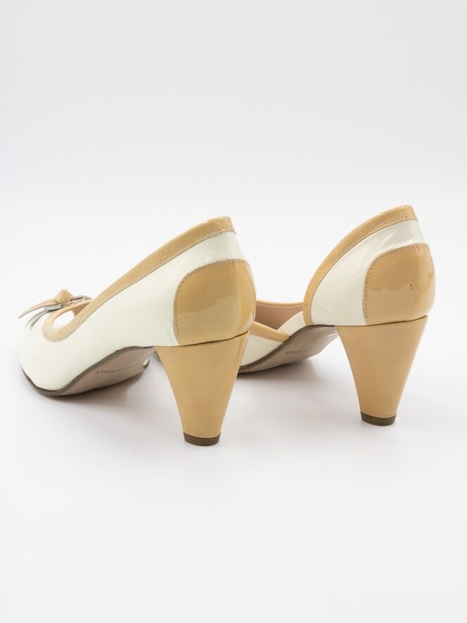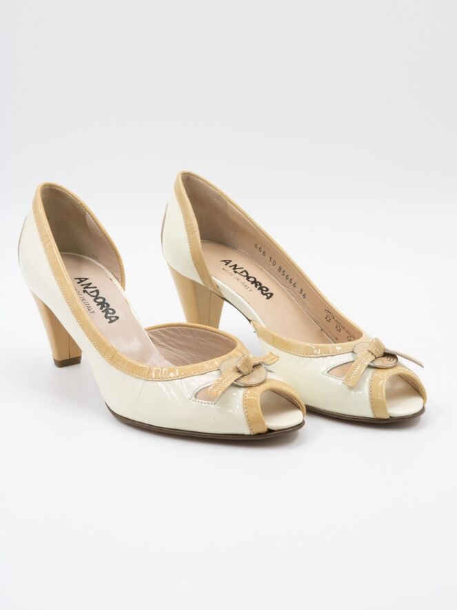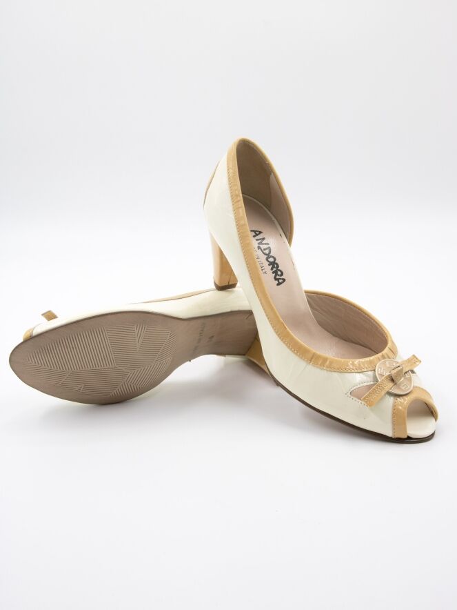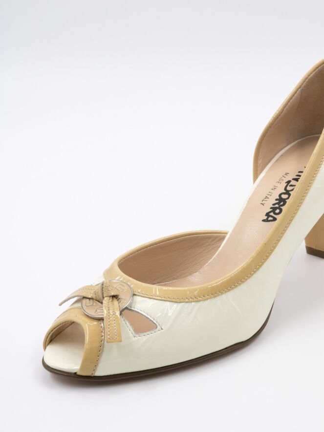 Un escarpin à bout ouvert de Mauro Teci en cuir verni froissé blanc crème. Le long du bord de l'orteil ouvert et de l'escarpin lui-même, il y a une garniture vernie de couleur camel. L'intérieur de l'escarpin est ouvert. Le talon est couvert de cuir verni couleur camel. L'intérieur est doublé de cuir.