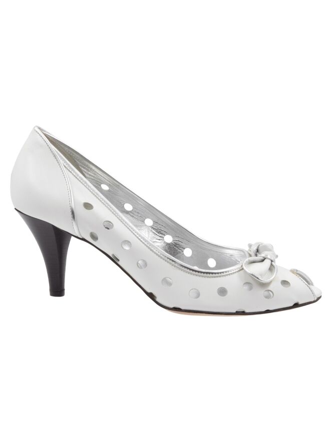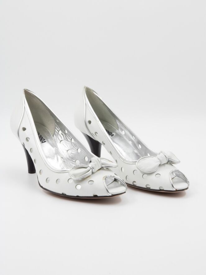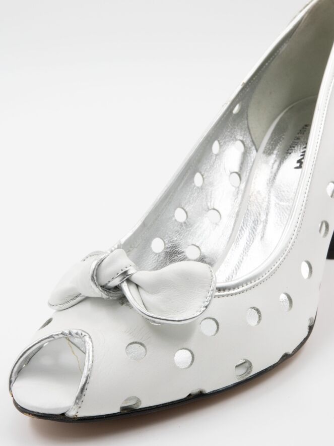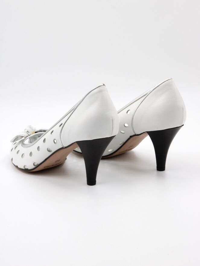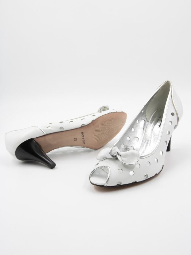 Un escarpin à bout ouvert de Mauro Teci en blanc. Sur l'avant-pied, il y a un petit nœud blanc avec des liserés argentés le long des bords. Les bords de la tige et de l'orteil ouvert sont ornés d'une garniture argentée. Le cuir est perforé de cercles. L'escarpin possède un talon noir élancé et l'intérieur est doublé de cuir.