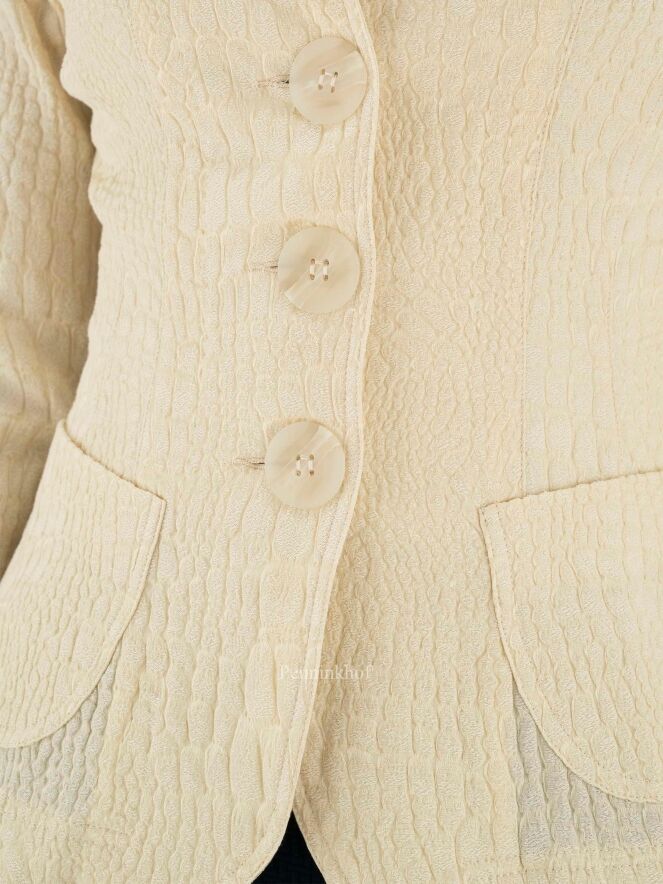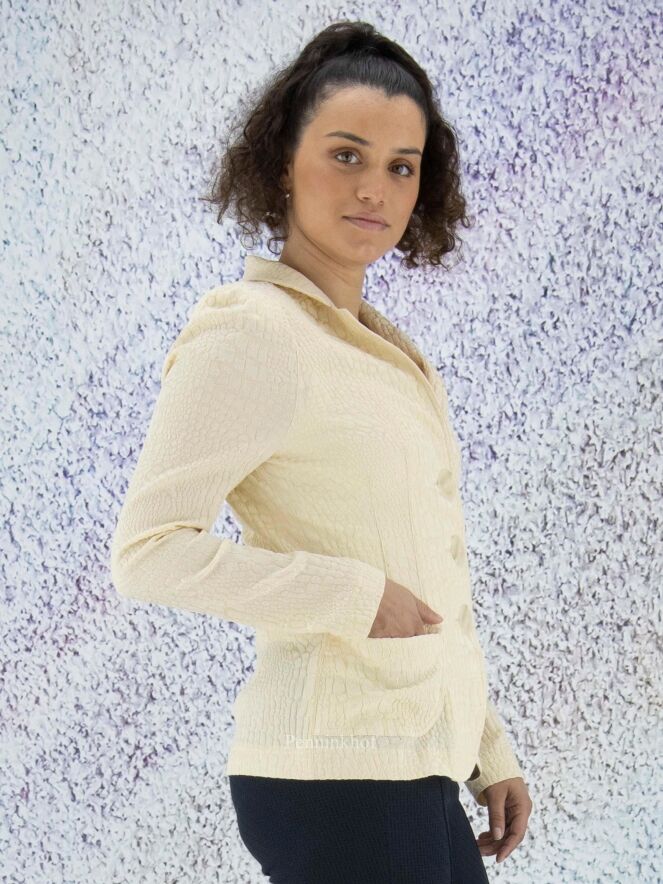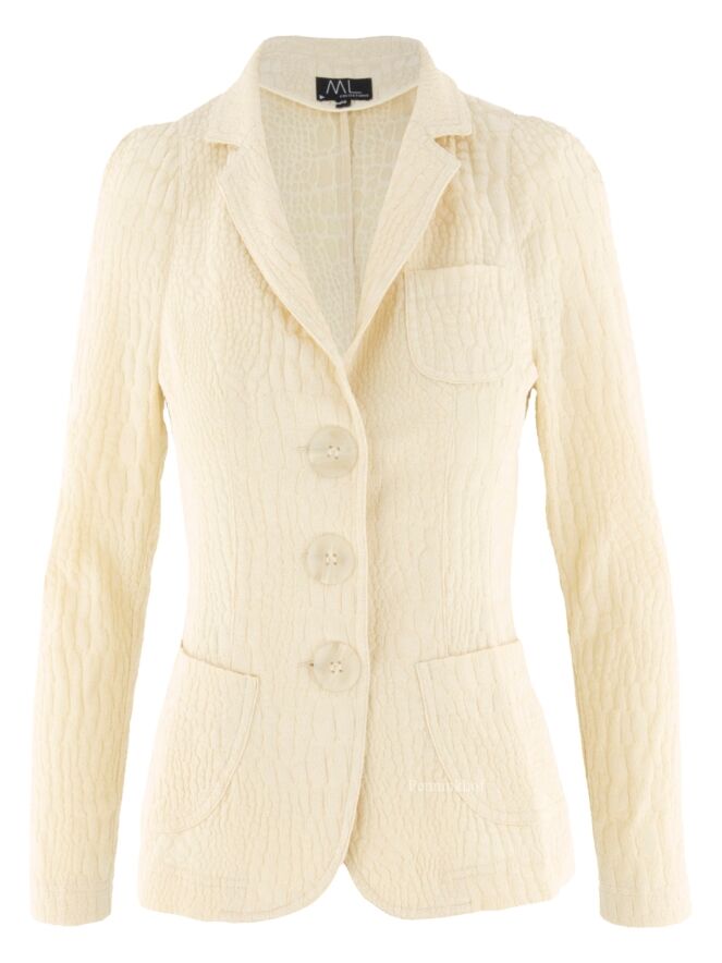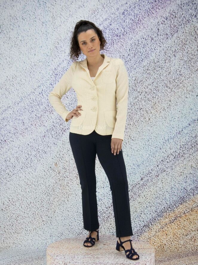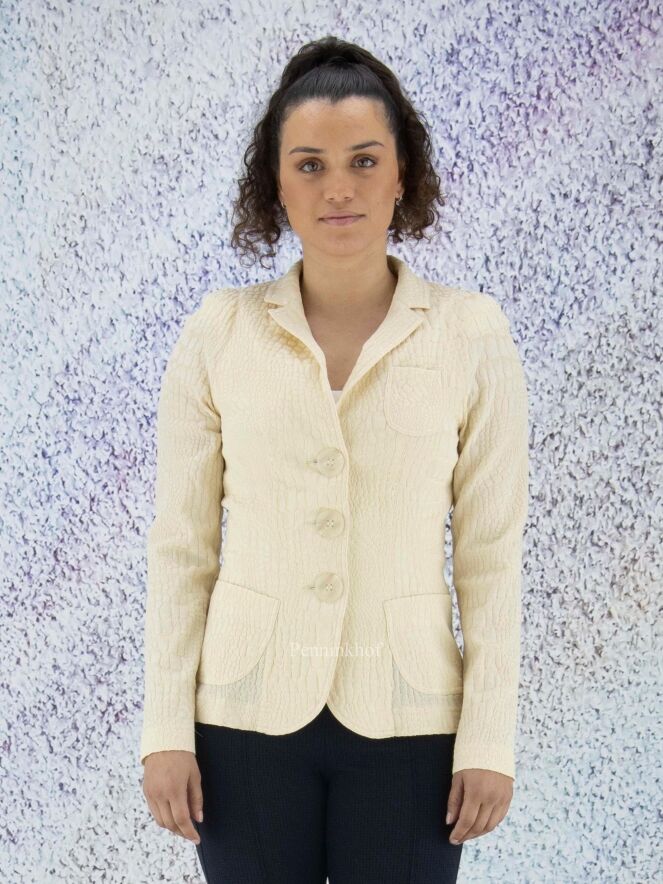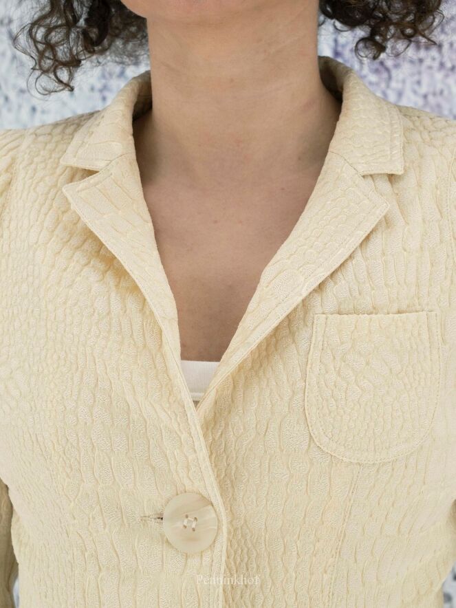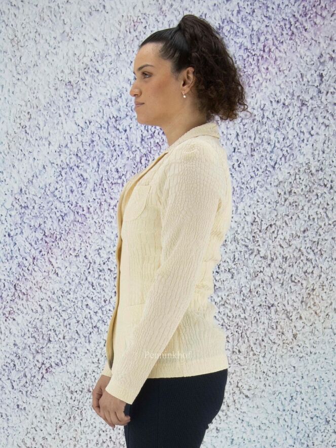 Veste de la marque ML Collections, de couleur jaune doux. Le tissu est dans une structure nervurée. Le blazer ferme à l'aide de trois boutons. La veste est dotée de deux poches avant plaquées arrondies et d'une poche poitrine. Modèle non doublé. Lavage déconseillé.