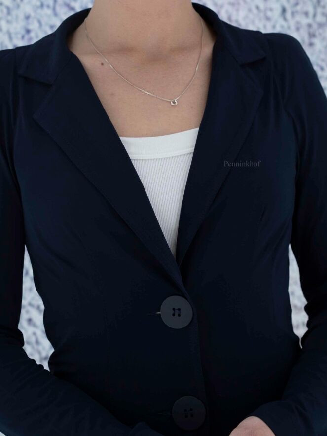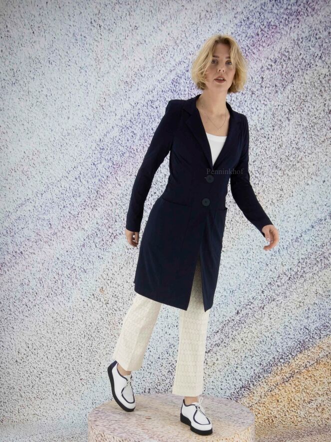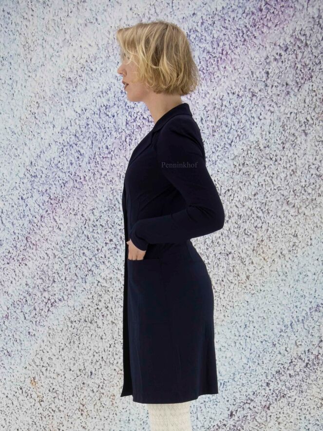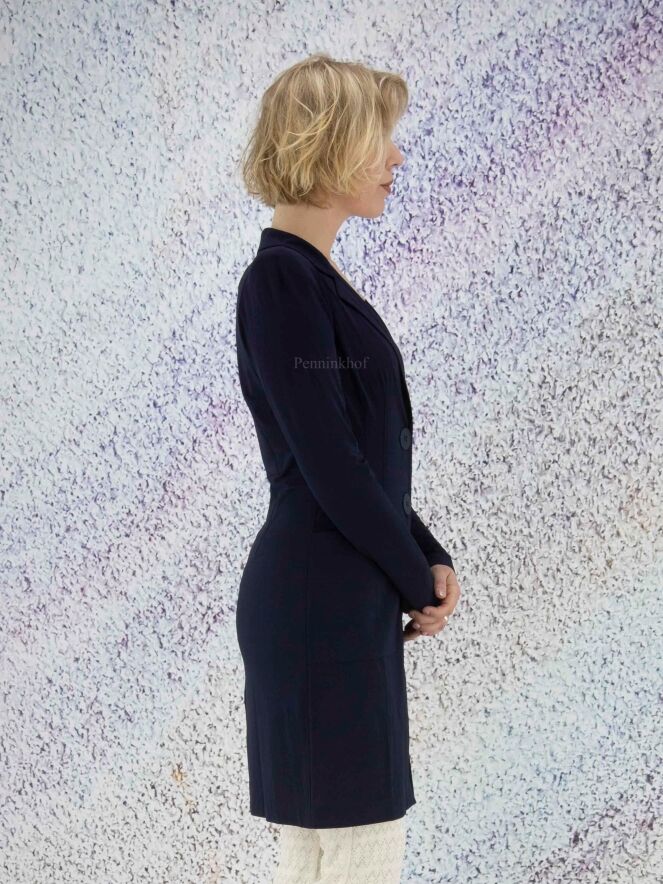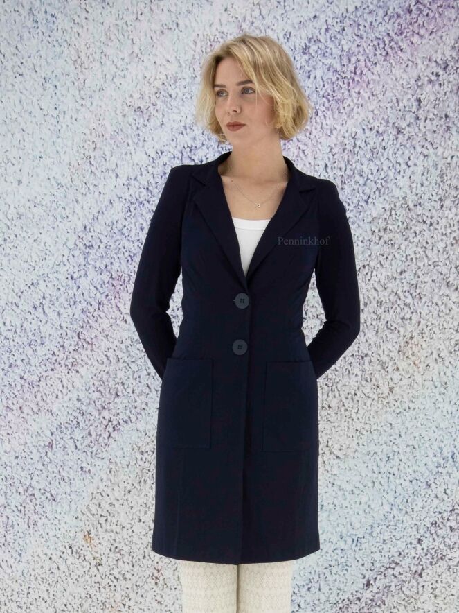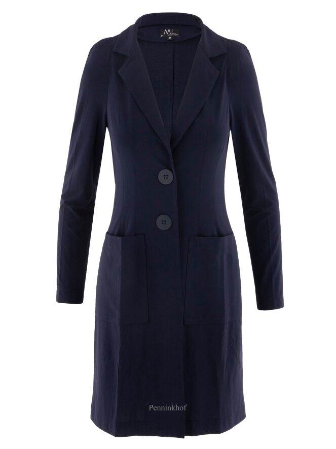 Veste longue de la marque ML Collections, de couleur bleu marine. La veste présente une fermeture à deux gros boutons et n'est pas doublée. Elle est dotée de deux grandes poches avant. Lavage déconseillé.