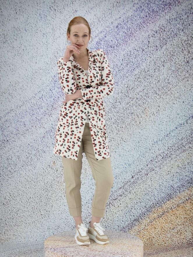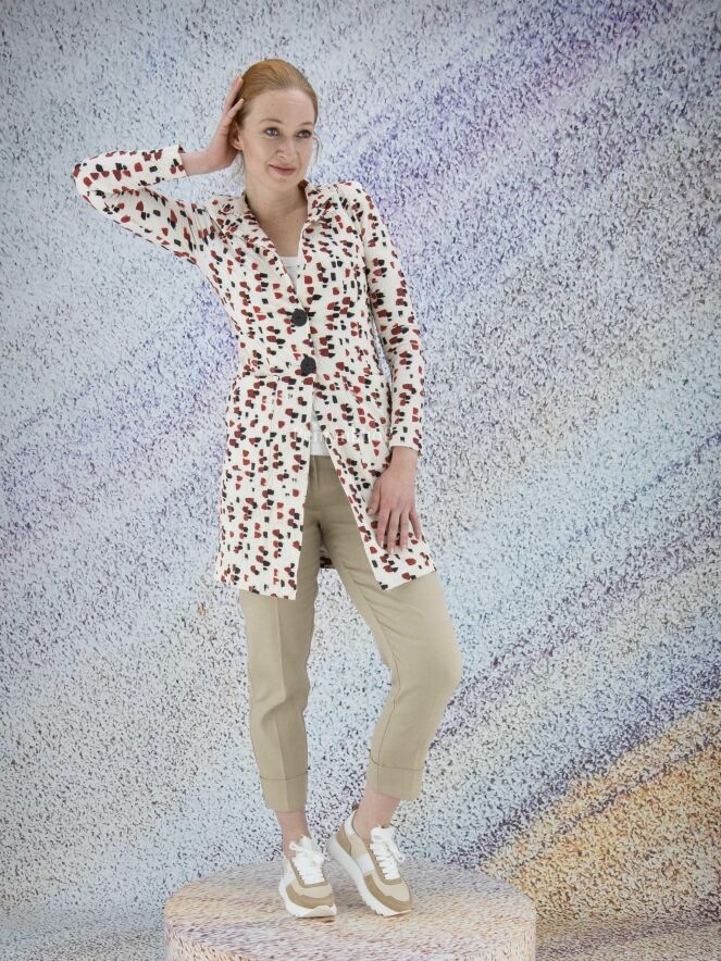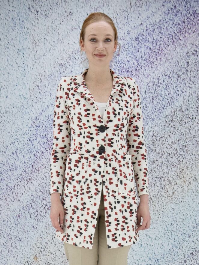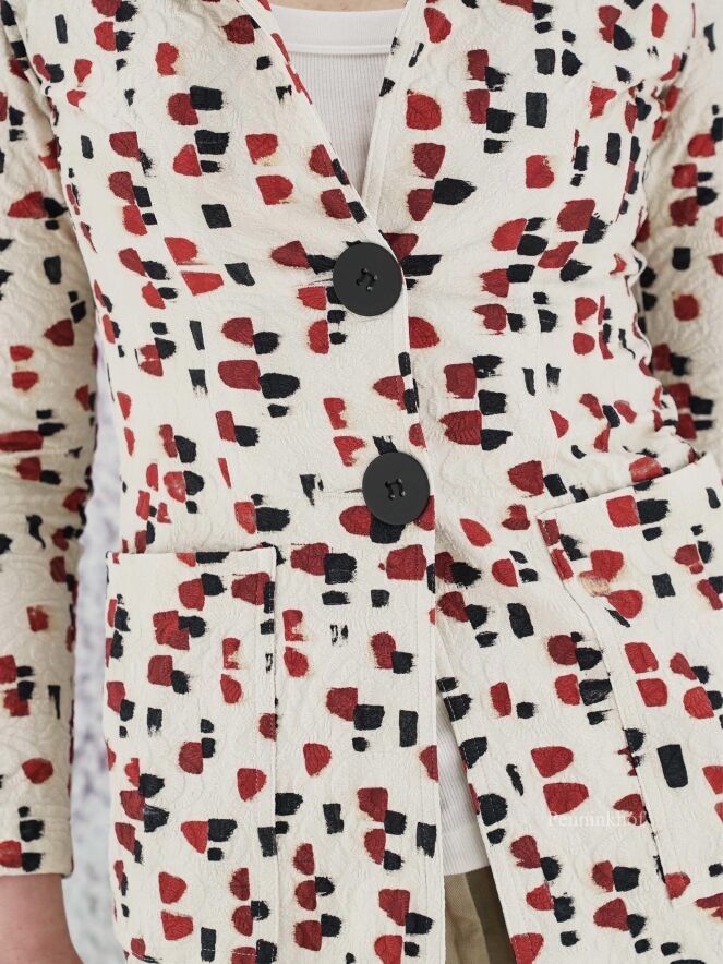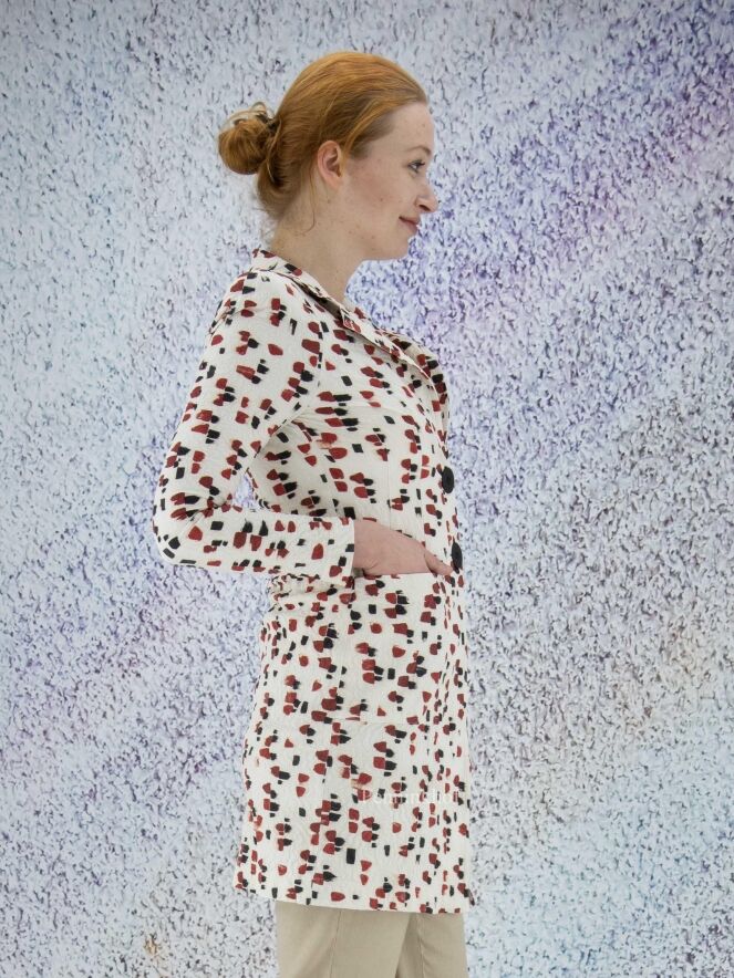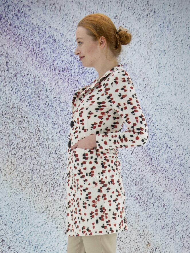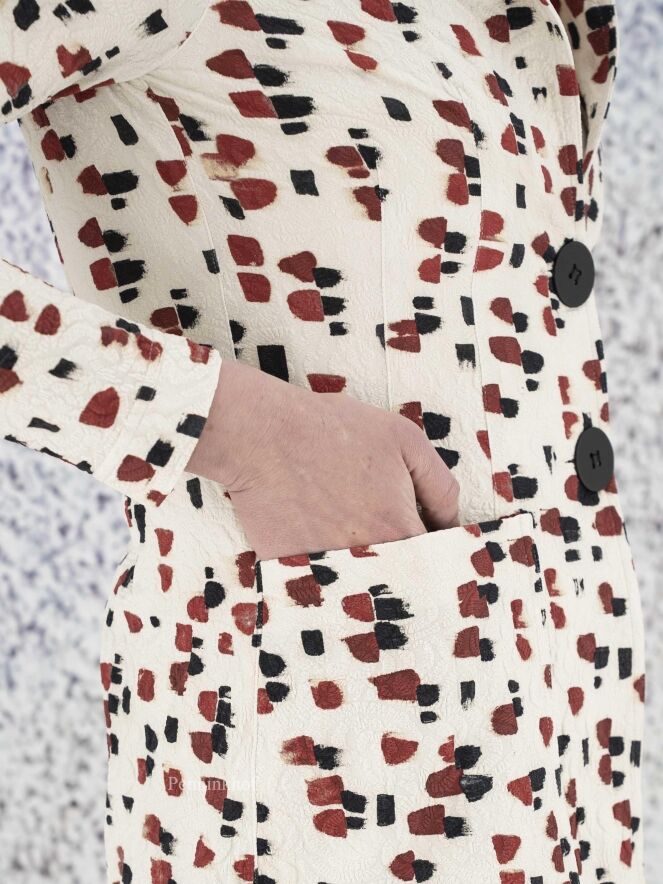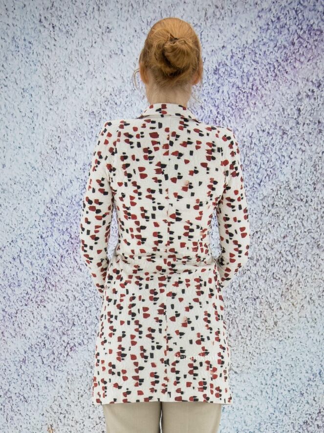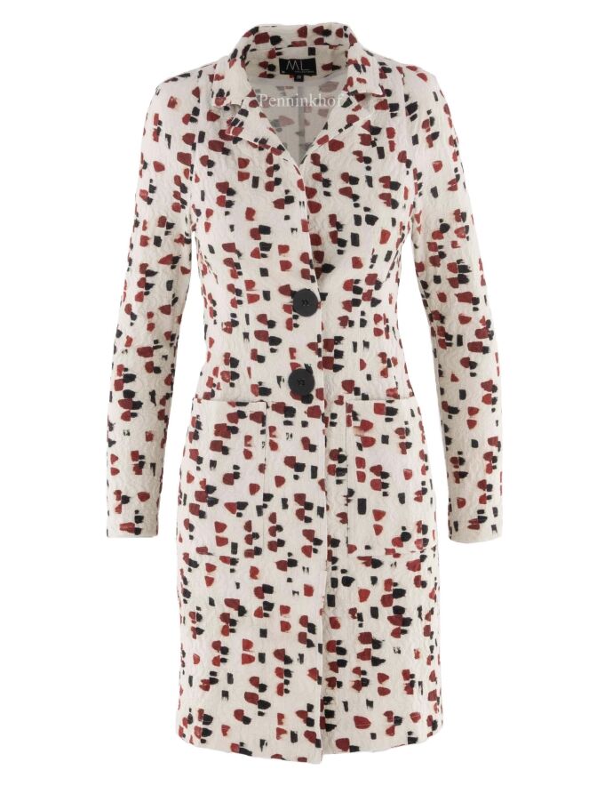 Veste longue de la marque ML Collections, à motif de touches de couleur rouille et noir sur un fond blanc crème. La veste ferme à l'aide de deux gros boutons noirs. Elle est dotée de poches plaquées à l'avant. Ce modèle n'est pas doublé et ne doit pas être lavé.