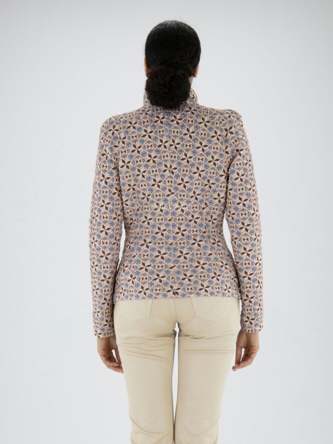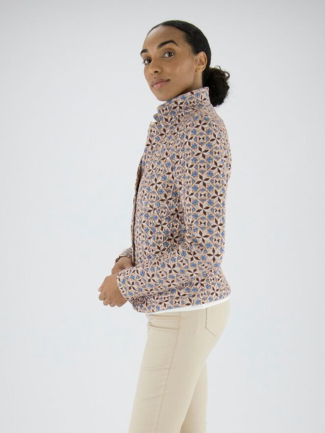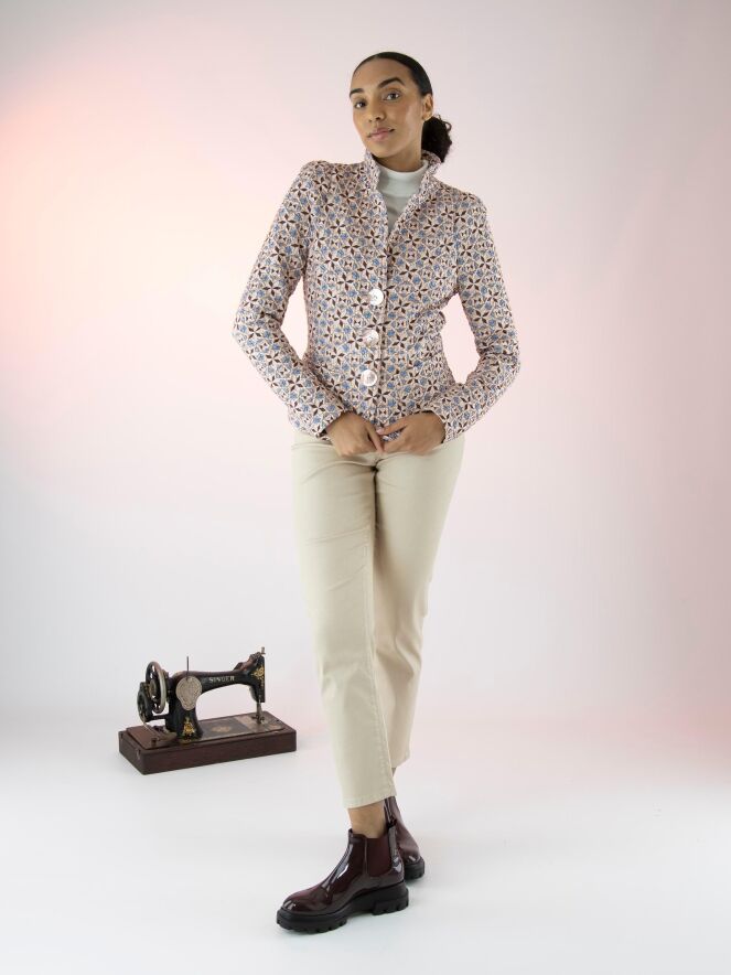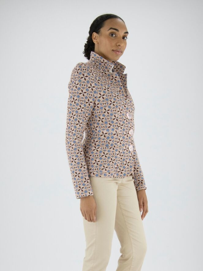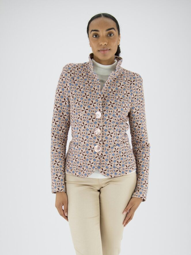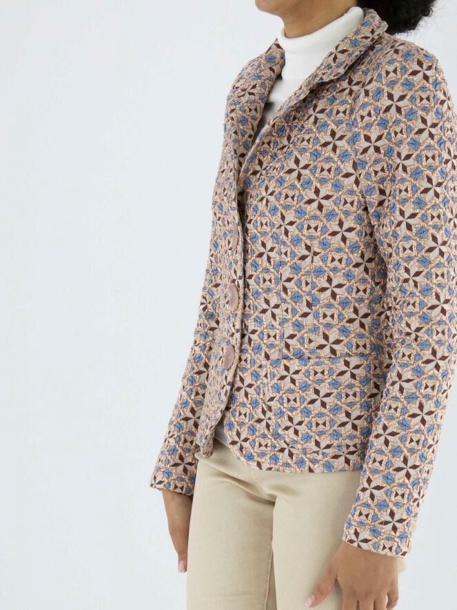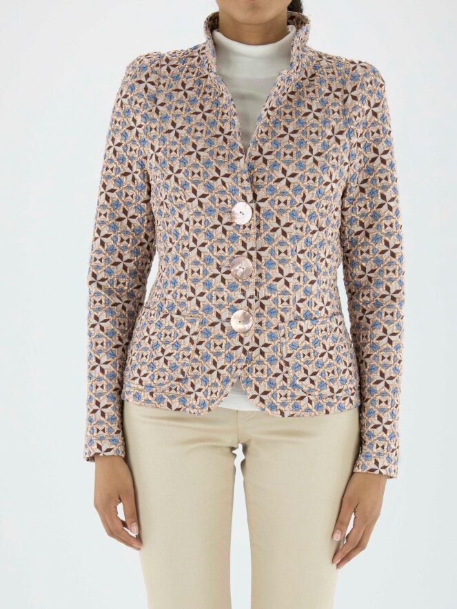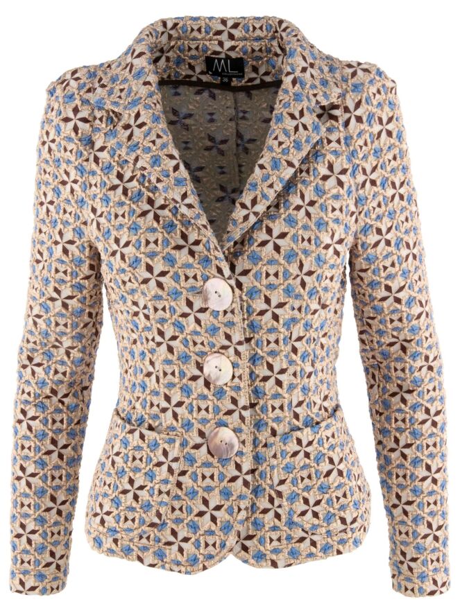 Une veste de ML Collections avec un imprimé mosaïque gaufré comprenant du cuivre, du bleu, du blanc crème et du marron foncé. La veste se ferme par 3 boutons et n'est pas doublée. Ce blazer ne doit pas être lavé.