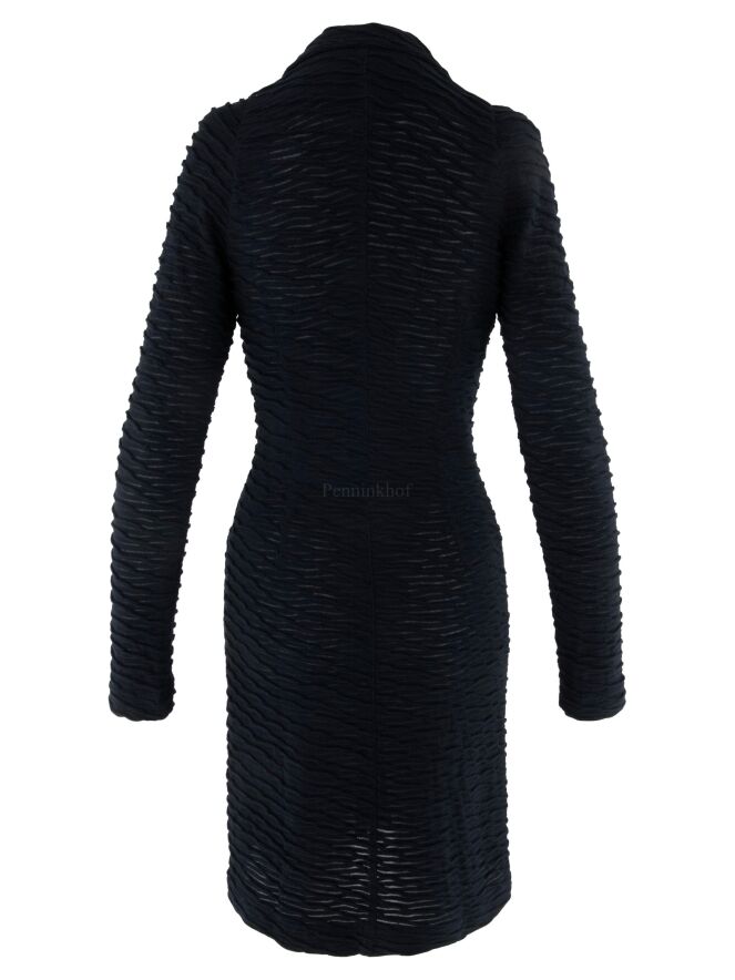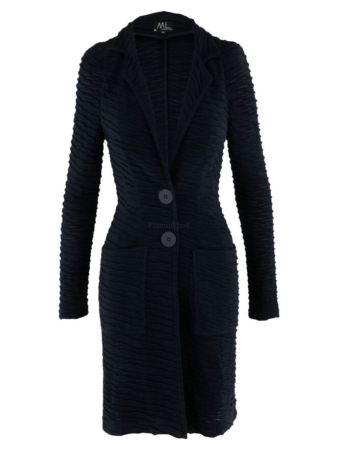 Un long blazer de ML Collections dans une structure gaufrée à rayures ondulées légèrement transparente dans un coloris noir. La veste se ferme par deux boutons et n'est pas doublée. Ce blazer ne doit pas être lavé.