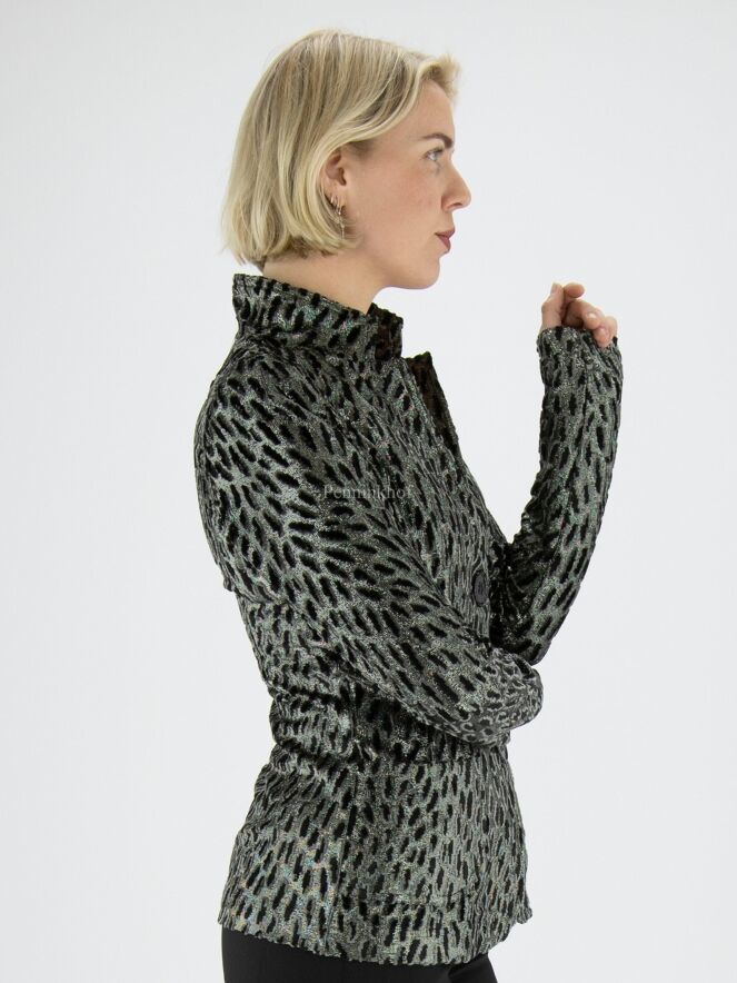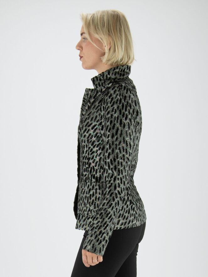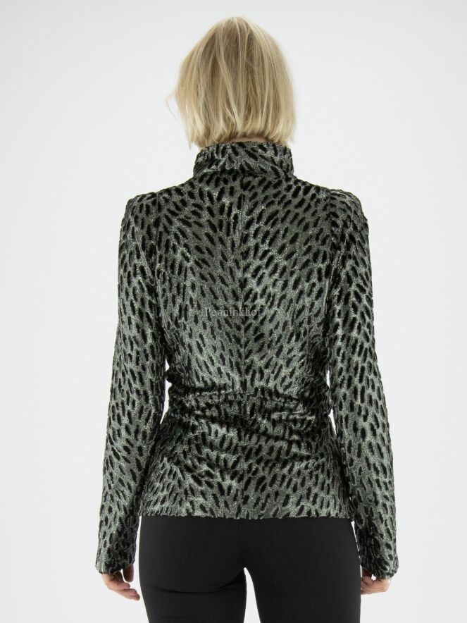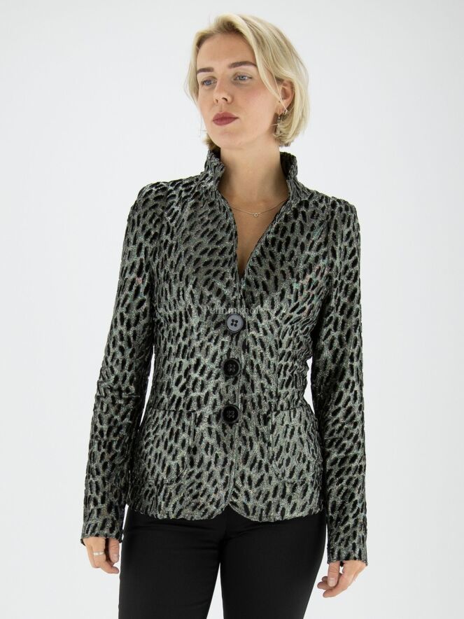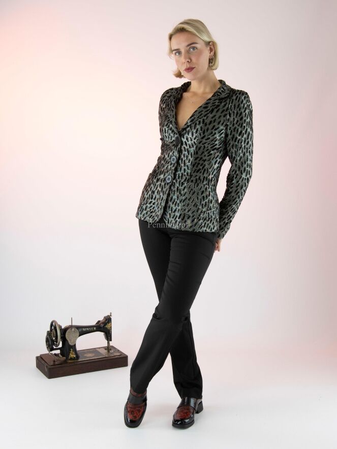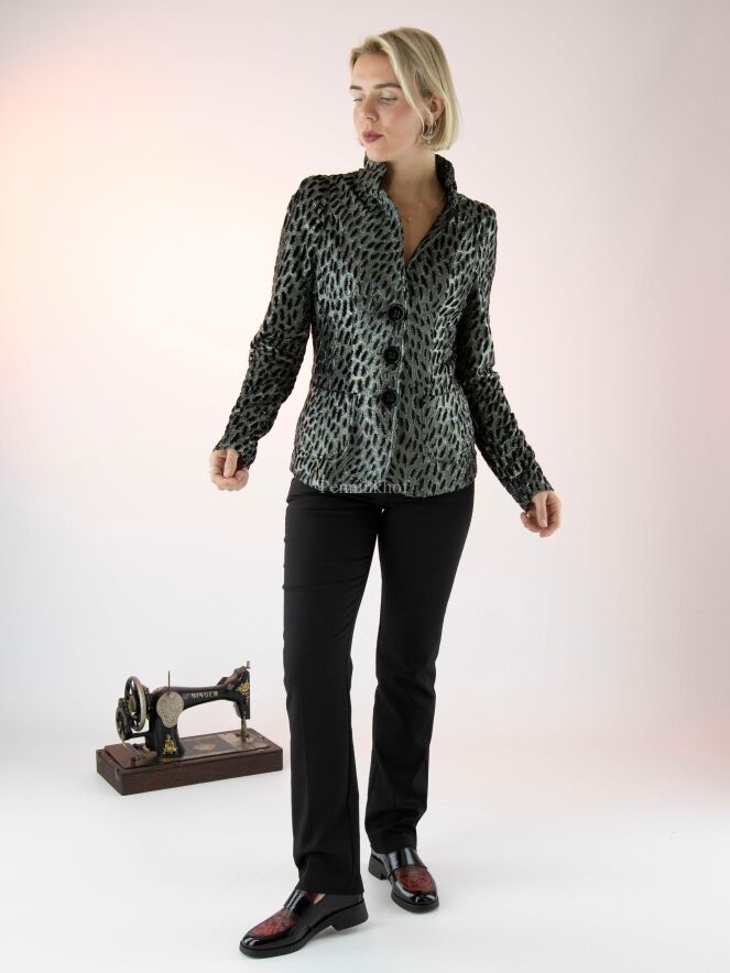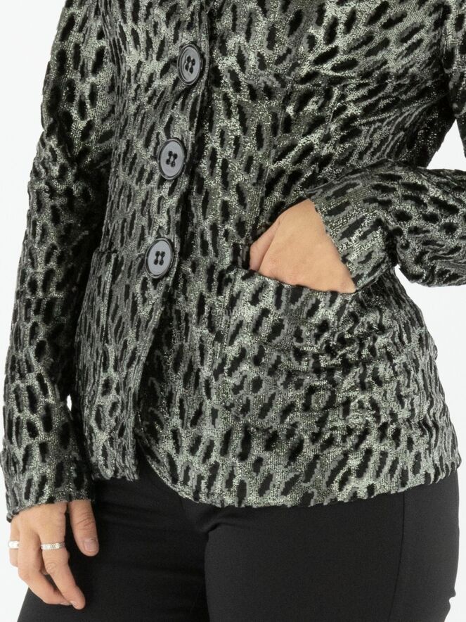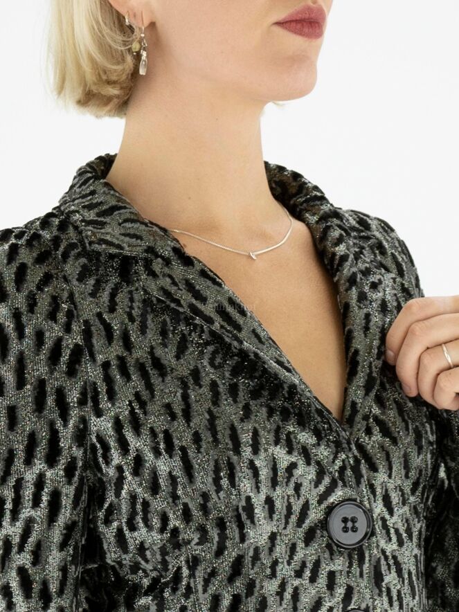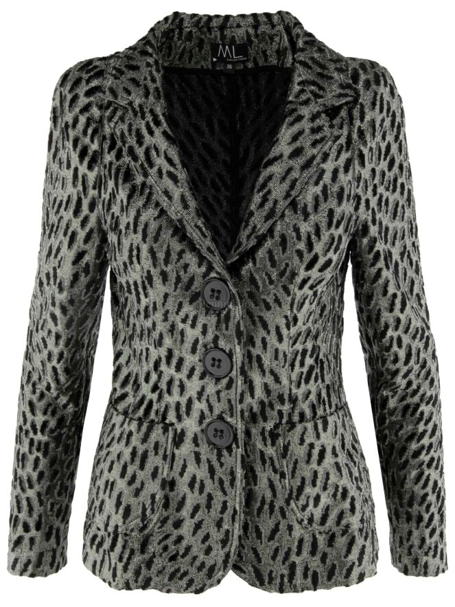 Une veste de ML Collections dans un imprimé léopard avec du velours argenté, noir et gris clair. Le blazer a une fermeture à 3 boutons et n'est pas doublé. Ce blazer ne doit pas être lavé.