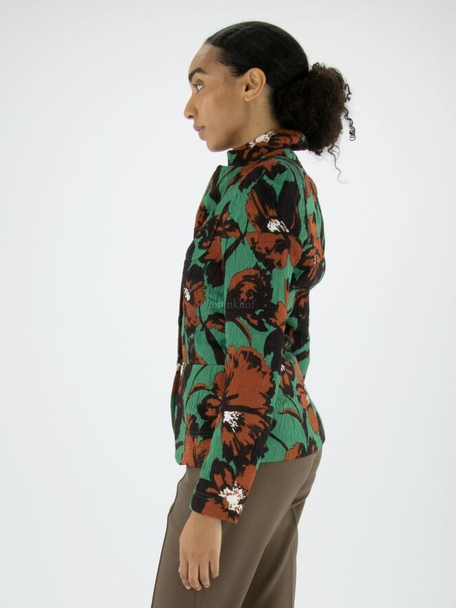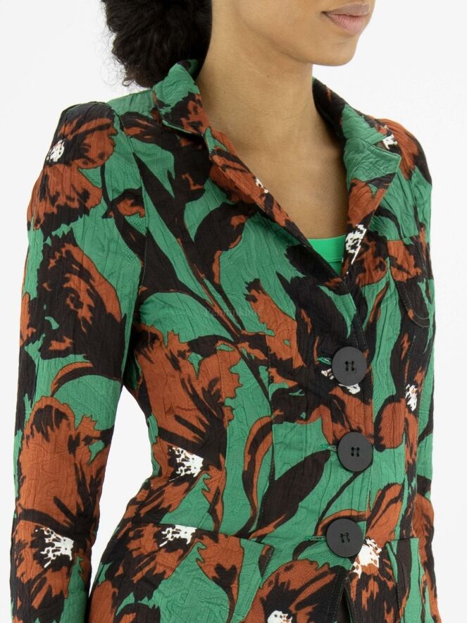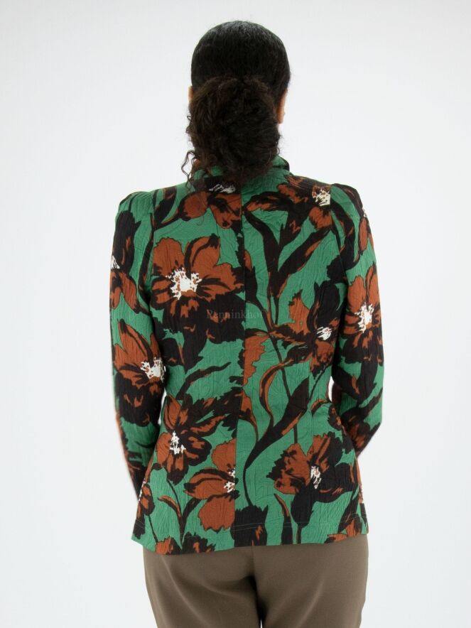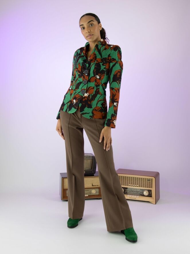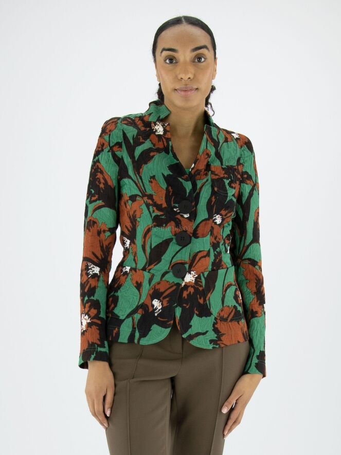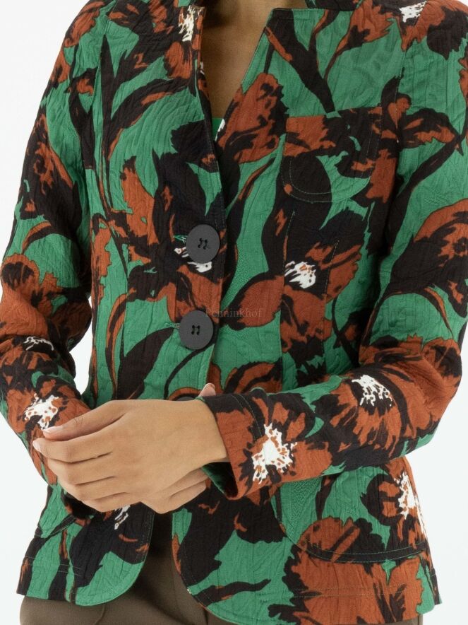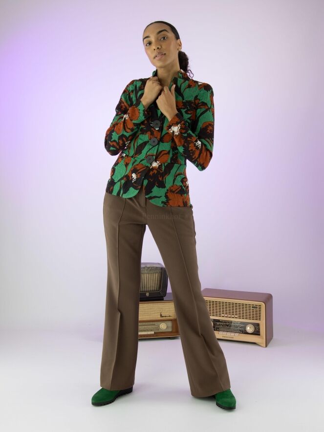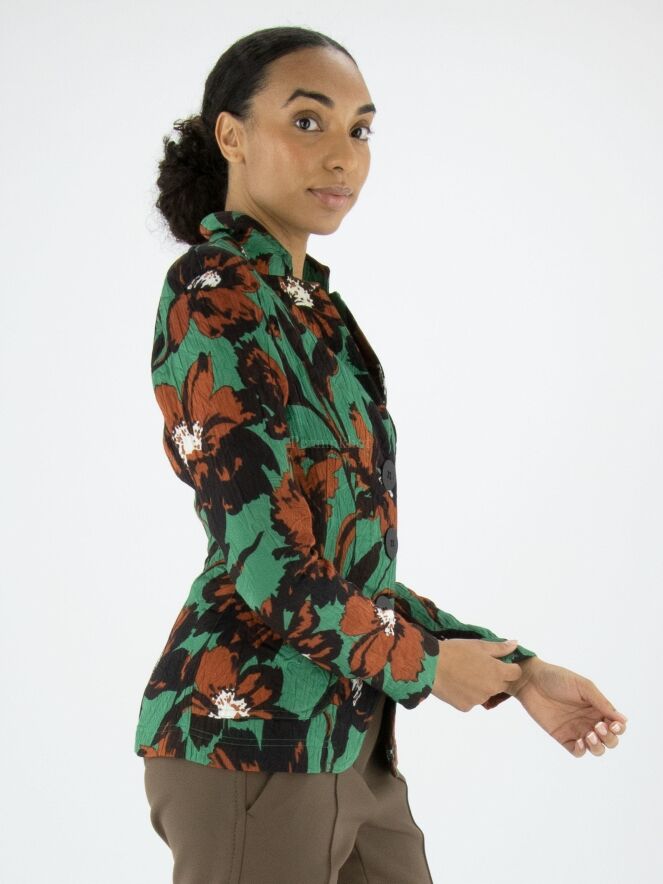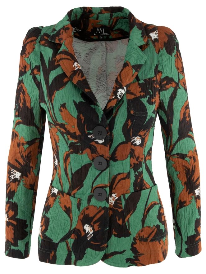 Un blazer de ML Collections avec un imprimé de feuilles graphiques aux couleurs vert, cognac et noir. Le blazer se ferme par 3 boutons et n'est pas doublé. Ce blazer ne doit pas être lavé.