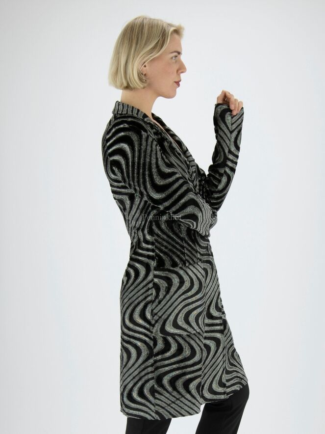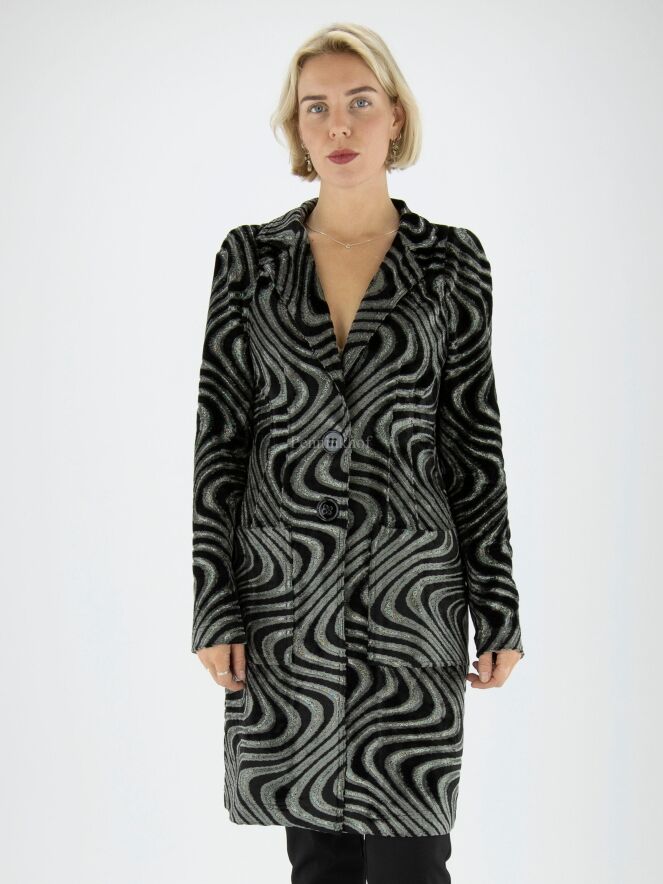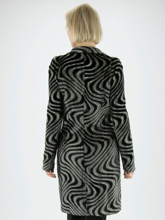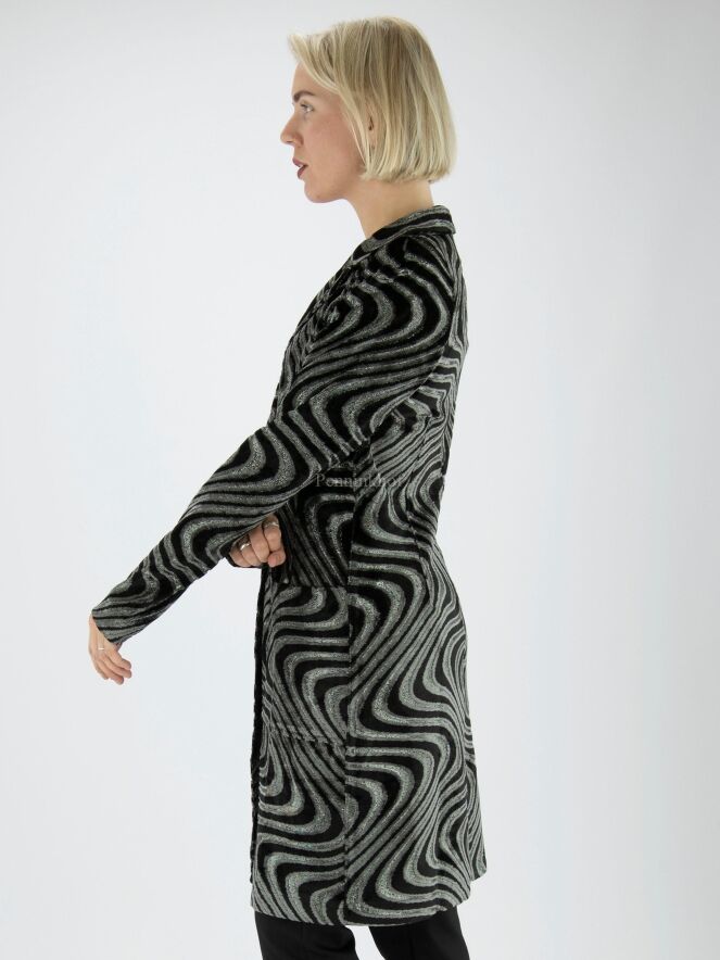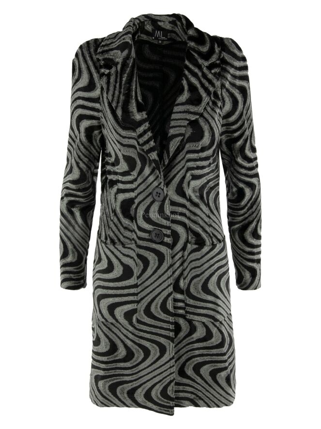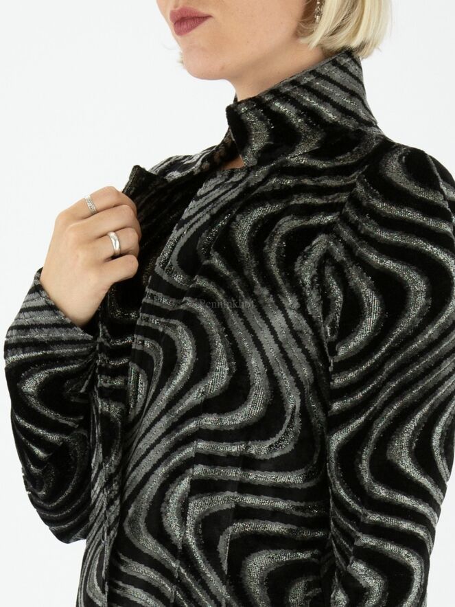 Une veste longue de ML Collections avec un imprimé ondulé en velours argenté, noir et gris clair. La veste se ferme par deux boutons et n'est pas doublée. Ce blazer ne doit pas être lavé.