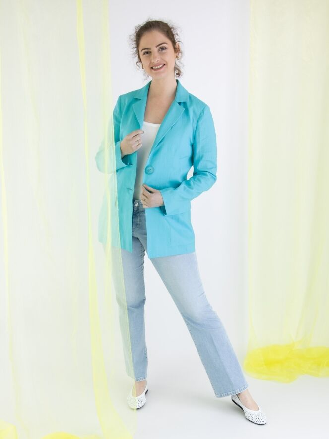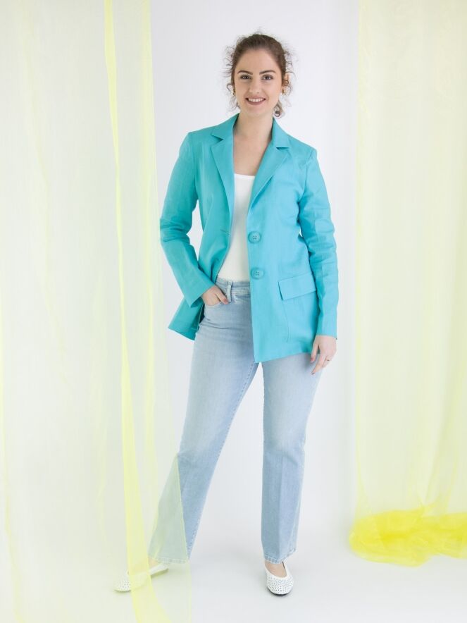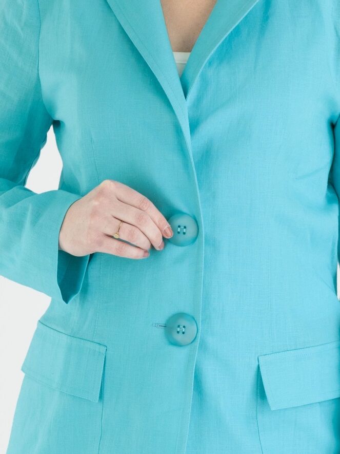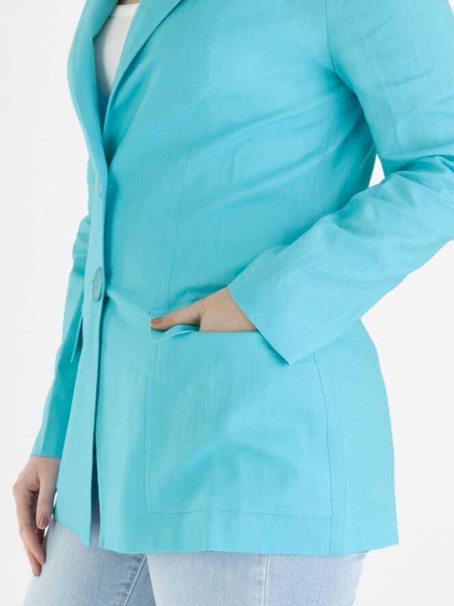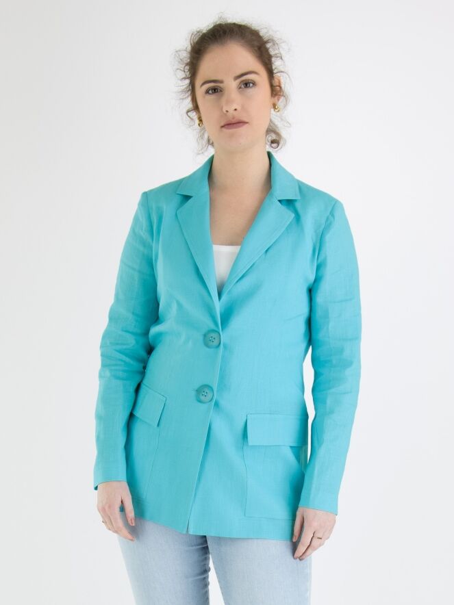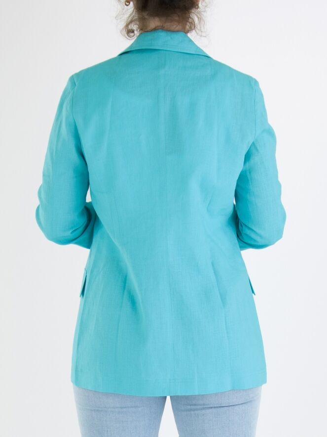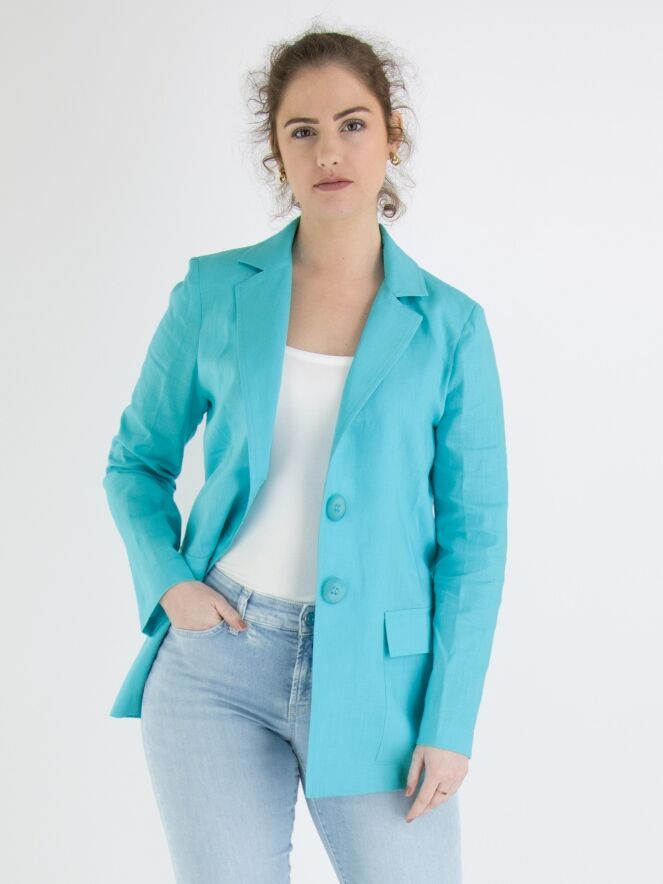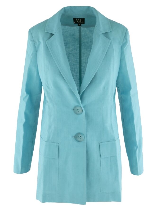 Un blazer de ML Collections en couleur turquoise. Le blazer a une fermeture à 2 boutons et n'est pas doublé. Ce blazer ne doit pas être lavé.