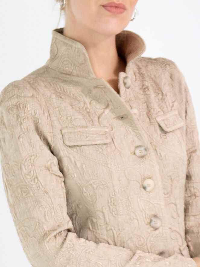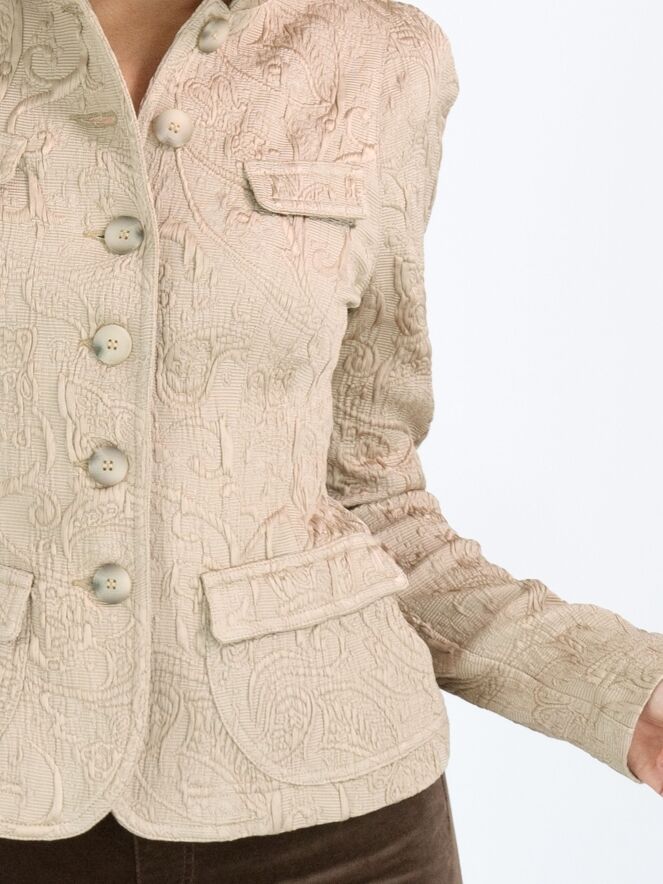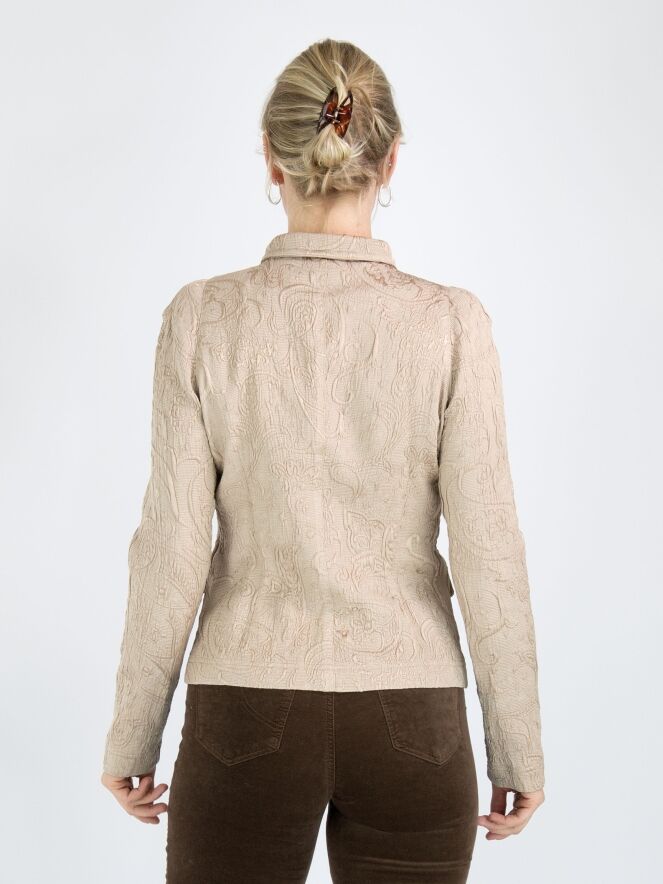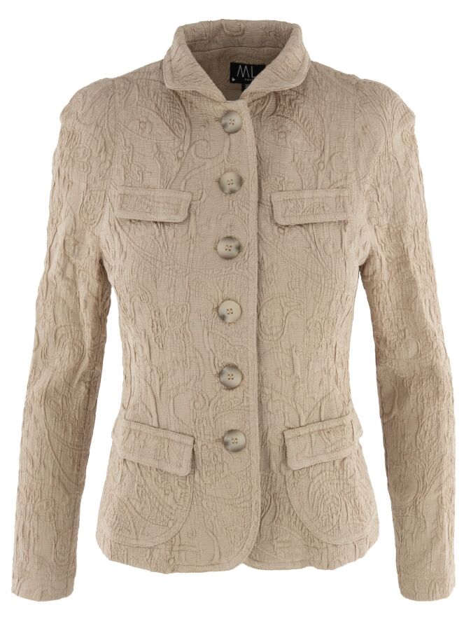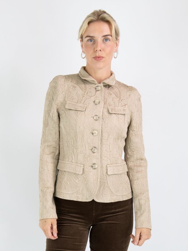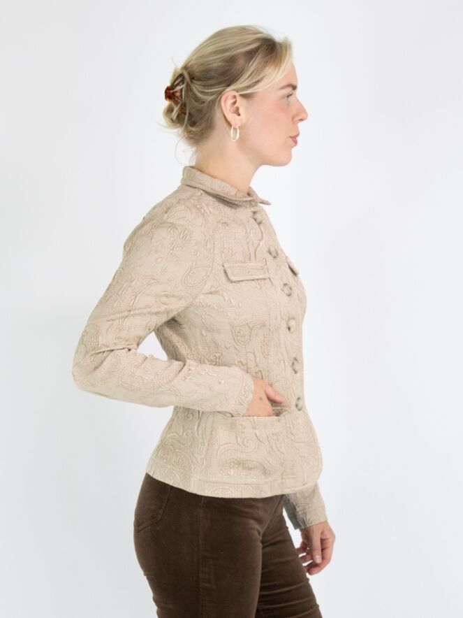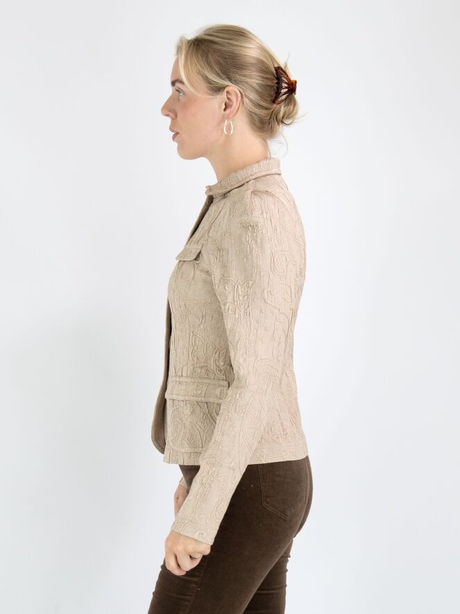 Un blazer de ML Collections avec un motif baroque sur une structure côtelée en couleur pastel camel. Le blazer a une fermeture à cinq boutons et n'est pas doublé. Ce blazer ne doit pas être lavé.