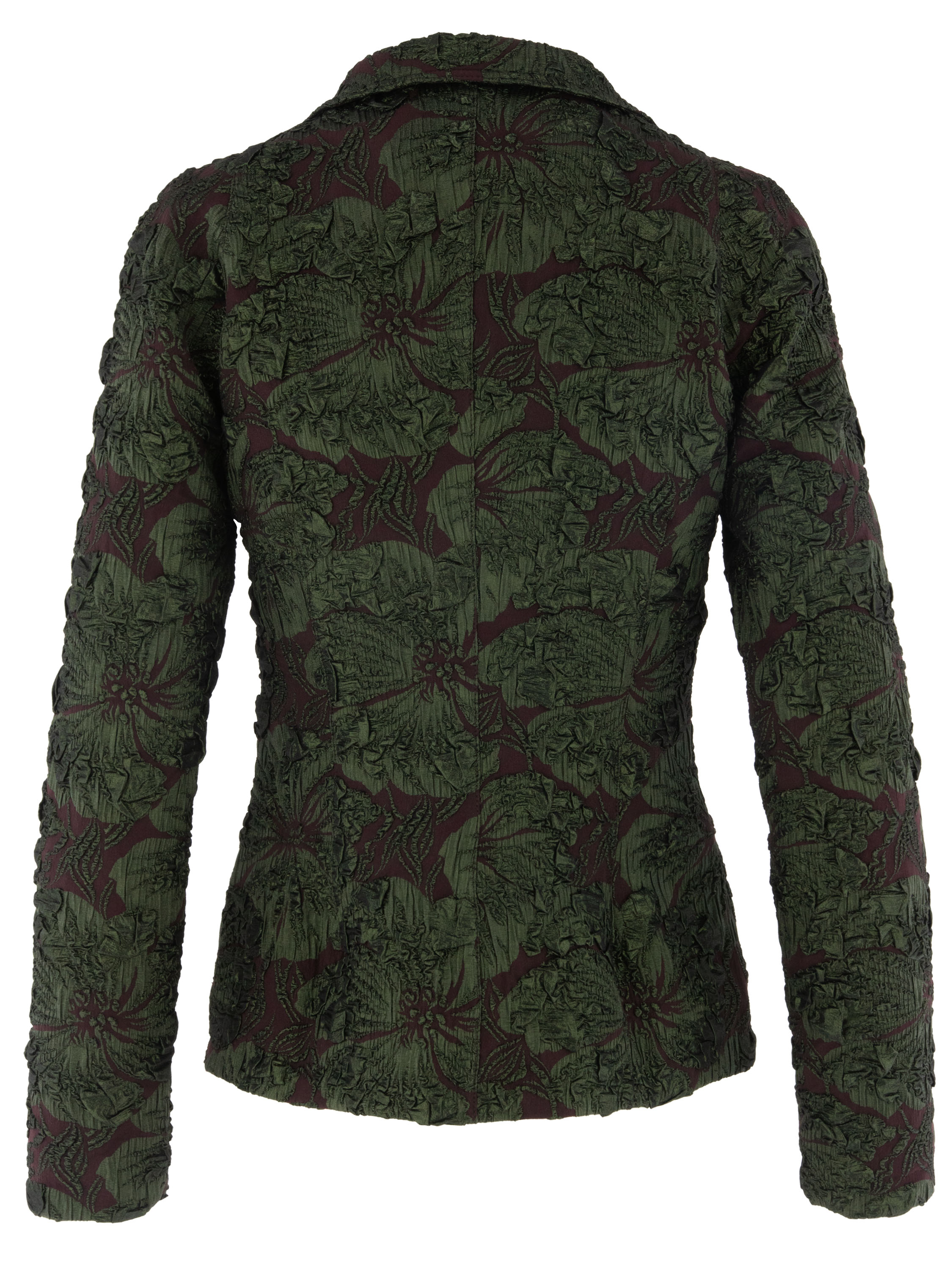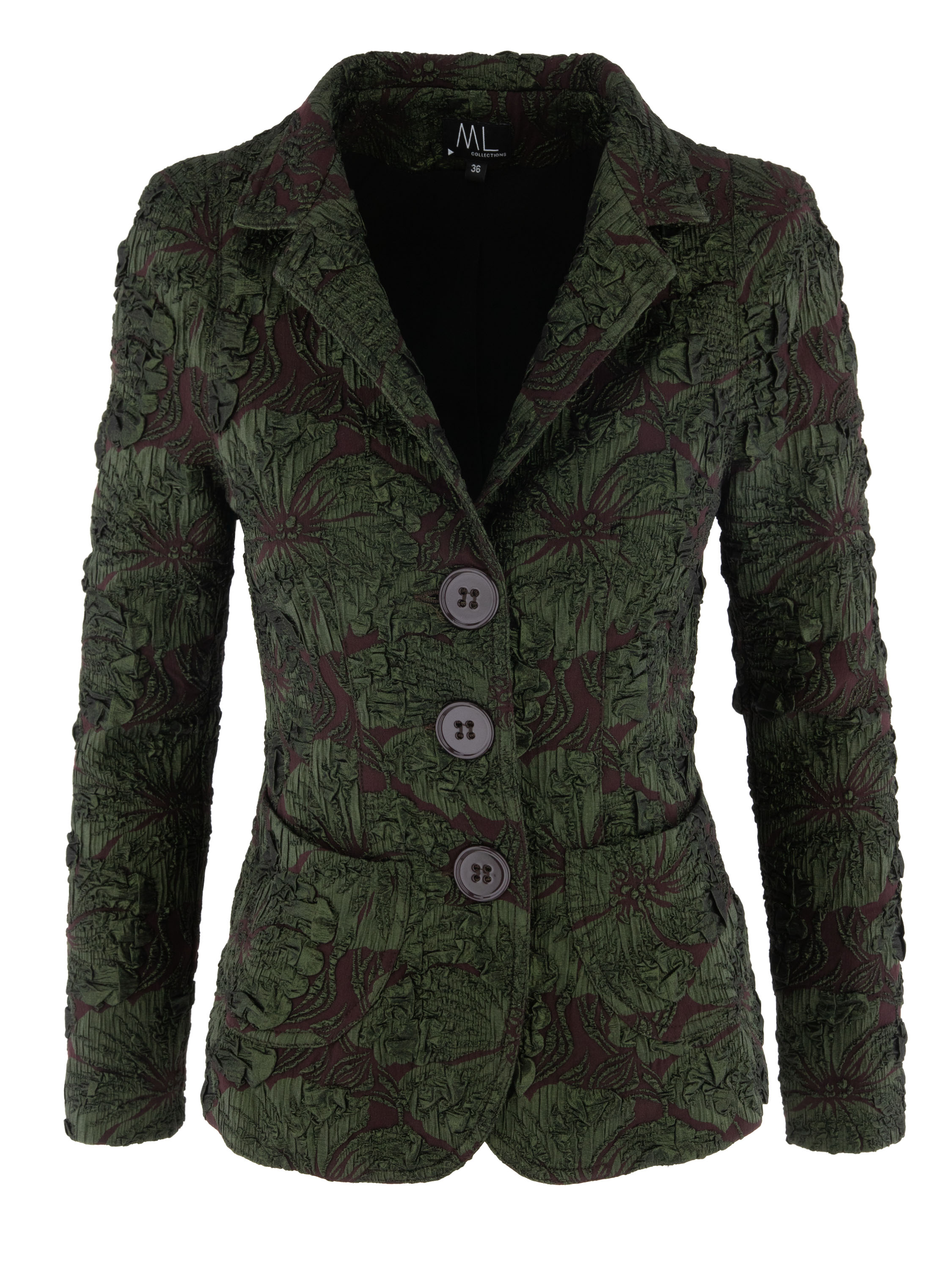 Un blazer luxueux de ML Collections en tissu avec un motif floral vert en relief, légèrement brillant sur une base noire mate. Le blazer a une fermeture à trois boutons et n'est pas doublé. Ce blazer ne doit pas être lavé.